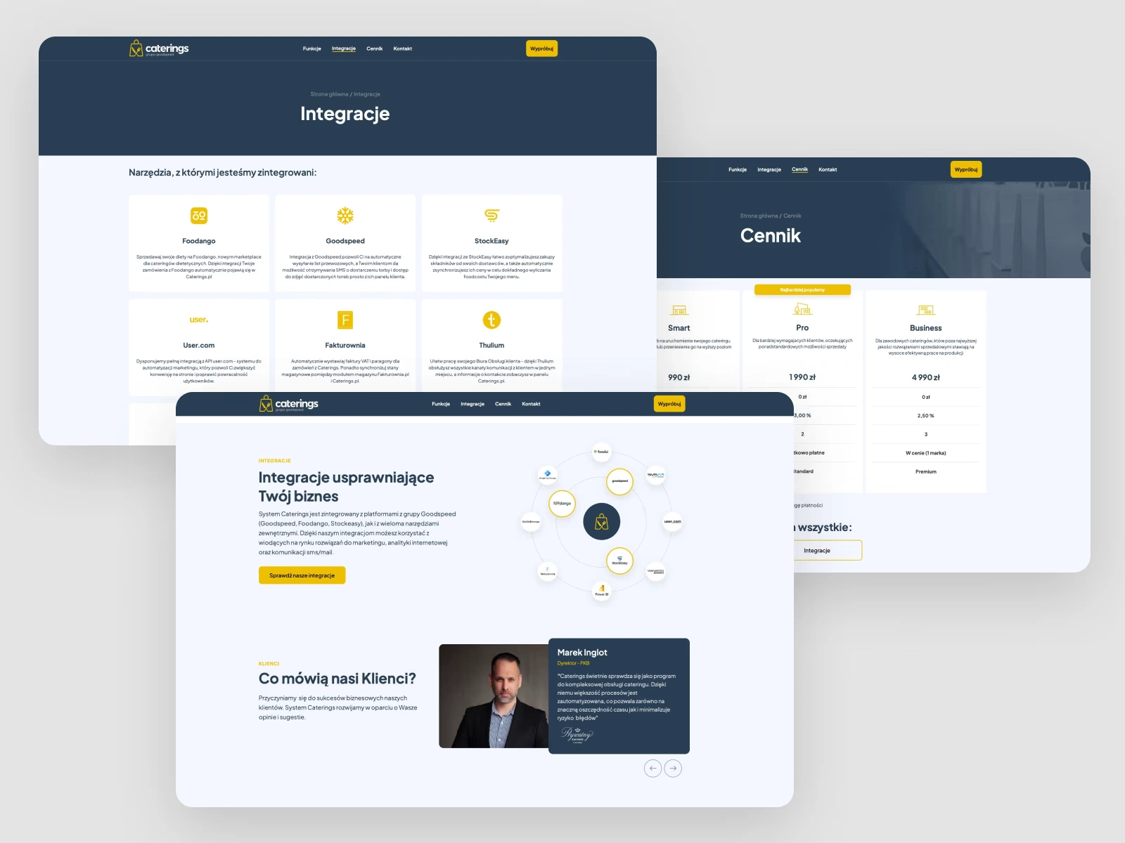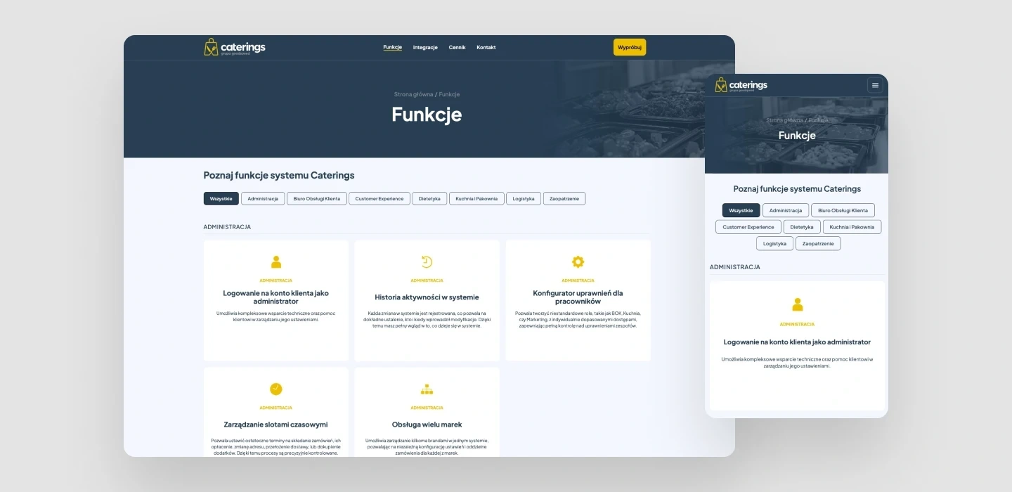 Caterings.pl website was transformed into a clear, modern, and high-performing platform overview. The design was strategically adapted to present complex features in a visually approachable way—using modular sections, bold data points, iconography, and clean layouts that segment technical content into understandable chunks. Custom interactions and layout refinements were implemented to improve user flow, while consistent visual language reinforced credibility and brand trust. The result is a polished, responsive website that communicates depth without clutter, drives demo requests, and supports future scalability—all achieved without compromising on performance or user clarity.