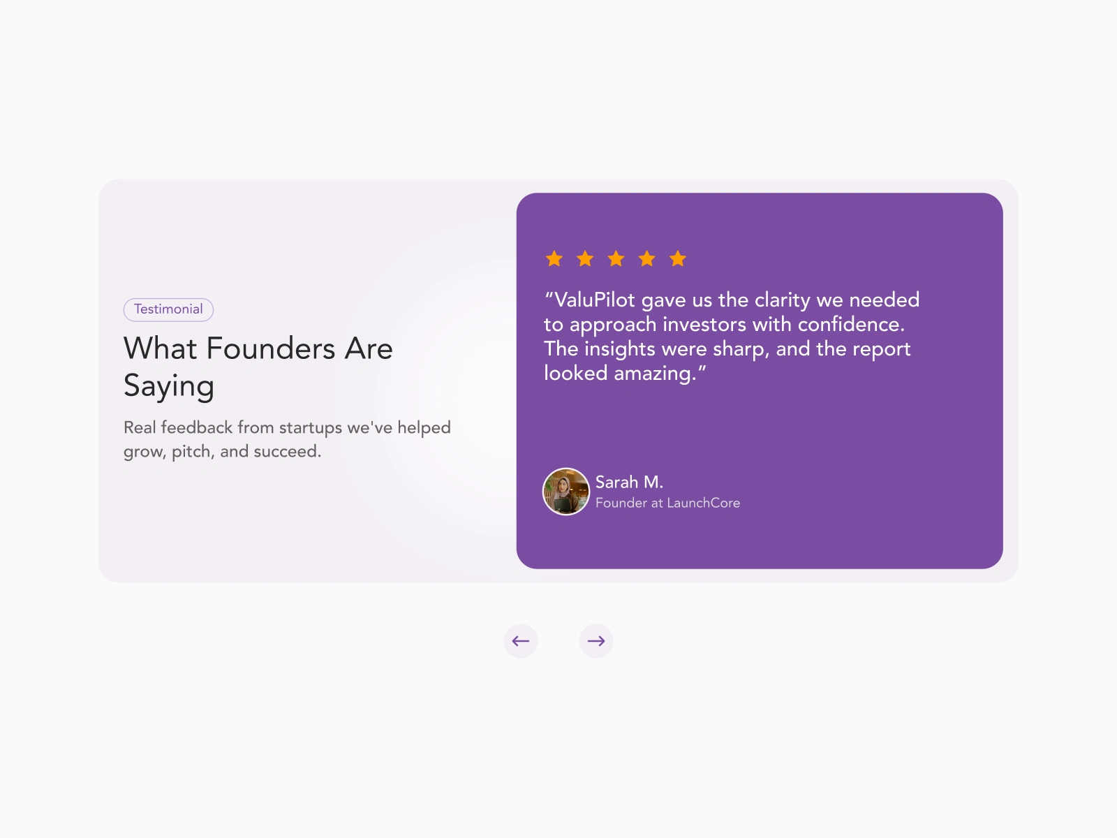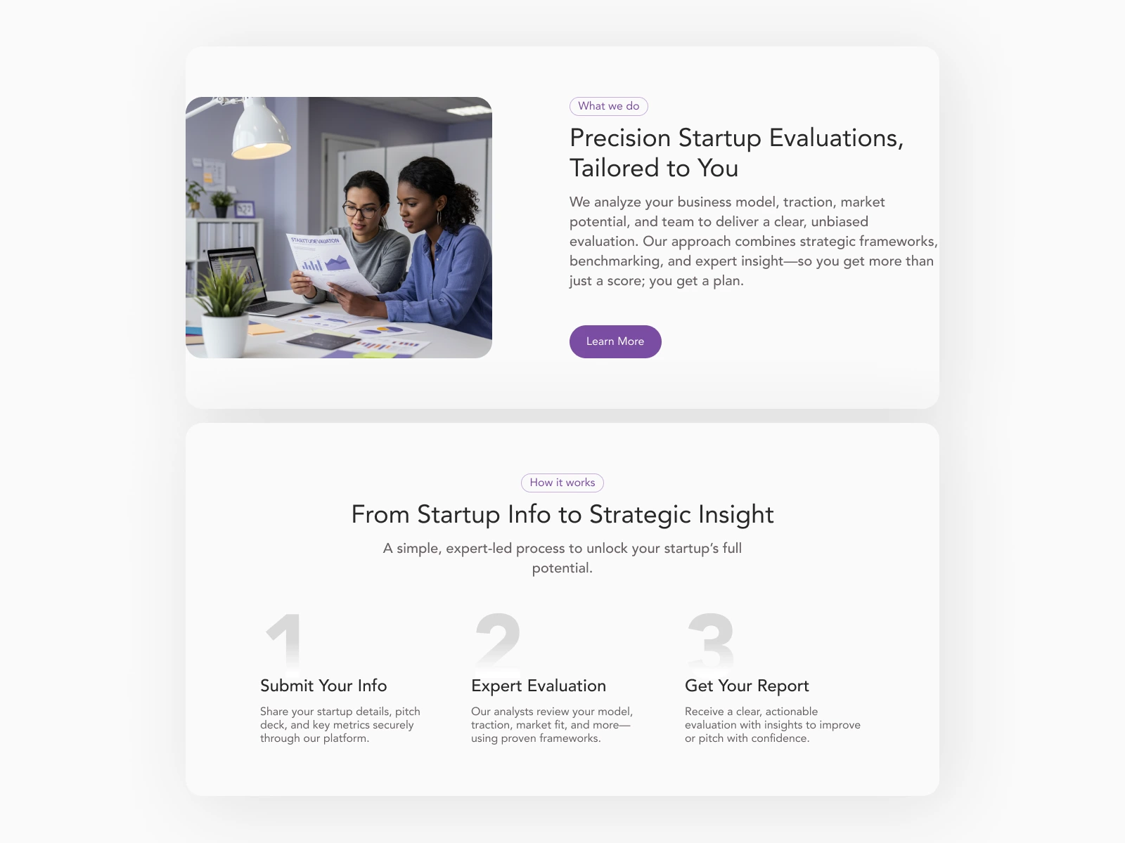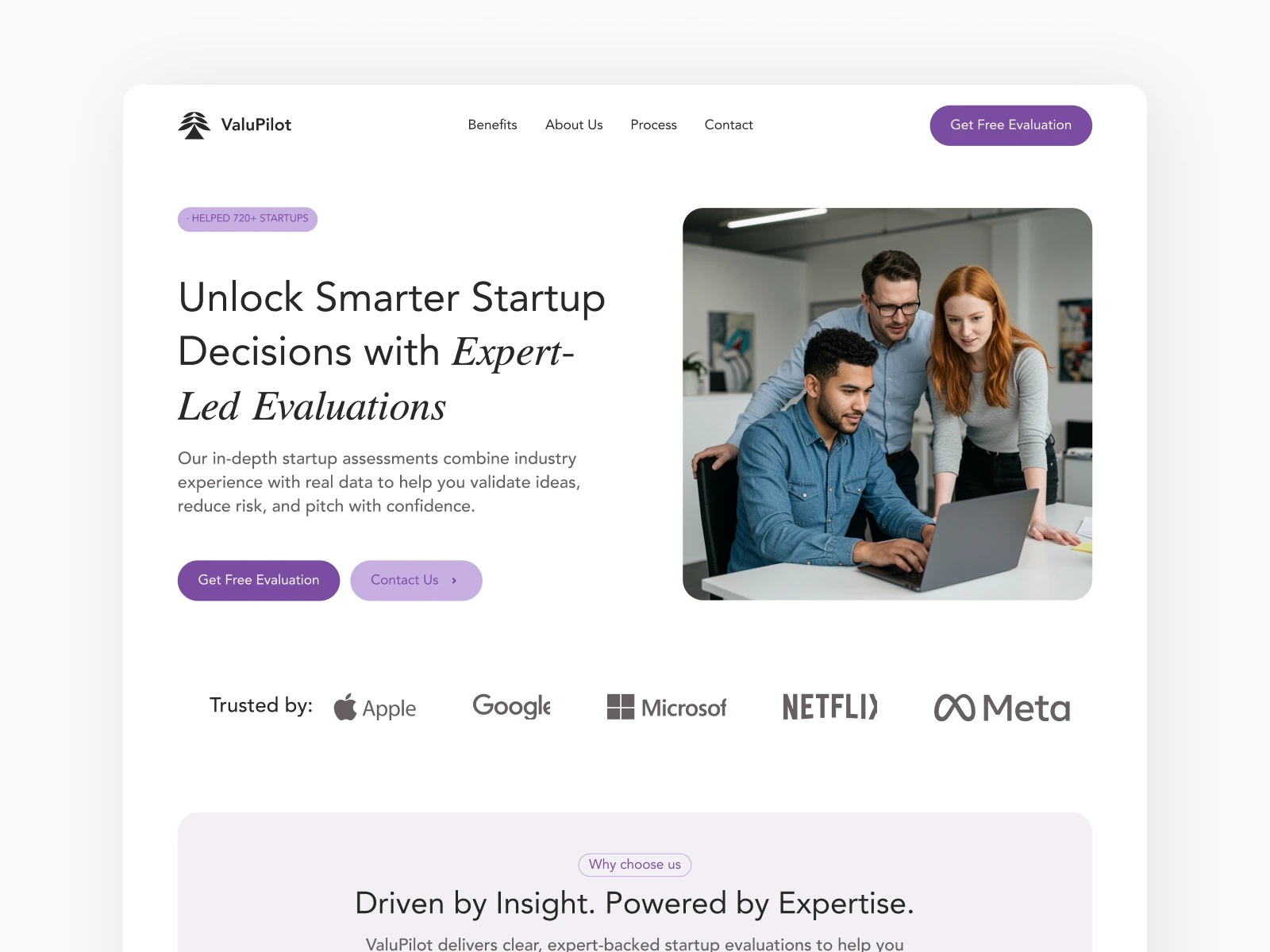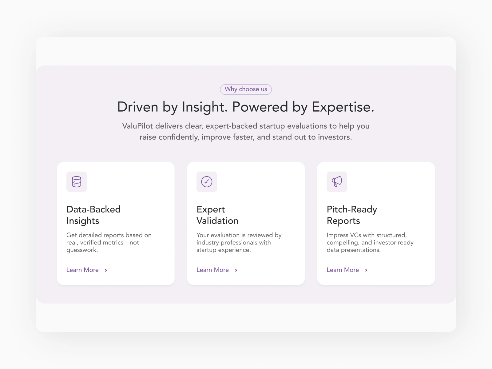 ValuPilot is a modern evaluation service aimed at helping startups showcase their potential to investors with clarity and confidence. The goal was to design a sleek, trustworthy, and data-driven landing page that simplifies startup assessments through structured reports and visual storytelling. We focused on a clean layout using Purple and pastel purple tones to reflect innovation, professionalism, and approachability.