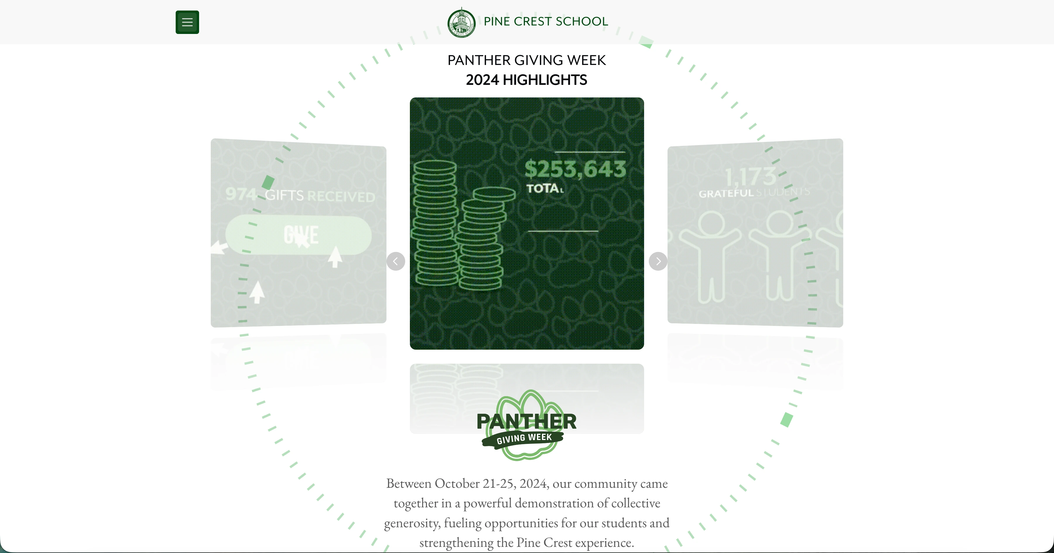 Carousel Component: Used to showcase Panther Giving Week highlights with smooth transitions between images.