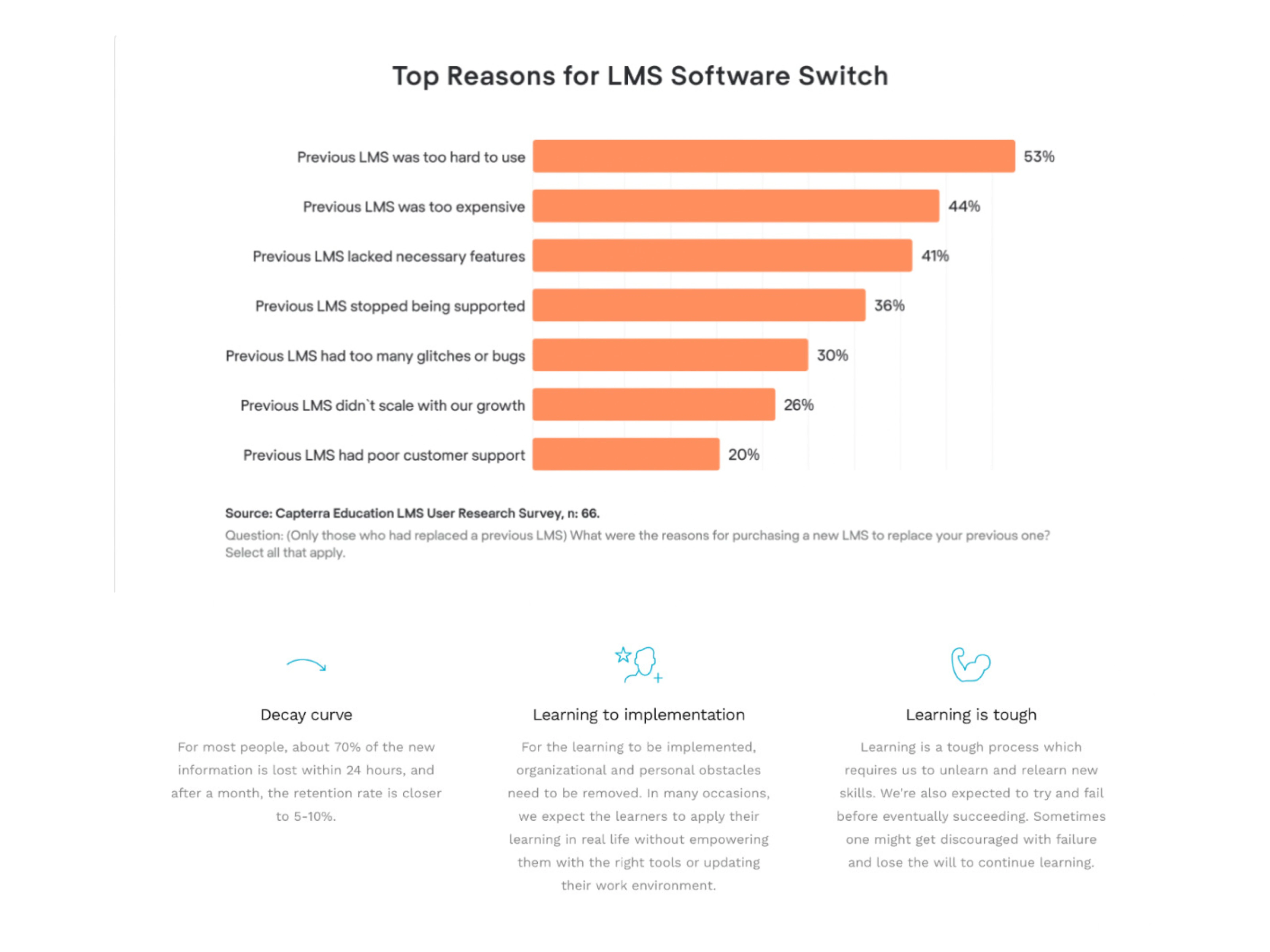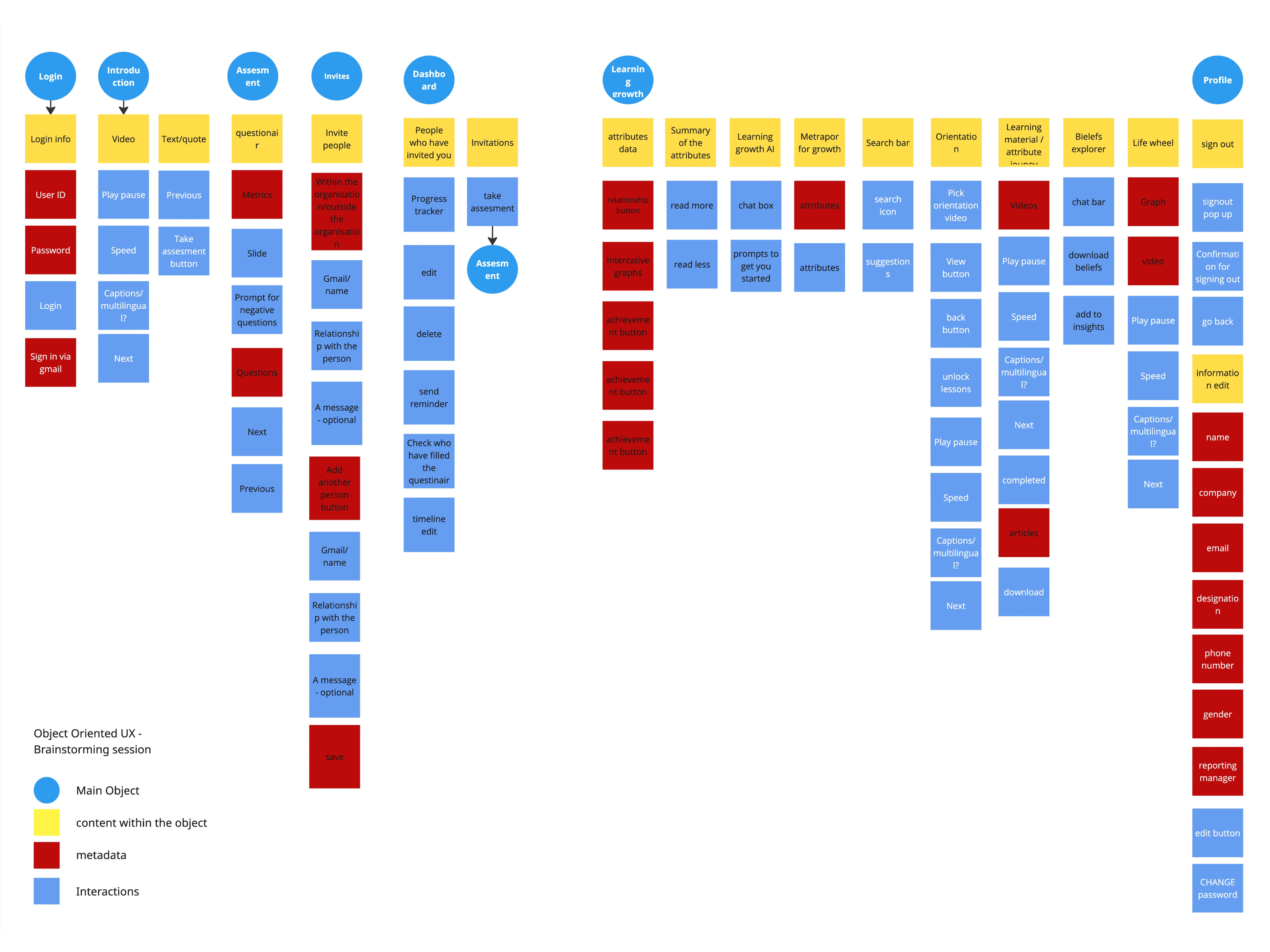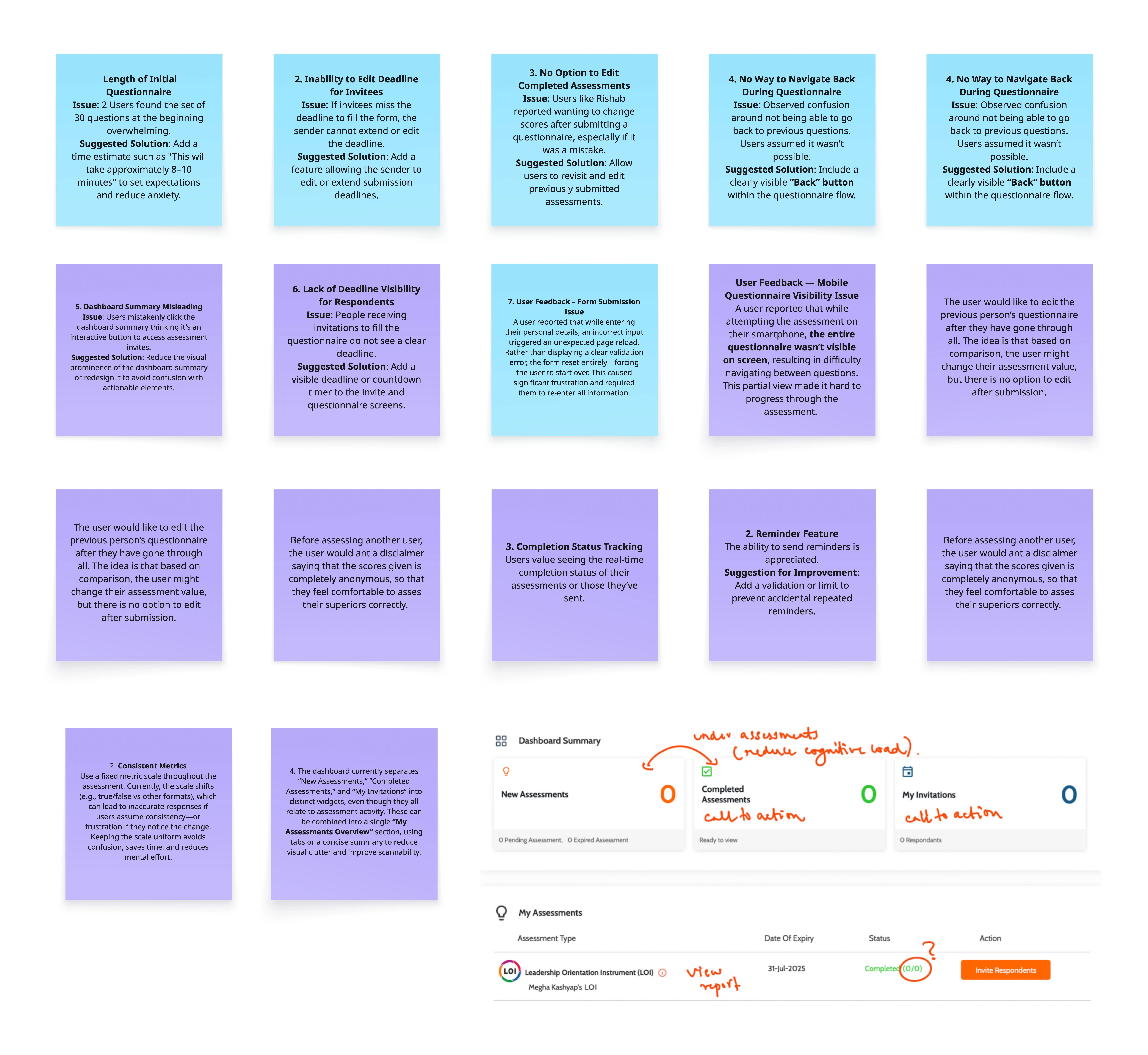 research revealed significant drop-off rates in traditional LMS platforms, primarily due to overwhelming complexity and cognitive overload. reported abandoning assessments midway through surveys, feeling intimidated by lengthy processes, and struggling to navigate between assessment completion, invitation management, and insight reviews. Additionally, participants expressed frustration with rigid workflows that didn't accommodate their need to edit responses, extend deadlines, or navigate backward through questions.