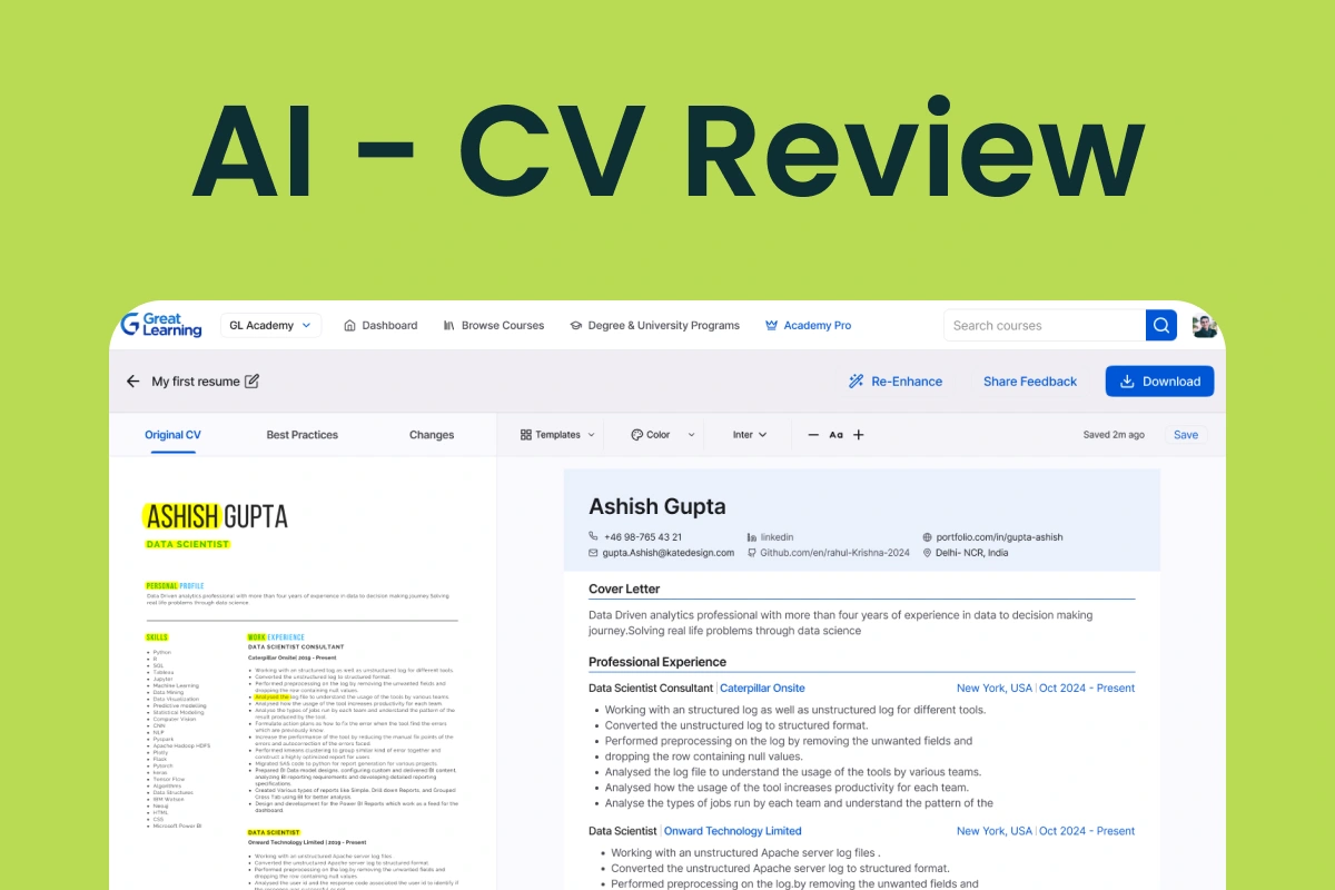 Project description. Designed Great Learning’s resume review experience using AI to improve quality, scalability, and learner satisfaction. Conducted research with 15 users across career stages. Introduced persona-based templates, inline feedback, confidence heatmaps, and ATS keyword matching. Reduced internal QA time by 70%, cut review time from 48 hrs to 10 minutes, and achieved 90%+ CSAT. Empowered users with actionable, emotionally aware resume support at scale.
