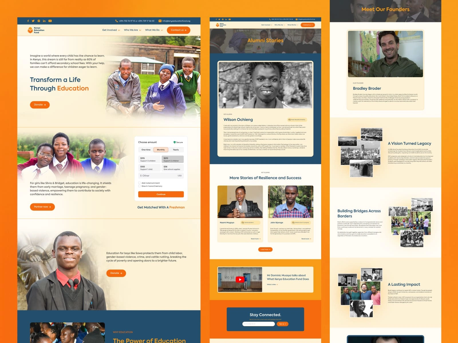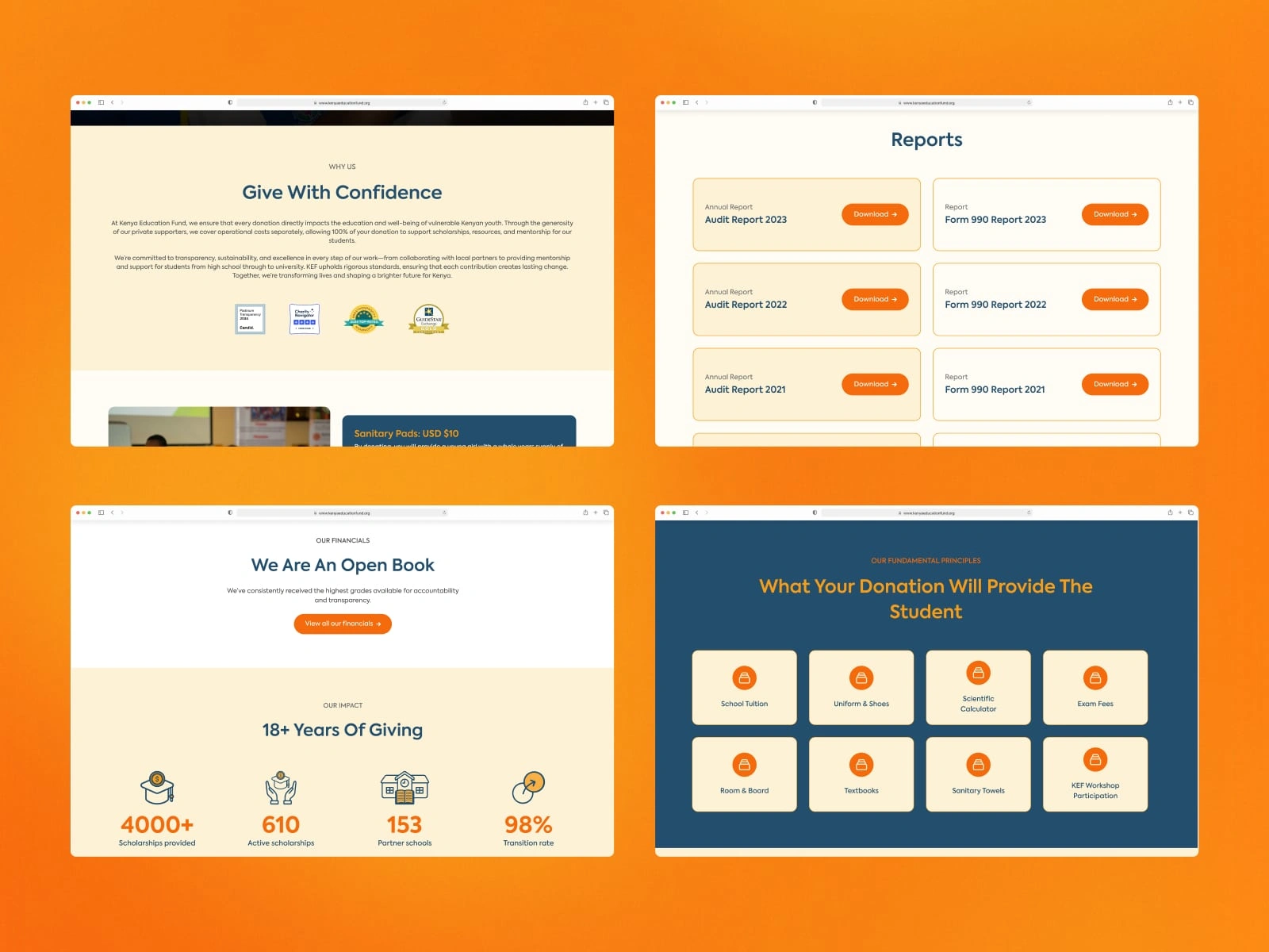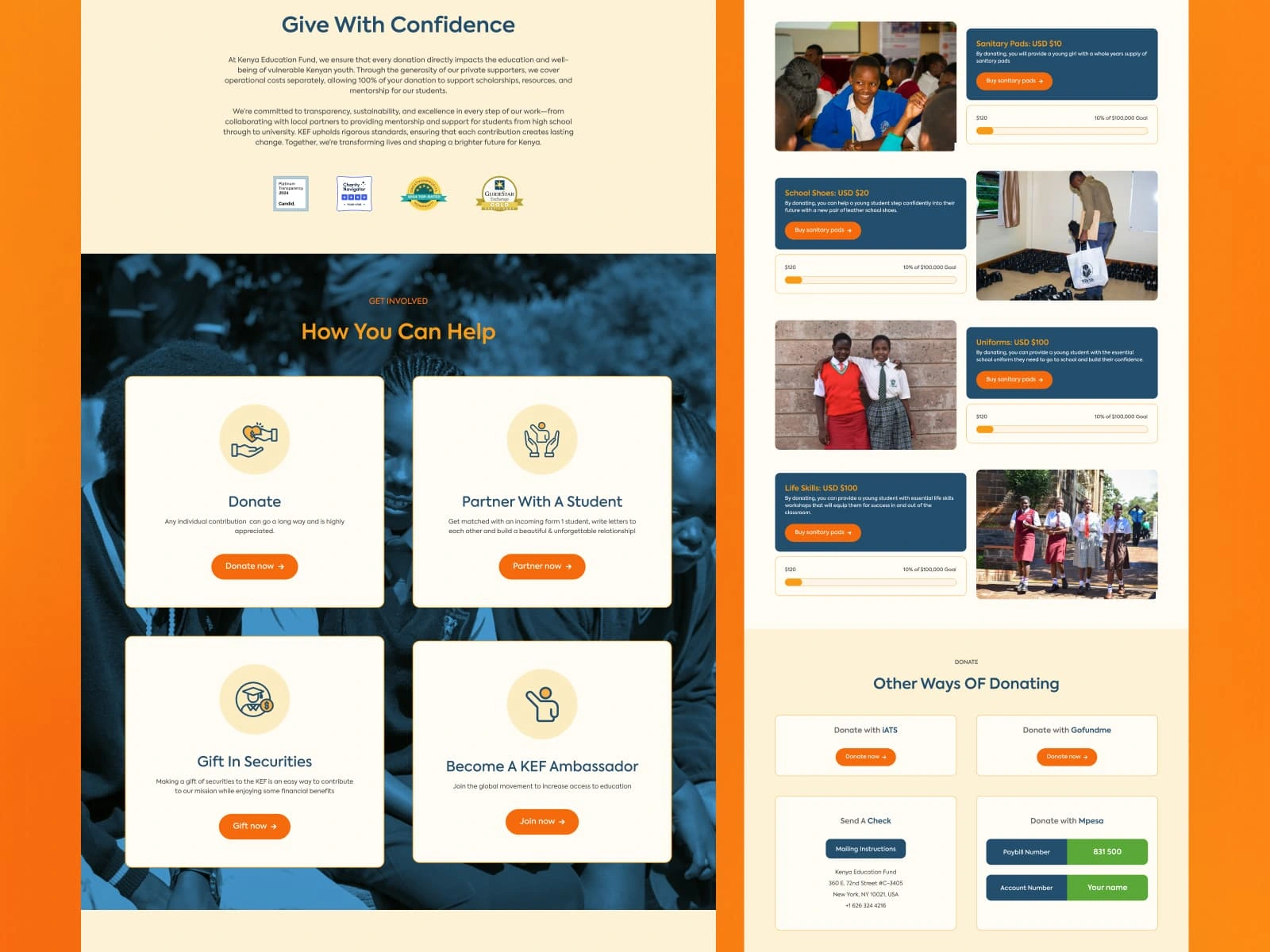 I redesigned the donation flow to be more visually compelling and goal-oriented. Major CTAs like "Donate" and "Partner with a Student" were repositioned for clarity. Fundraiser sections (e.g., for sanitary pads, school shoes, and uniforms) were restructured with progress bars and motivational visuals to encourage giving. I also improved the layout of payment channels: M-Pesa, Givebutter, iATS, GoFundMe, and checks, making the donation process smooth and user-friendly.