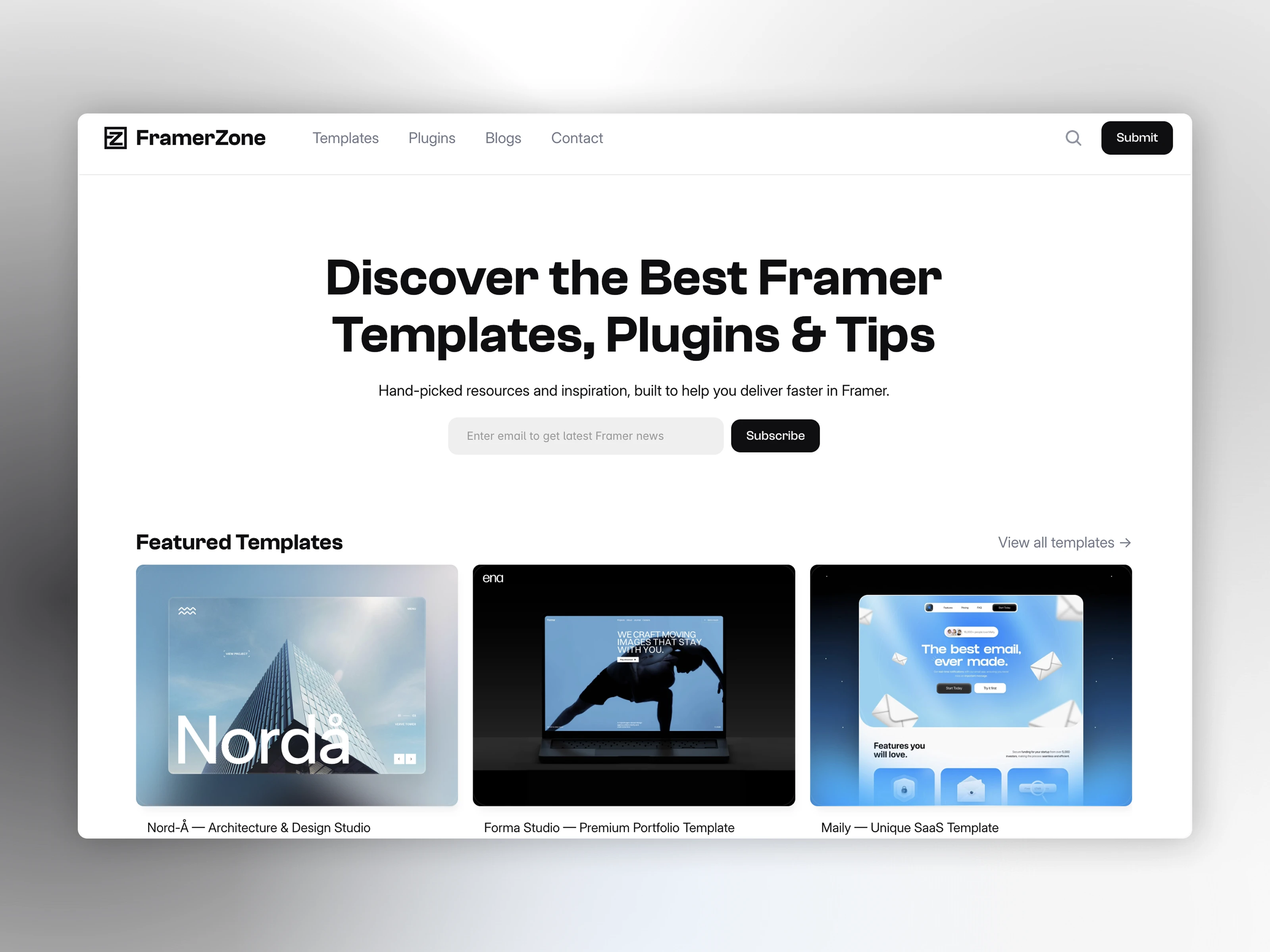 Framer.zone is a purpose-built directory website dedicated to the growing Framer community. As the Framer ecosystem expands, so does the need for a centralized, high-quality resource hub. Our goal was to design and develop a clean, fast, and user-friendly platform that surfaces the best Framer templates, plugins, tips, blogs, and learning resources—optimized for both human discovery and search engine visibility.