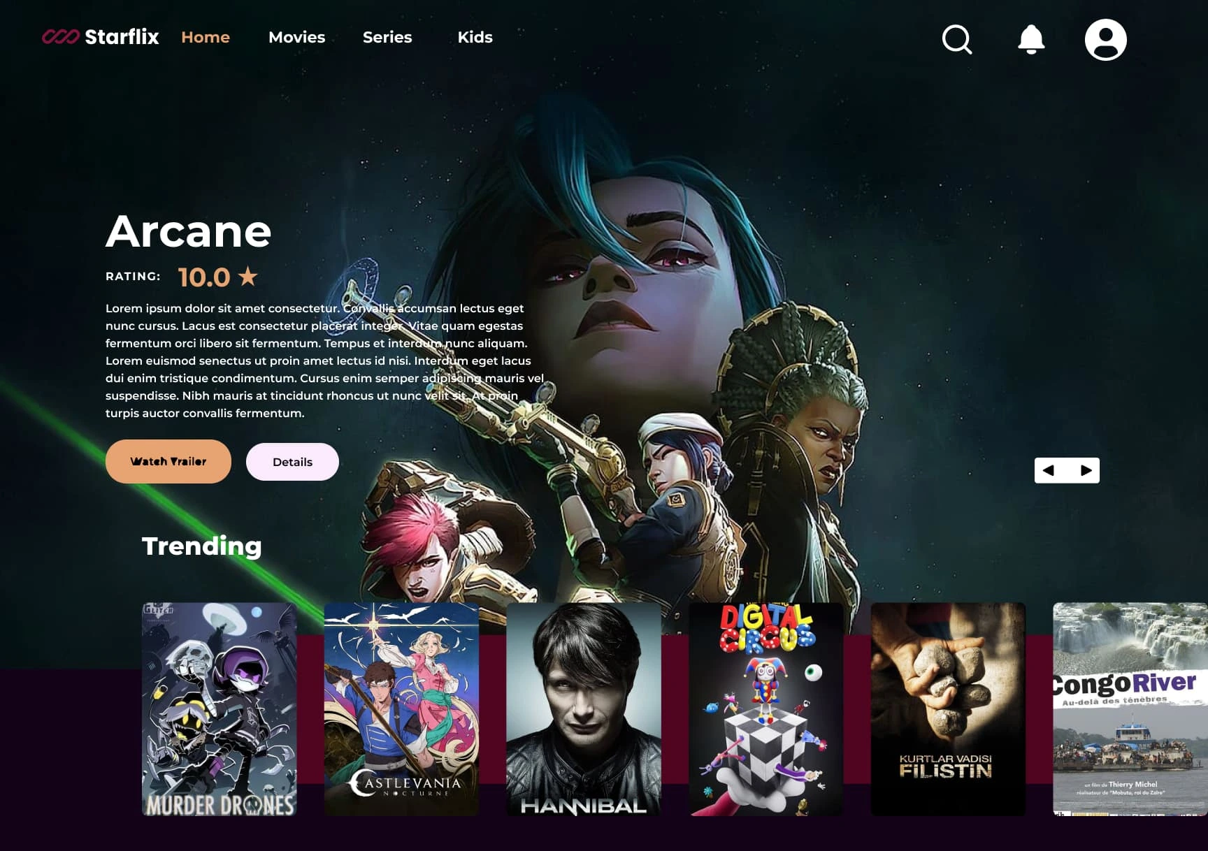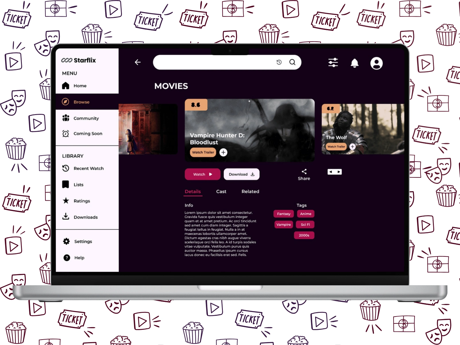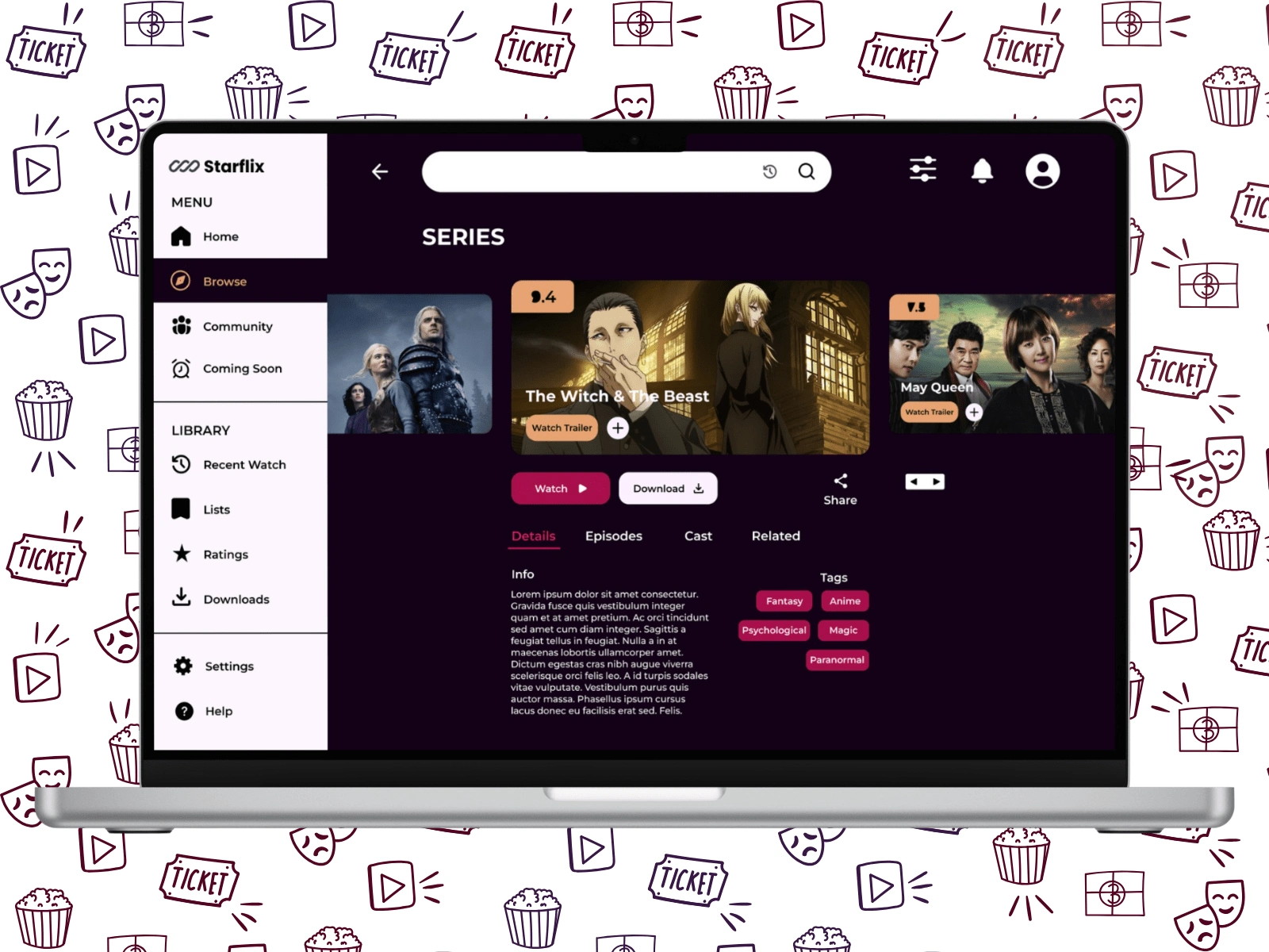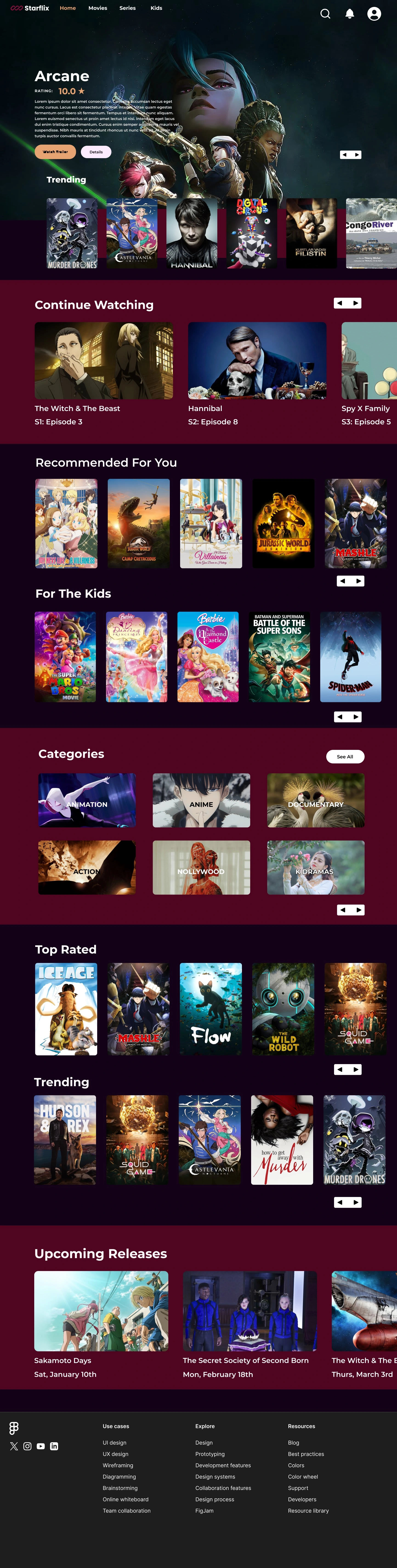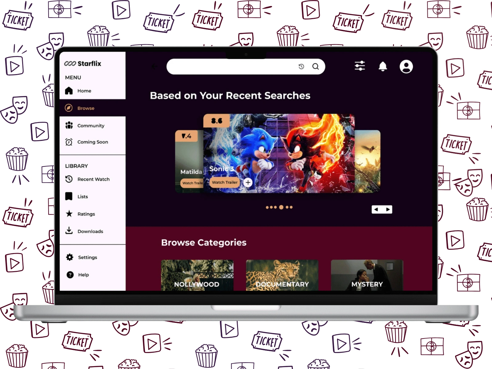 In this search page I brought a selection to main focus so the user can browse based on their recent searches. Each card shows the show's rating, and name, with an option to watch the trailer or add to a list. This helps users spend less time searching for something to watch, or getting bored when nothing comes to mind, meaning less frustration.