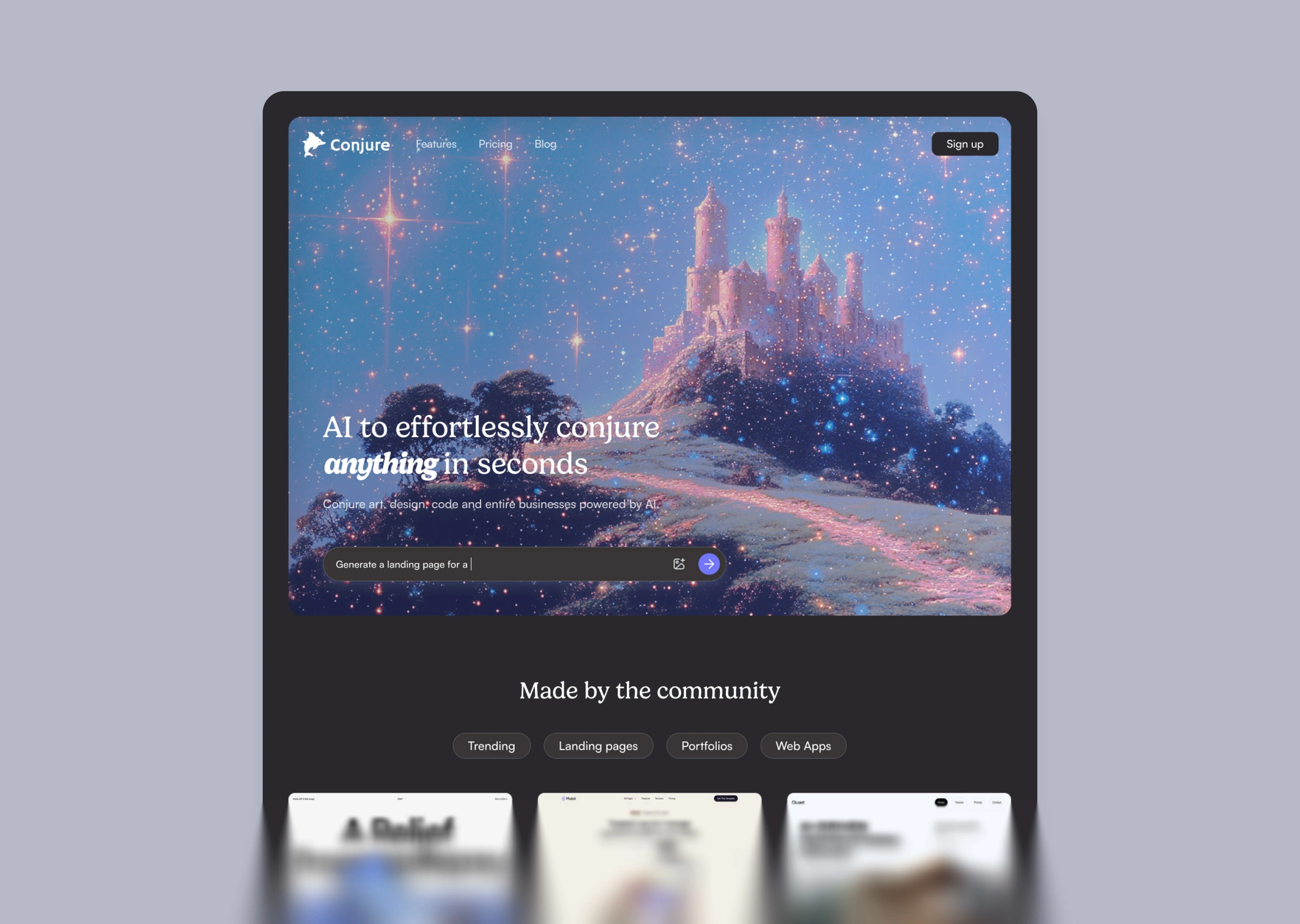 Conjure is a tool that lets users make landing pages using AI. They wanted a hero section that was eye-catching and true to their brand.