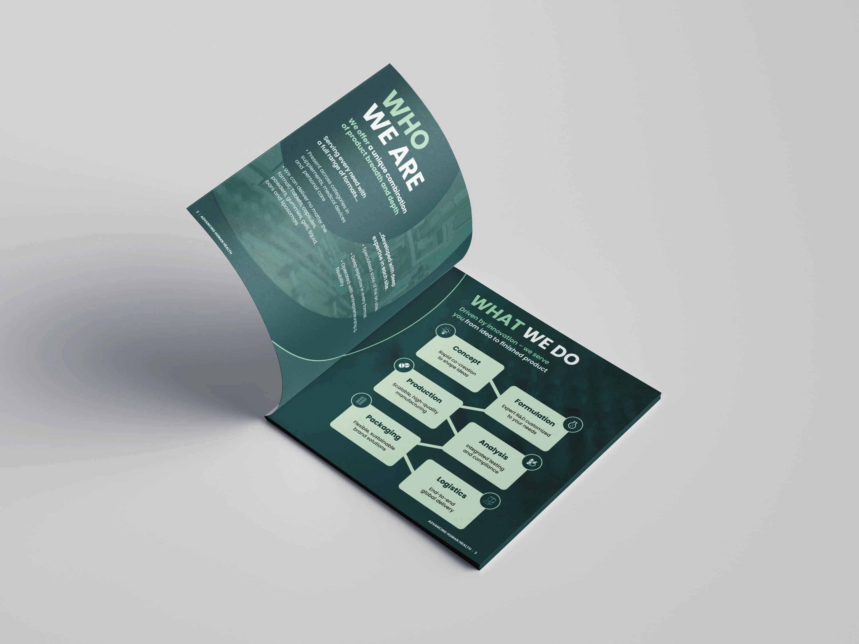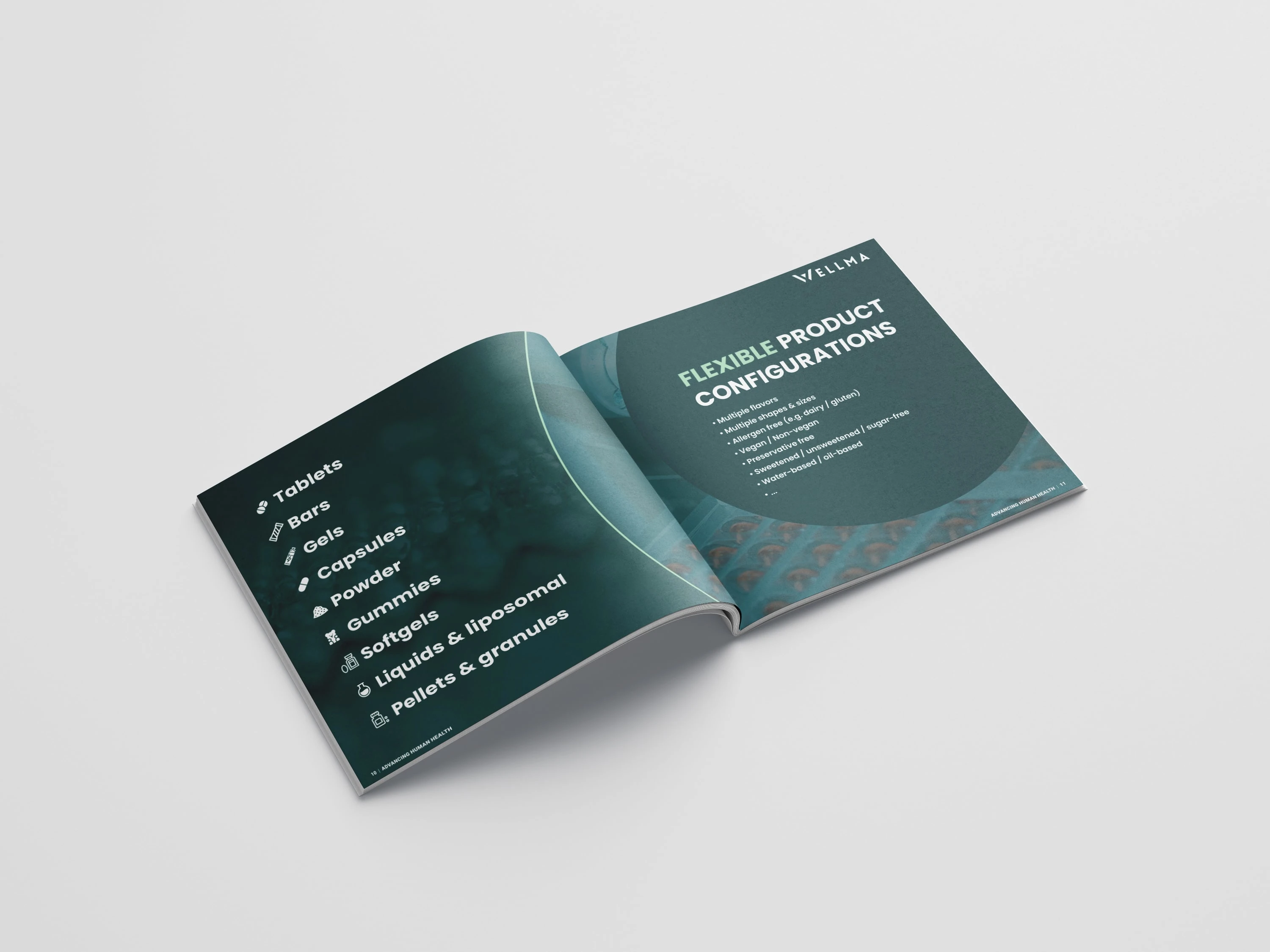 This spread highlights flexible product formats using a clean, structured layout. Clear iconography and balanced typography make complex options easy to scan while maintaining a professional healthcare tone.