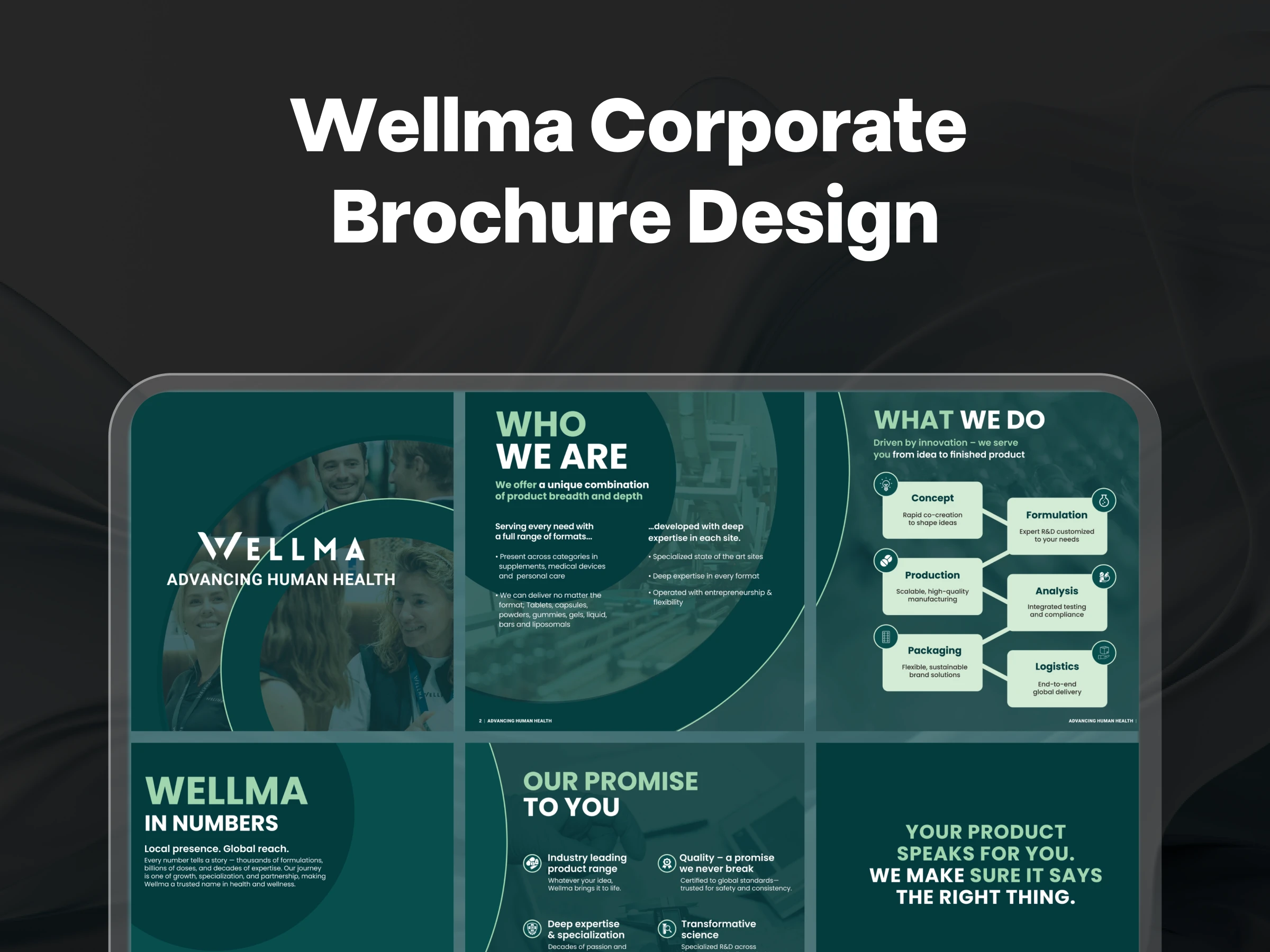 This project involved designing a premium, print-ready corporate brochure for Wellma, a healthcare and wellness company focused on advancing human health through high-quality product solutions and ethical practices.