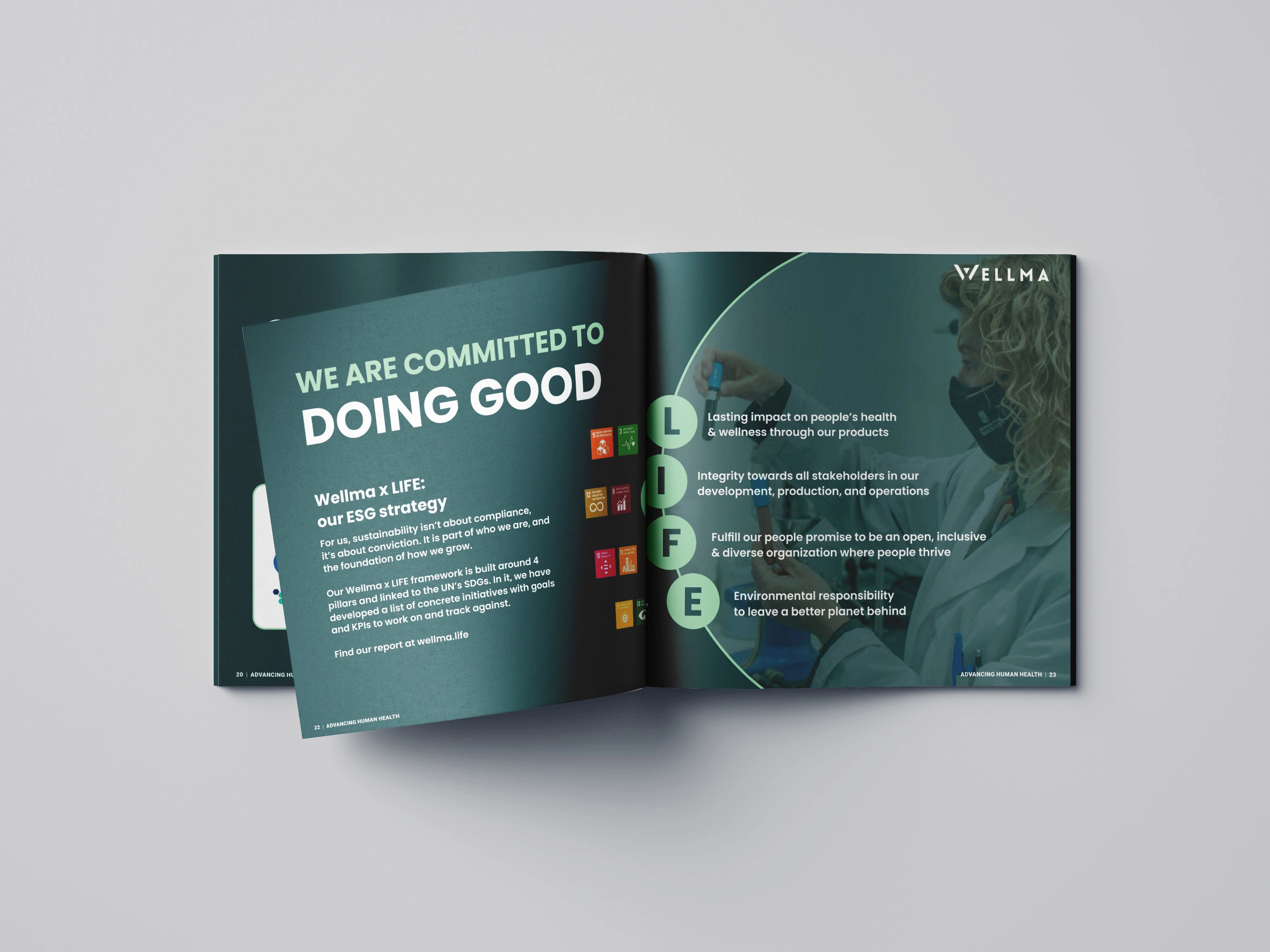 This spread communicates Wellma’s commitment to sustainability and ethical responsibility. Clear messaging and structured content present ESG values in a trustworthy healthcare context.