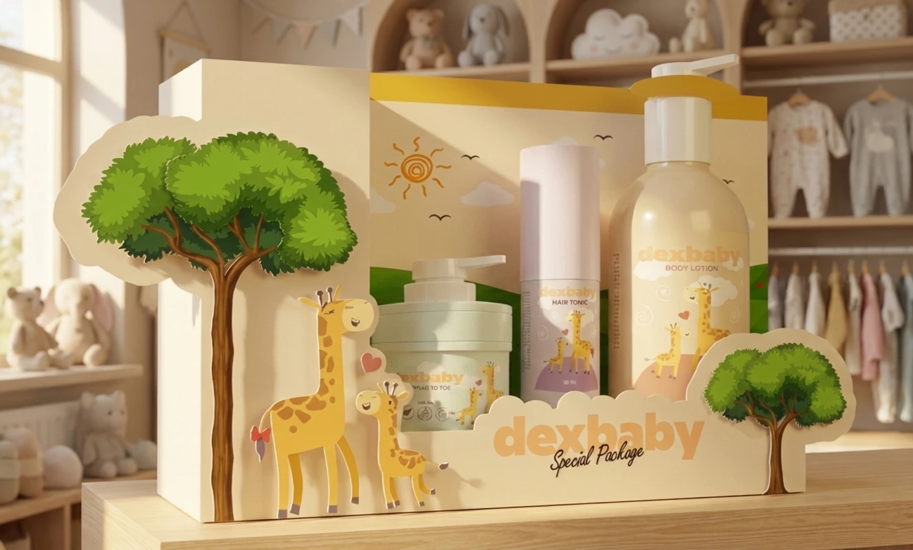When the client approached me for the Dexbaby "Special Package," they didn't just want a box to hold bottles; they wanted a giftable moment. The target audience is parents—specifically moms who value gentle, safe, and premium products for their little ones. My goal was to translate that feeling of "gentle care" into a physical structure. I designed a whimsical scene featuring their signature giraffe characters, using soft pastels and rounded shapes to evoke safety and playfulness.