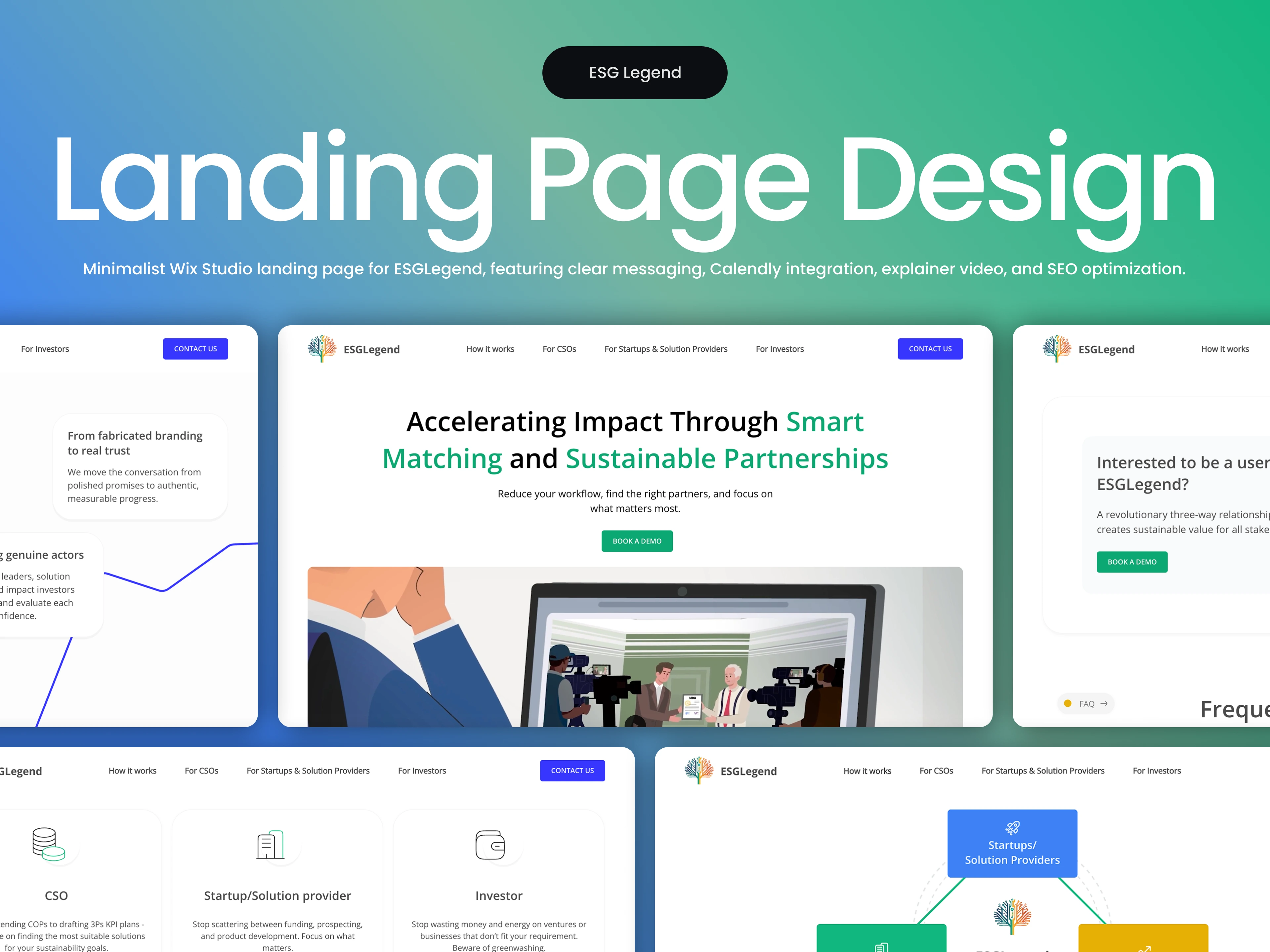 We designed and developed a conversion-focused landing page for an ESG and impact investing company, creating a modern, professional, and trustworthy digital presence to engage investors, startups, and corporate sustainability leaders. The landing page was built on Wix, leveraging their hosting and domain setup, and optimized to communicate the brand’s value proposition clearly and directly. The result is a fast-loading, professional landing page that builds credibility while driving investors and leaders to connect through demo bookings.