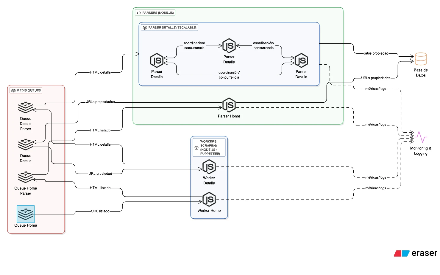 MobiMiner is a distributed web scraping system designed to extract property listings from real estate websites at scale. The architecture uses Redis-based message queues to coordinate multiple workers and parsers, enabling efficient parallel processing of both listing pages and individual property details.