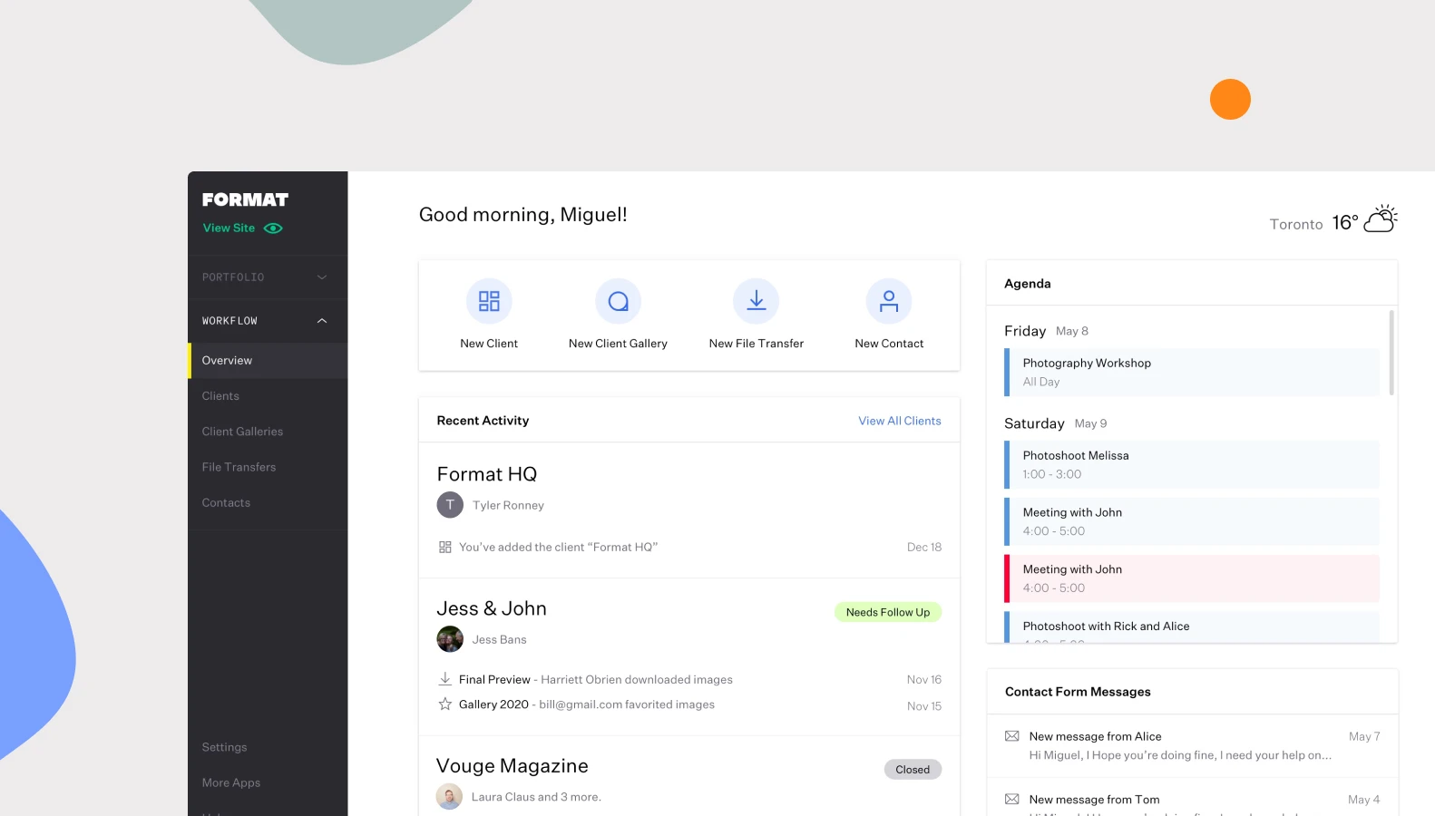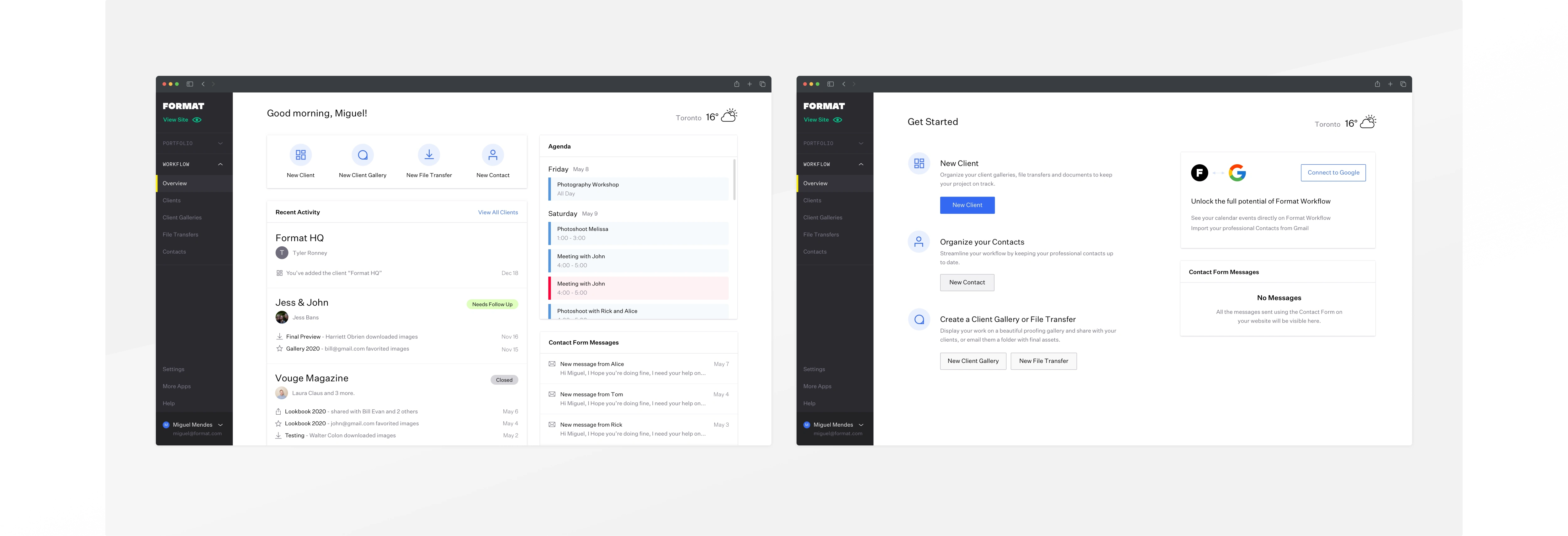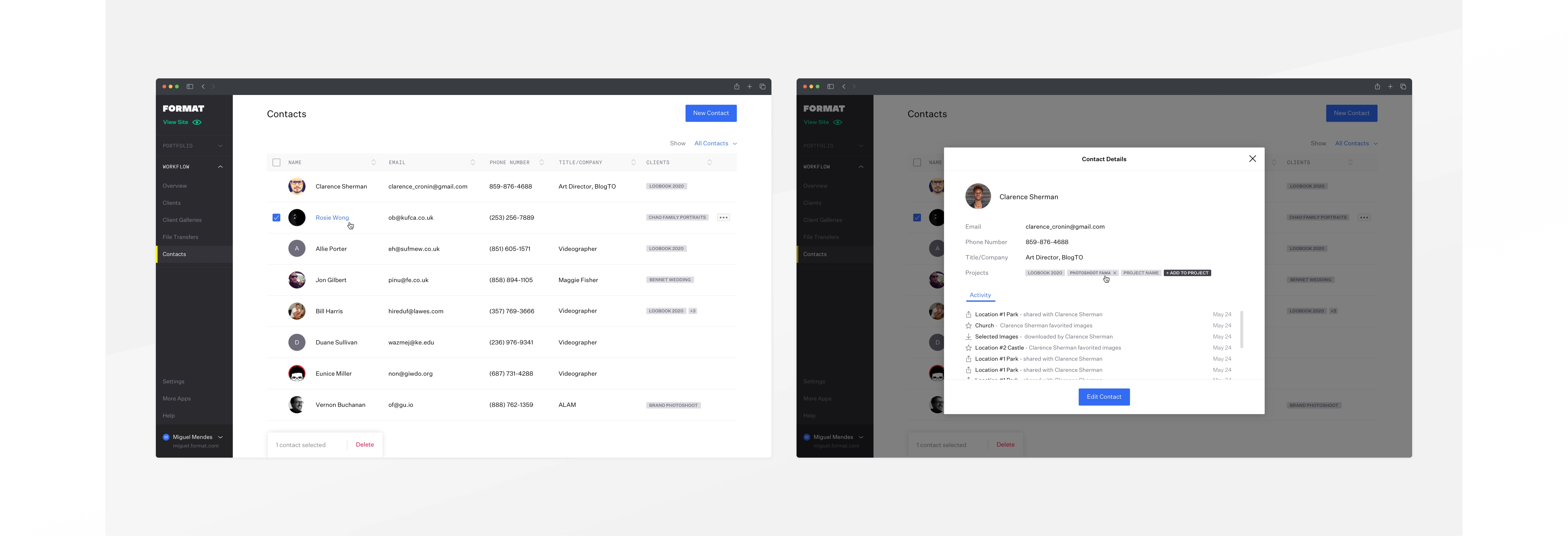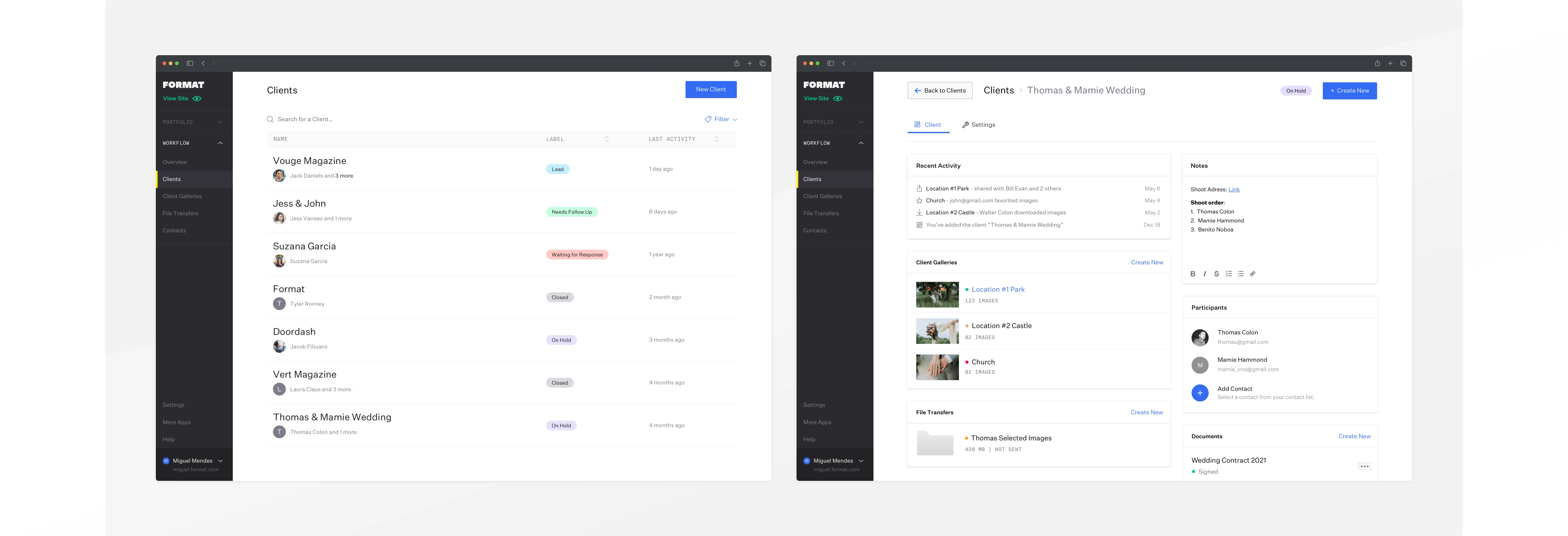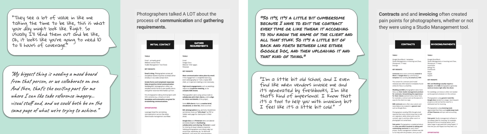 “Studio Management” includes products like Tavé, 17hats, Studio Ninja, Sprout Studio, and Honeybook that offer all-in-one solutions to professional photographers running their own businesses. These tools generally include features for sending quotes and contracts, scheduling, invoicing, payments, and managing clients and leads. Format is exploring offering our own Studio Management tool(s) in order to increase our appeal for professional photographers. In order to do that, we first need to understand what problems Studio Management tools solve for professional photographers, and where any pain points exist in their workflows. We've used two research methods, surveys and interviews.