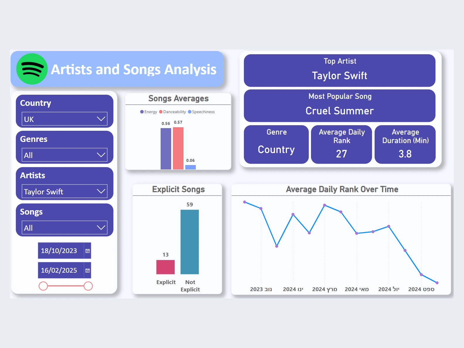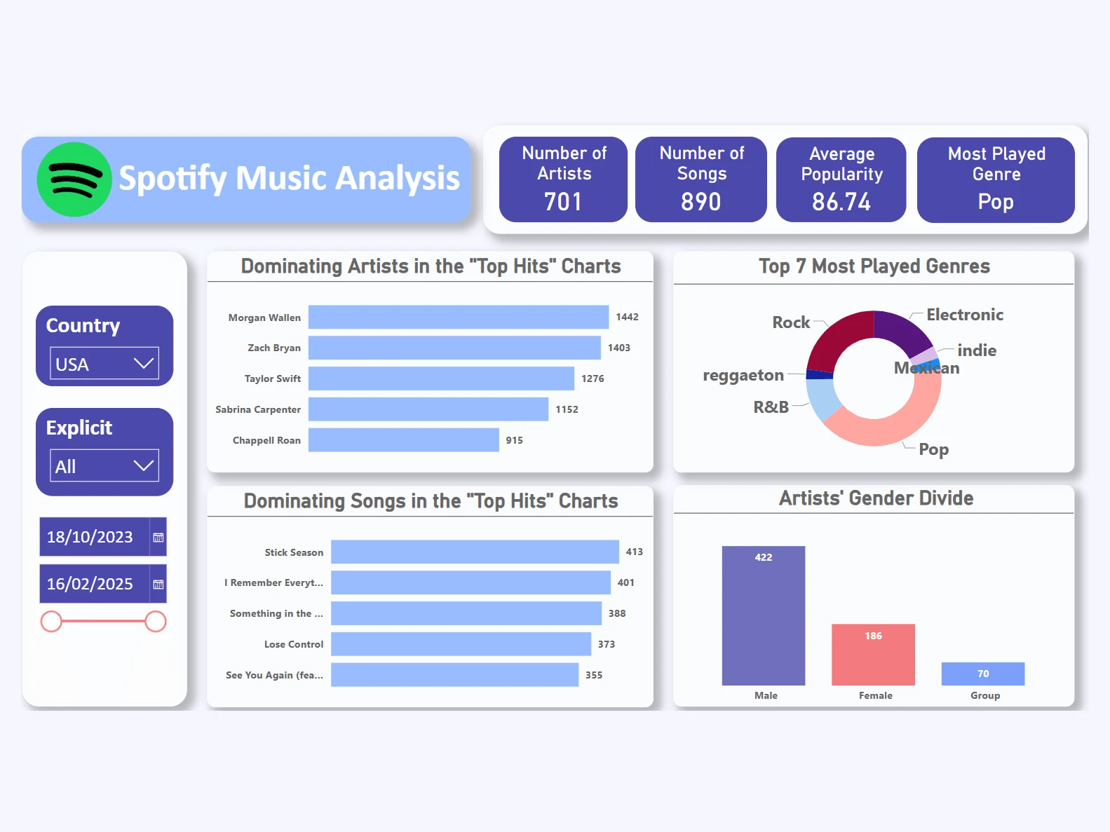 Interactive Power BI dashboard built from Excel data using Power Query. Shows top artists, songs, genres, and trends with country/date filters.
