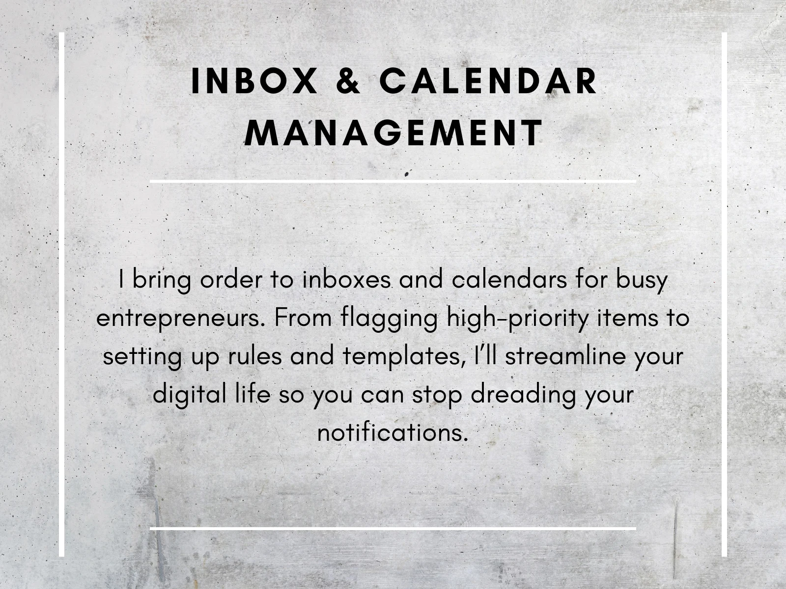 I bring order to inboxes and calendars for busy entrepreneurs by streamlining your digital life so you can stop dreading your notifications.