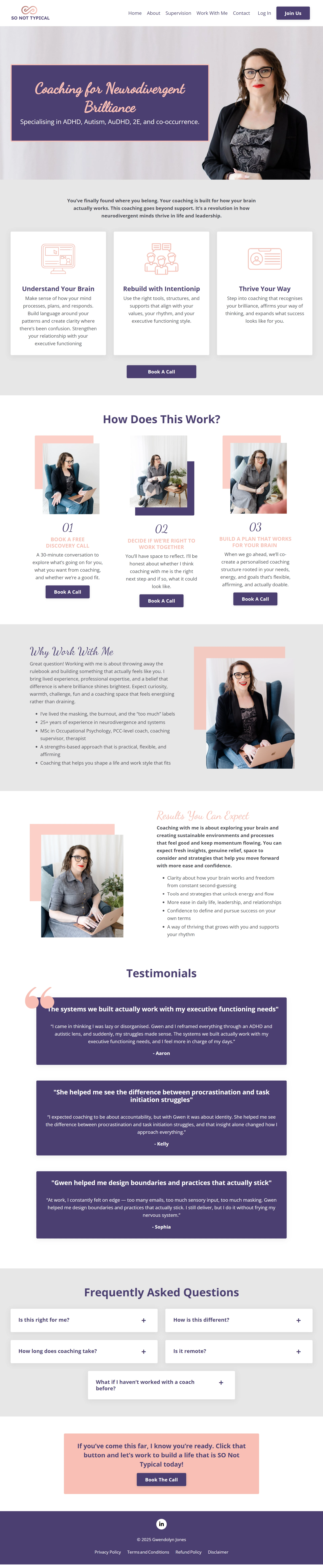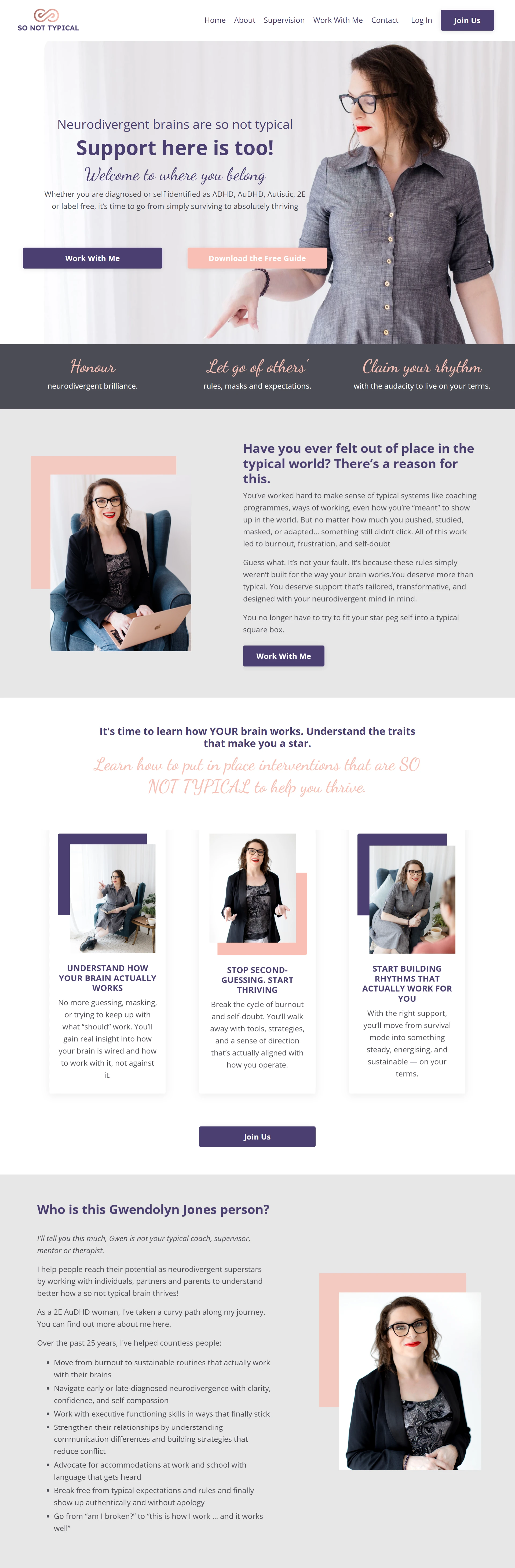 “Shaloo is patient, kind, and the consummate professional. I came to her with an idea that she helped me shape into a vision and then a final product in Kajabi, which I am so proud of. Thank you, Shaloo, for helping www.sonottypical.com come to life! My neurodivergent coachees, supervisees, and organisational clients will forever benefit from your expertise.”