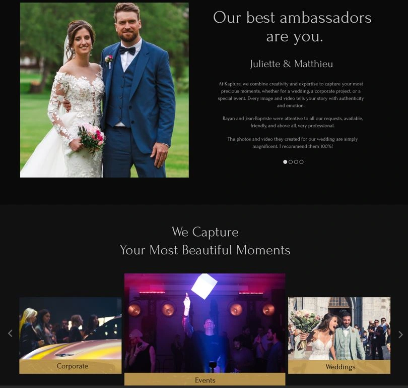 The client needed a premium, cinematic website that could showcase event photography and videography while building trust with high-end clients. We delivered a visually immersive, conversion-focused digital experience with clear service presentation, portfolio-driven storytelling, and strong inquiry CTAs, positioning Kaptura as a professional, reliable partner for weddings, corporate events, and live productions.