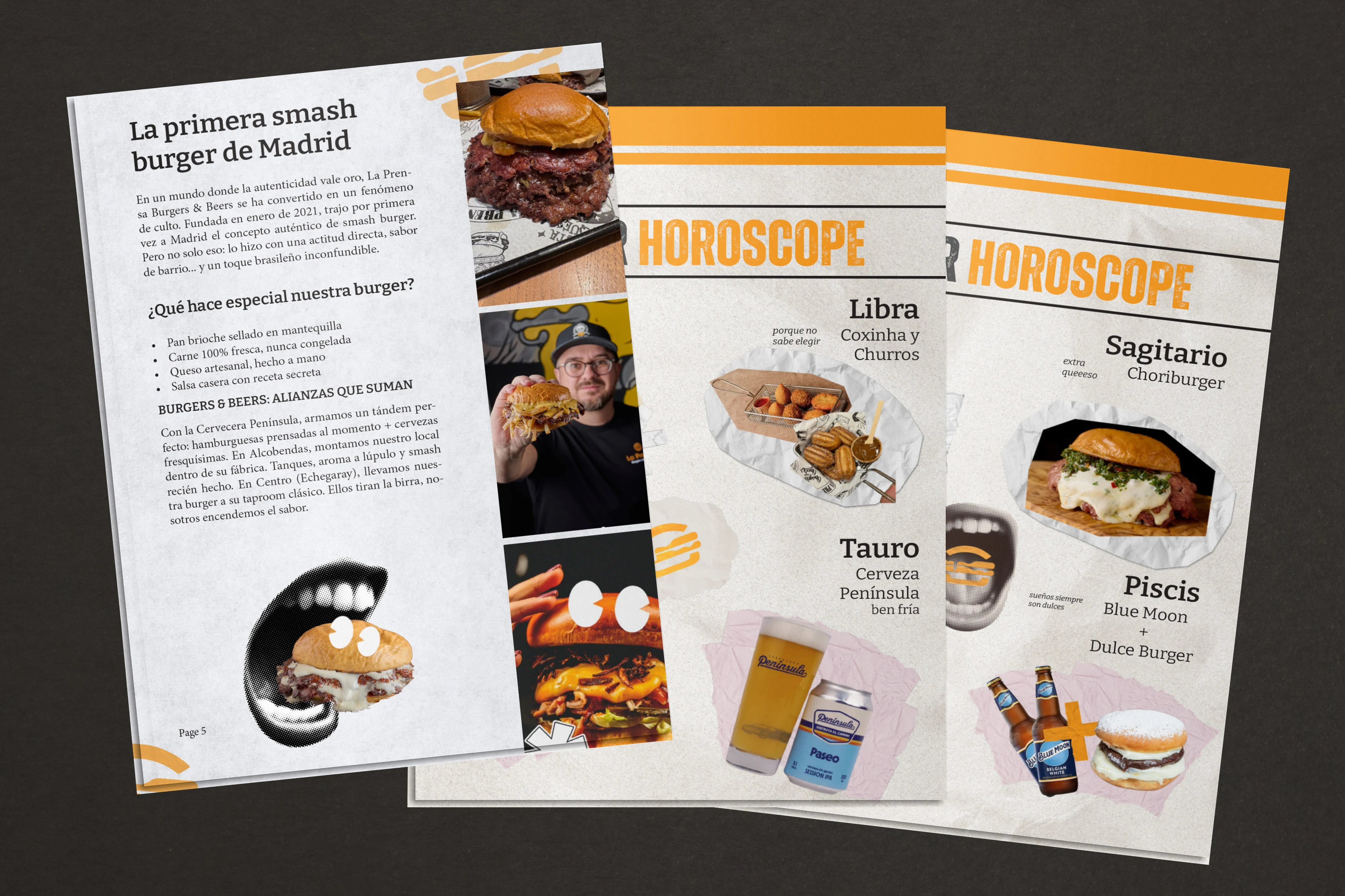 This project focused on creating a special magazine for La Prensa Burger & Beers, the very first smash burger spot in Madrid. The goal was to translate the brand’s essence into a graphic piece that conveyed authenticity, flavor, and neighborhood identity, while keeping the casual, street-inspired attitude that defines the restaurant.