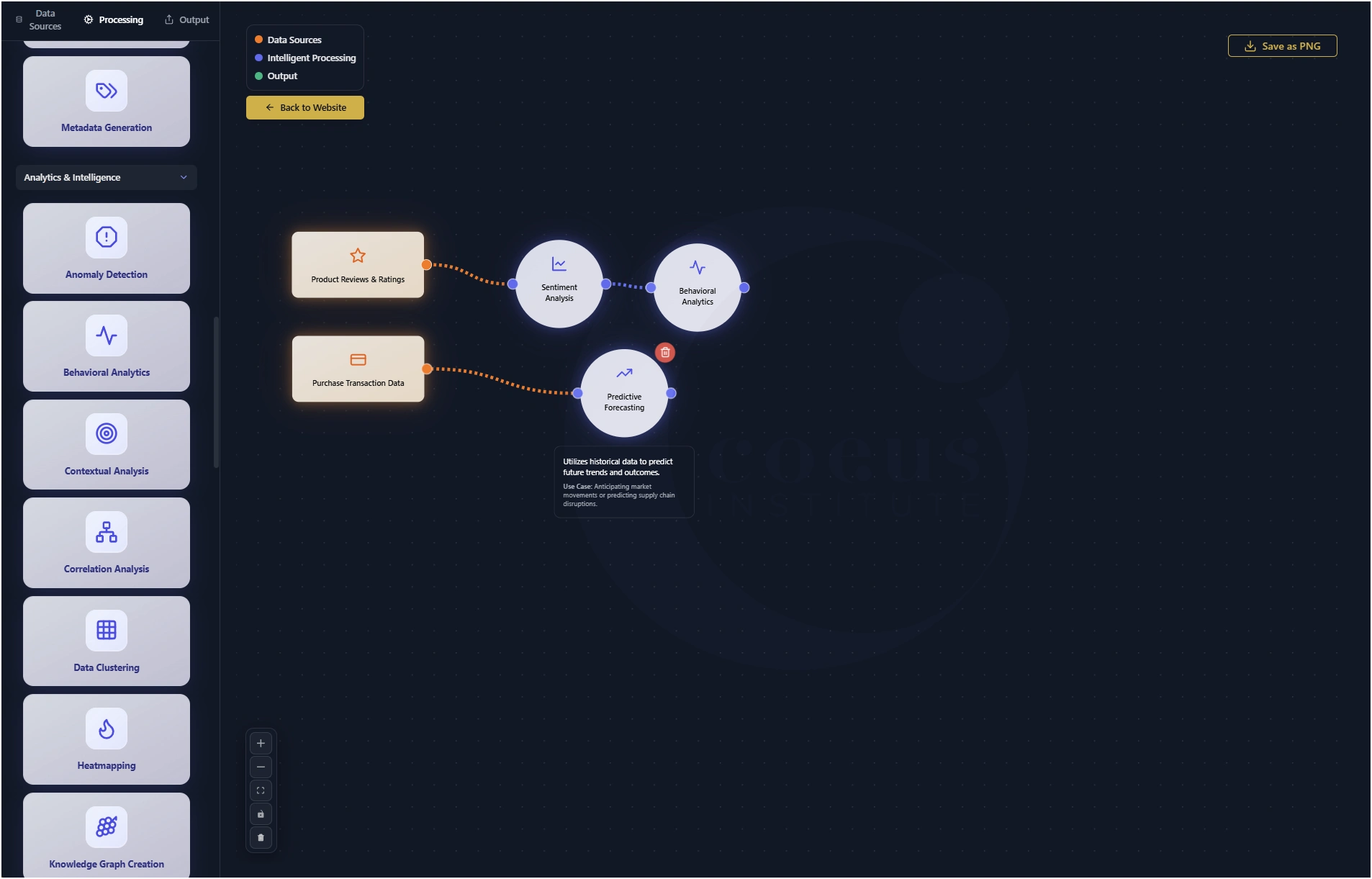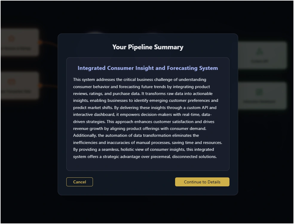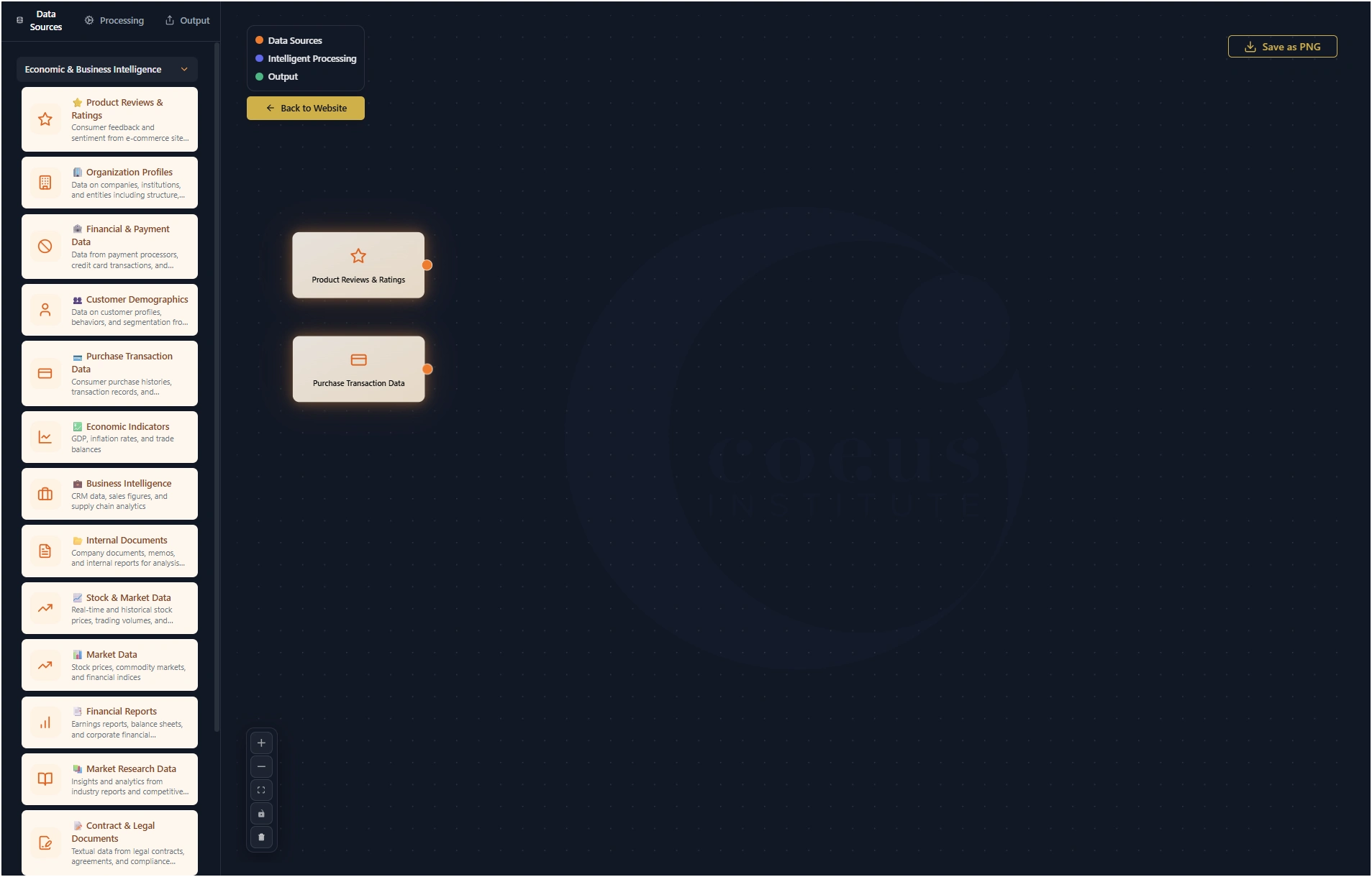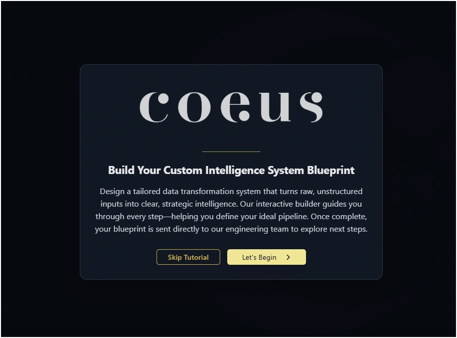 An interactive, web-based builder that lets you visually design a tailored data-transformation pipeline. Users map raw, unstructured inputs to strategic outputs, then send the finished blueprint directly to our engineering team for implementation.
