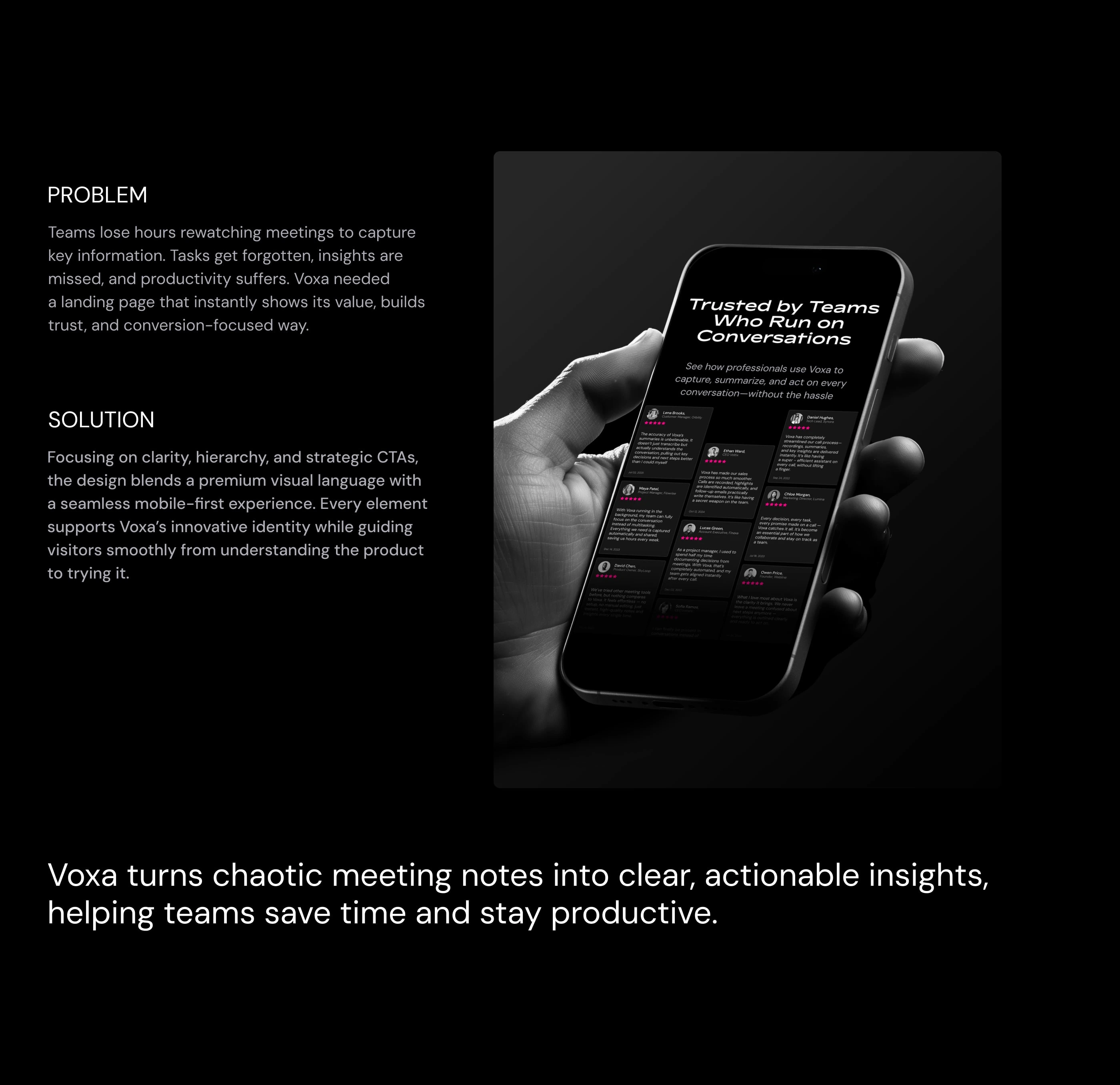 I led the end-to-end design process for Voxa, a project for an AI meeting assistant that records, analyzes, and summarizes conversations.