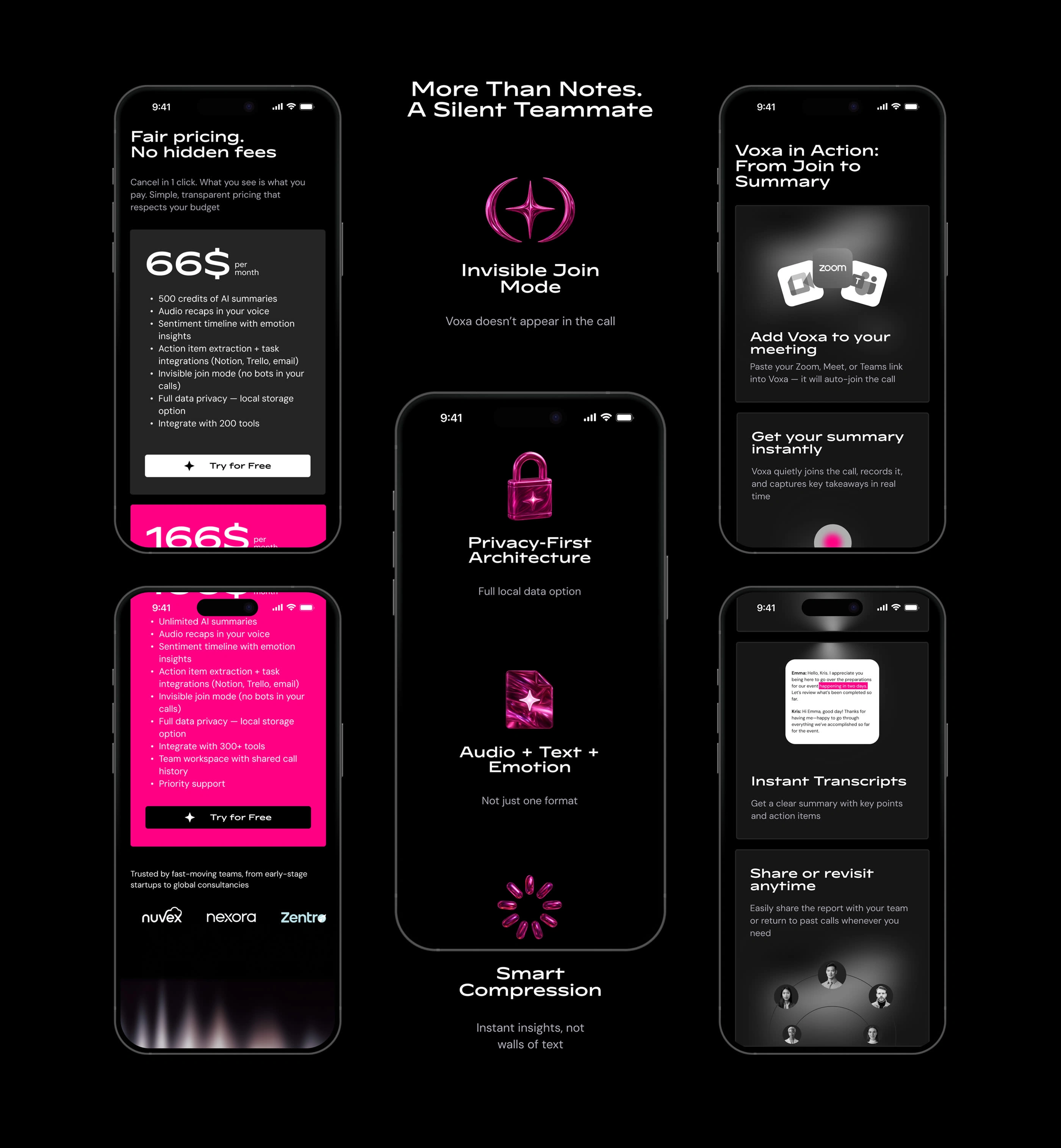 Created a distinctive user experience flow that positions Voxa as a trustworthy AI partner rather than just another tool.