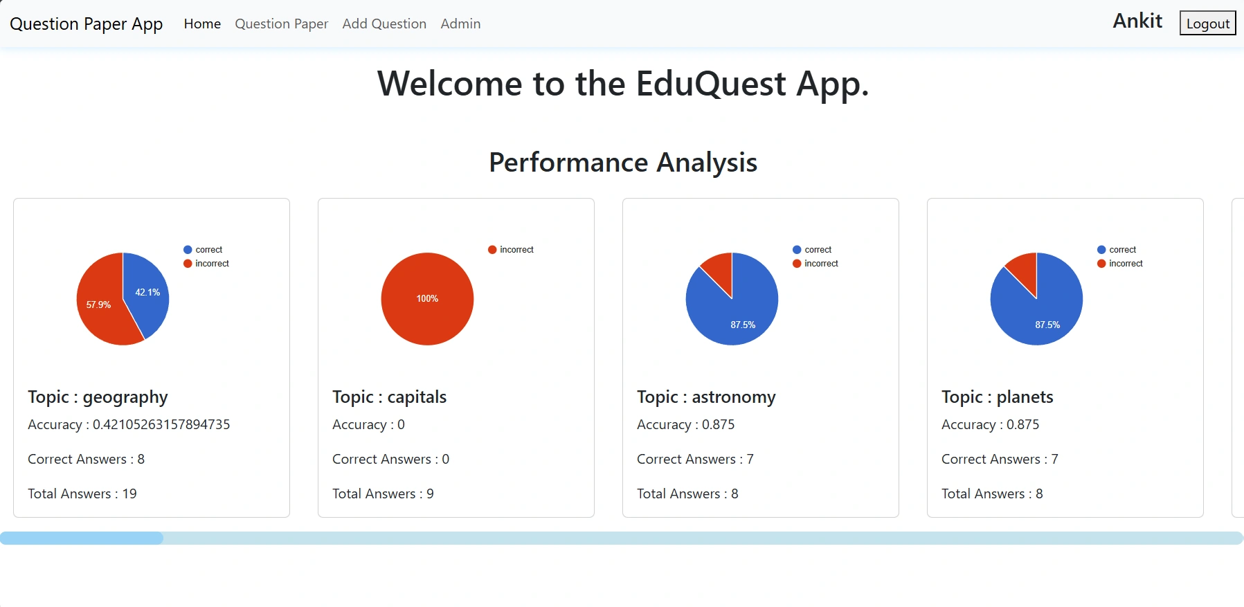 EduQuest allows users to take quizzes on a wide range of subjects, with an advanced tagging system to ensure personalized question selection. The platform also analyzes question-topic associations based on students' previous attempts, improving question relevance and learning efficiency.