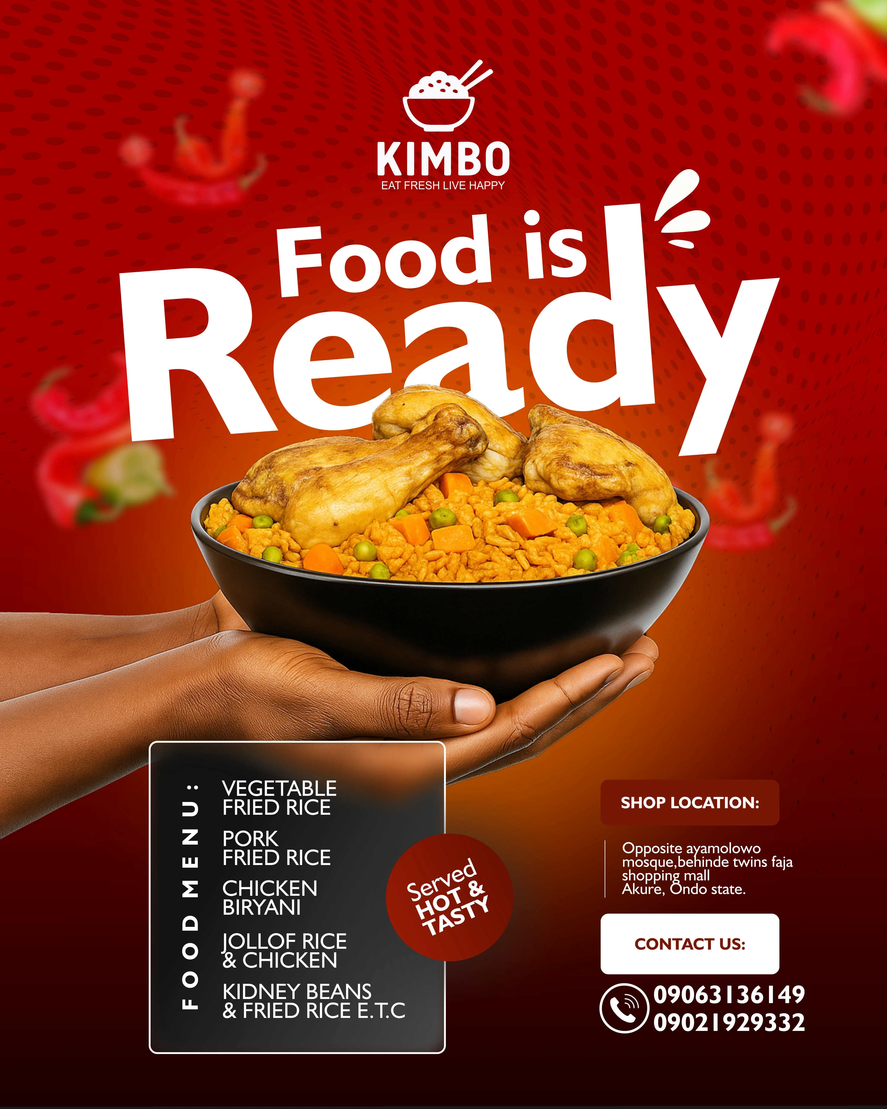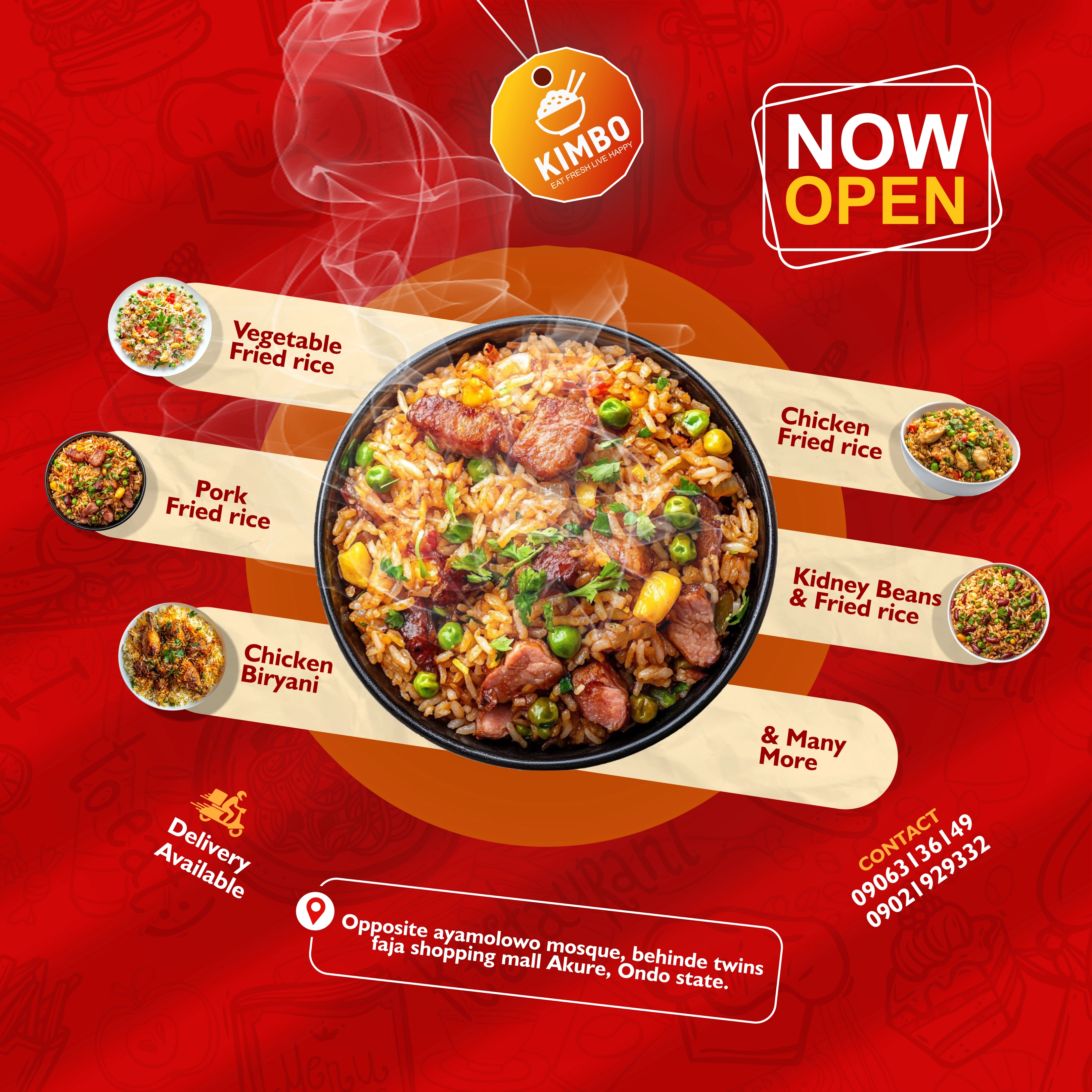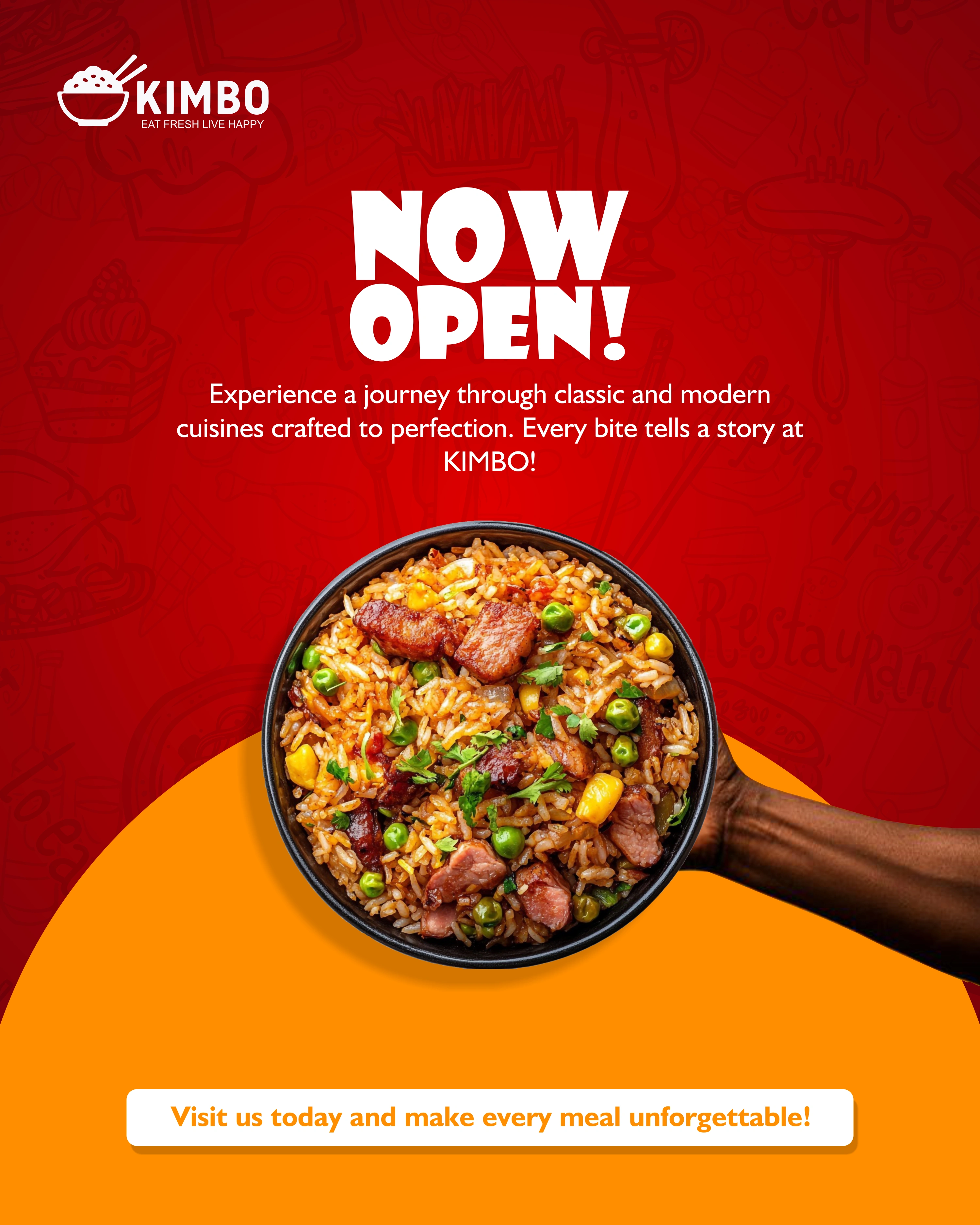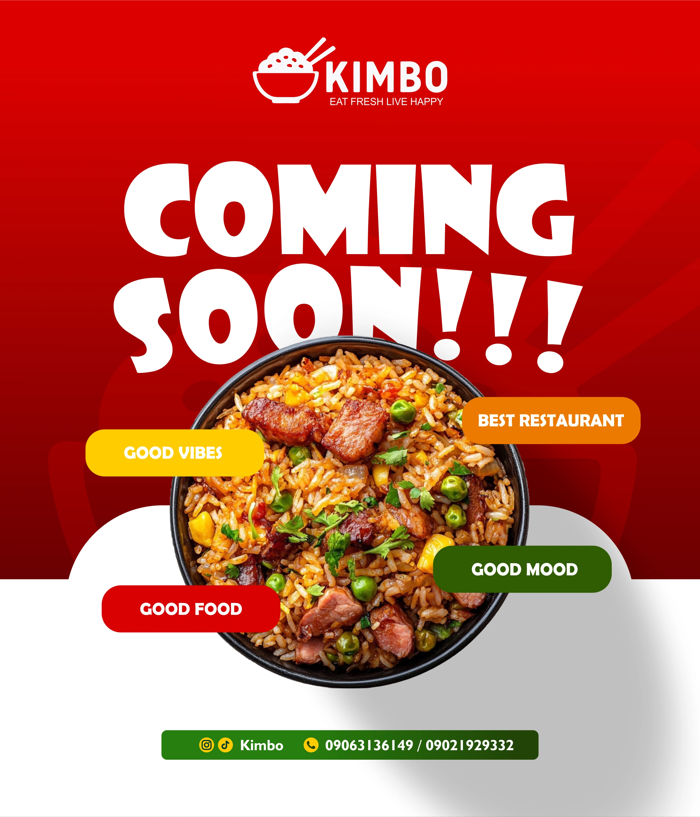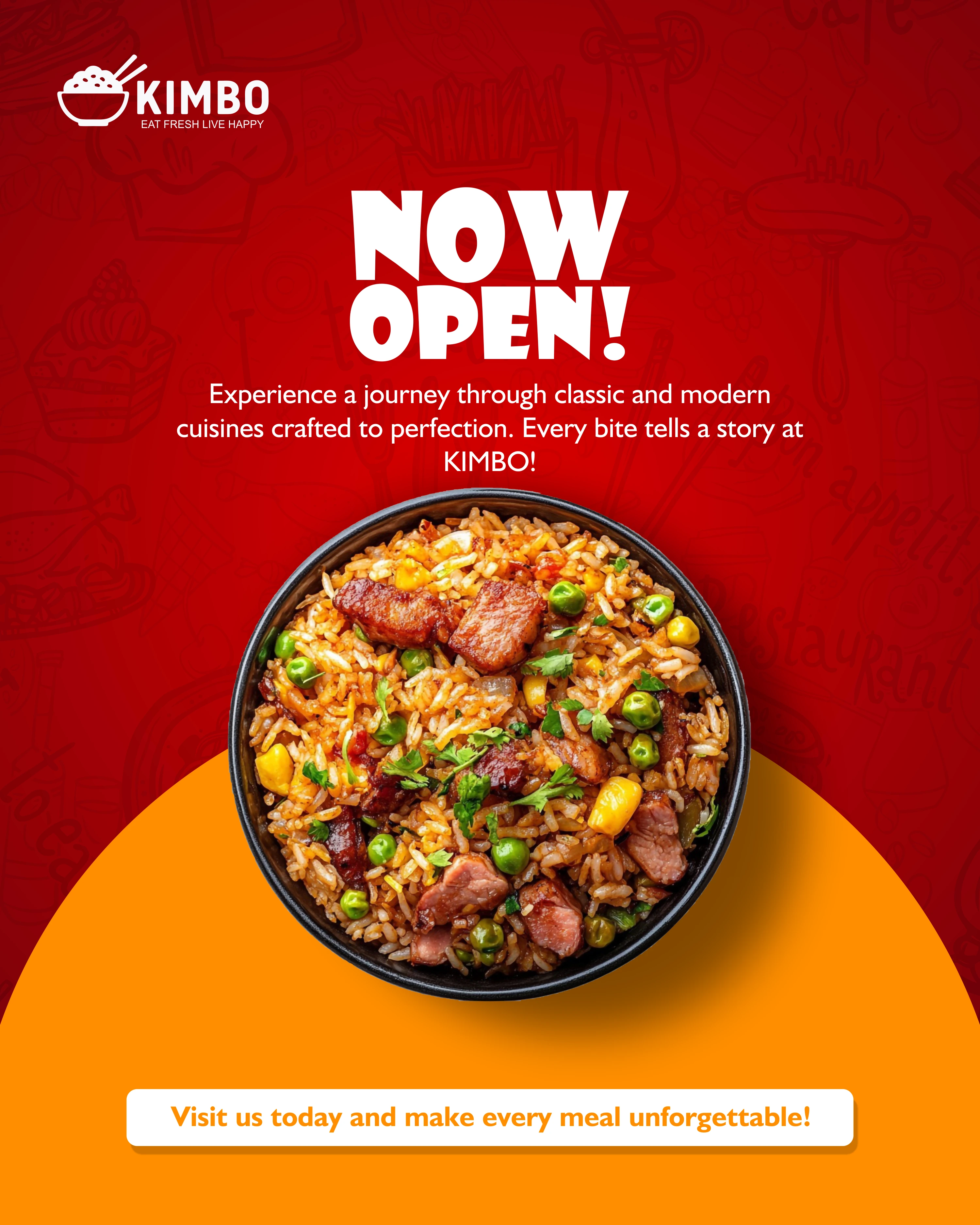 I designed social media visuals for KIMBO Restaurant, a new food spot now opening.