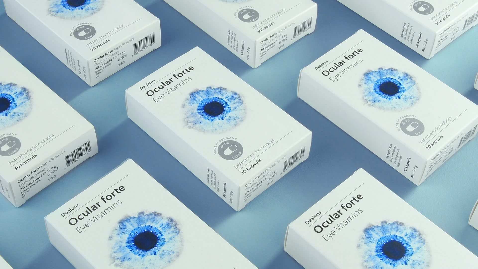 The capsule packaging is designed in a refined form with the aim of communicating a professional medical supplement. An interesting, striking illustration is intriguingly distracting in its depiction of the beauty of the human eye. The visual suggests the complexity of the eye, and thus invites the customer to become aware of health care and their own vision.