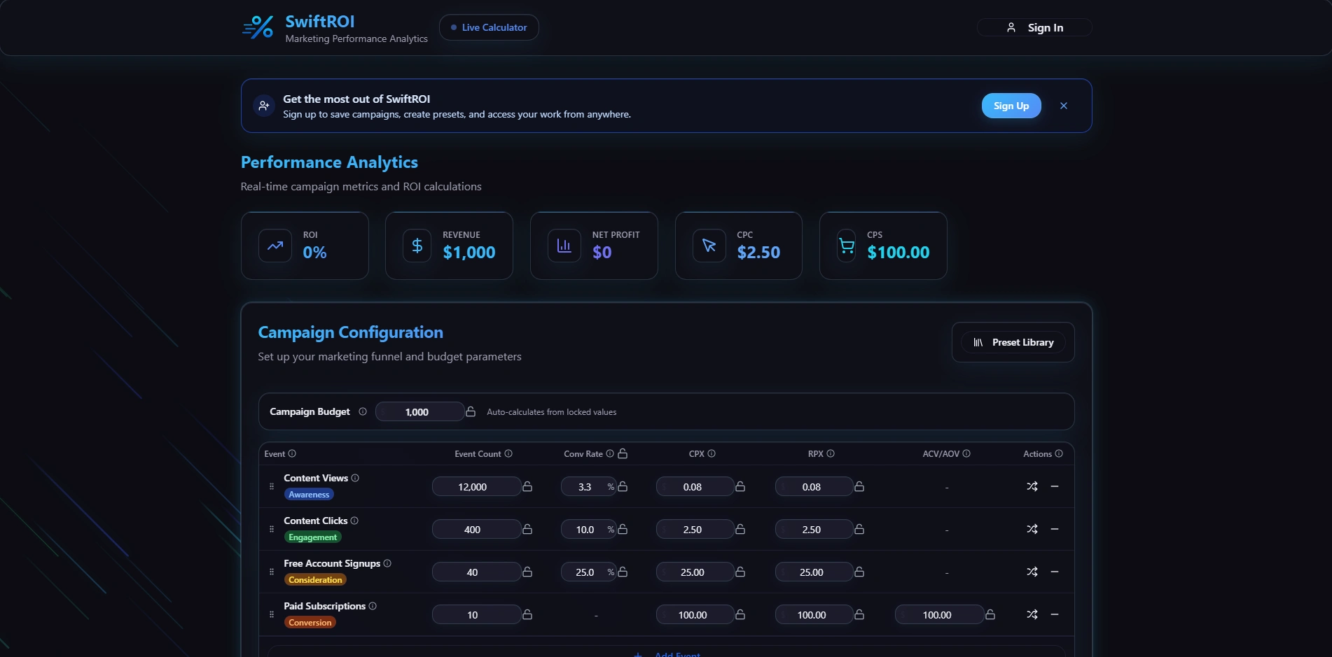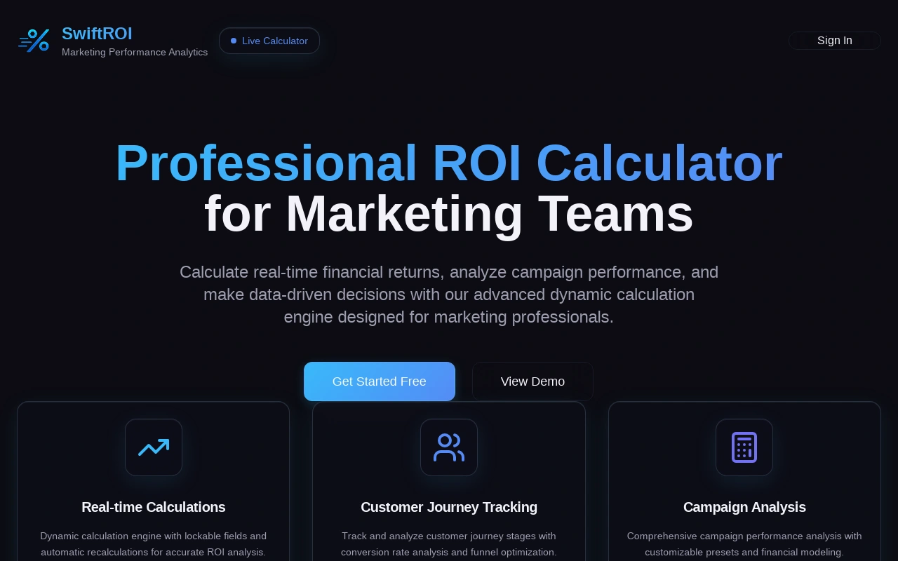 Built SwiftROI as a professional, browser-based ROI calculator that helps marketing teams quickly model campaign scenarios, understand real-time financial returns, and make data-driven budget decisions. The app lets users plug in spend, revenue, and channel metrics, then instantly see ROI, break-even points, and performance comparisons across campaigns in a clean, UI-driven workflow.