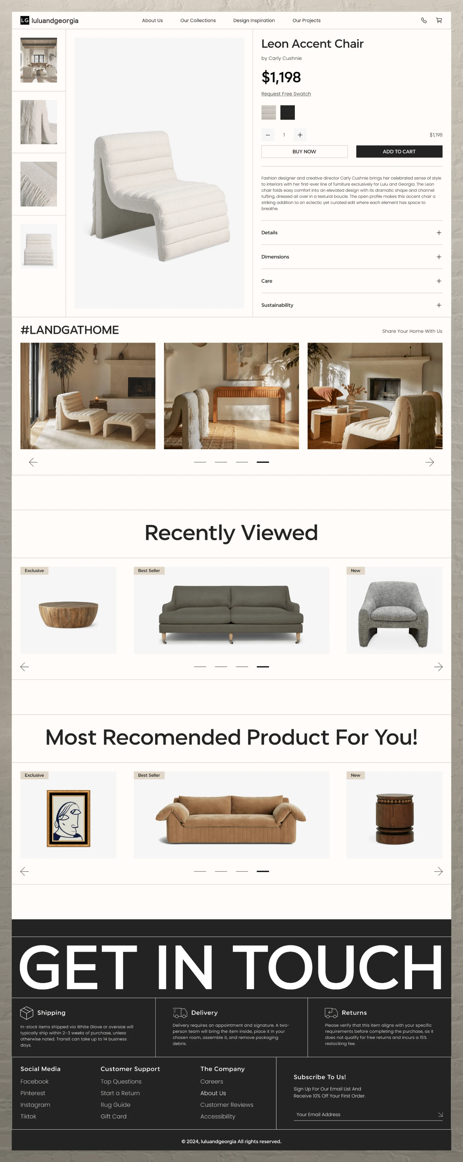The Product Detail Page showcases products with an elegant, minimalist approach. A large, high-quality image takes center stage, surrounded by clickable thumbnails for alternate views. The right section presents product details with bold typography for names, prices, and descriptions. Features like color swatches, quantity selectors, and "ADD TO CART" buttons are easily accessible, with expandable tabs for care instructions and sustainability details. This layout ensures a premium shopping experience tailored to the modern consumer.