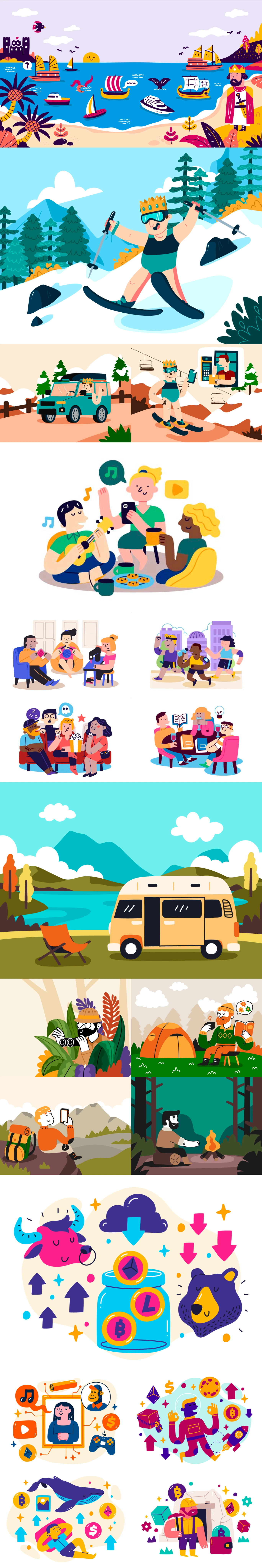 Each illustration is designed with a bold, flat style and a bright color palette to make the visuals pop and stay engaging across platforms. The characters are expressive, the compositions are dynamic, and every scene tells a story, whether it’s a family camping in nature, friends enjoying music together, or a visual explanation of cryptocurrency and cloud storage.