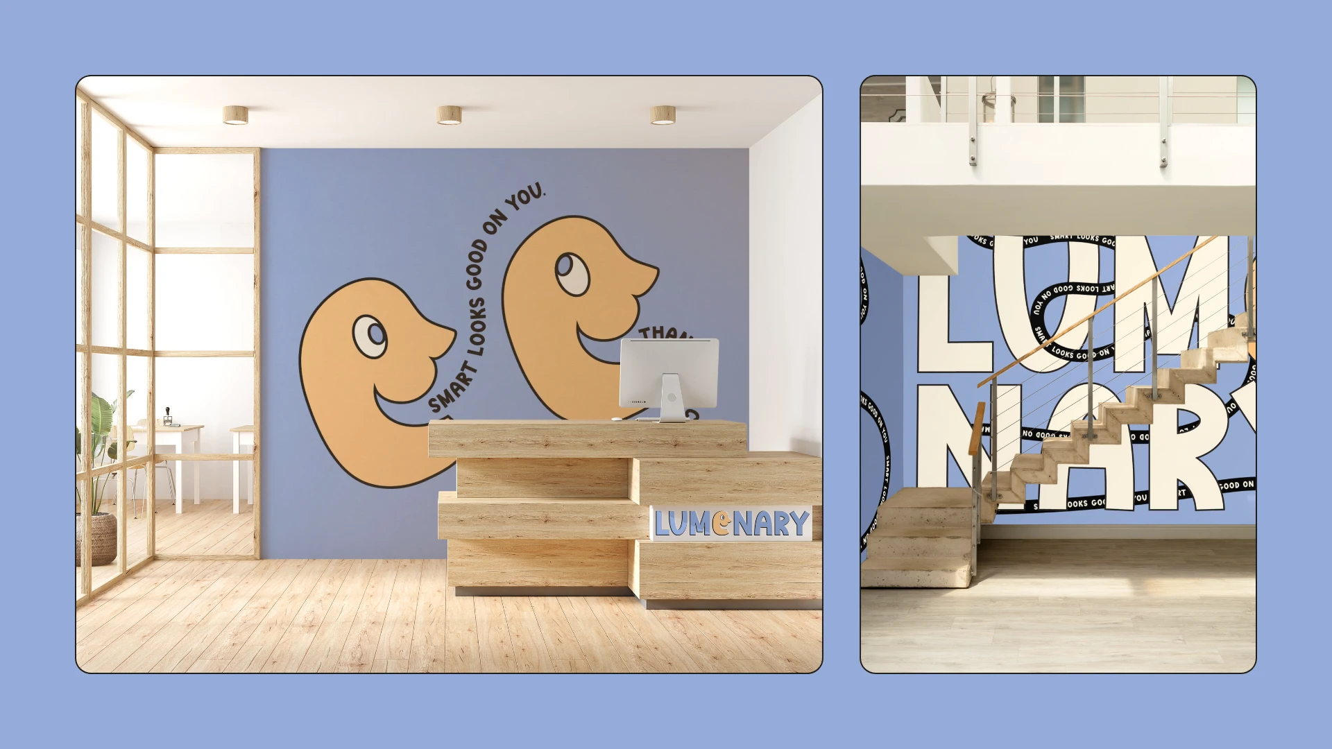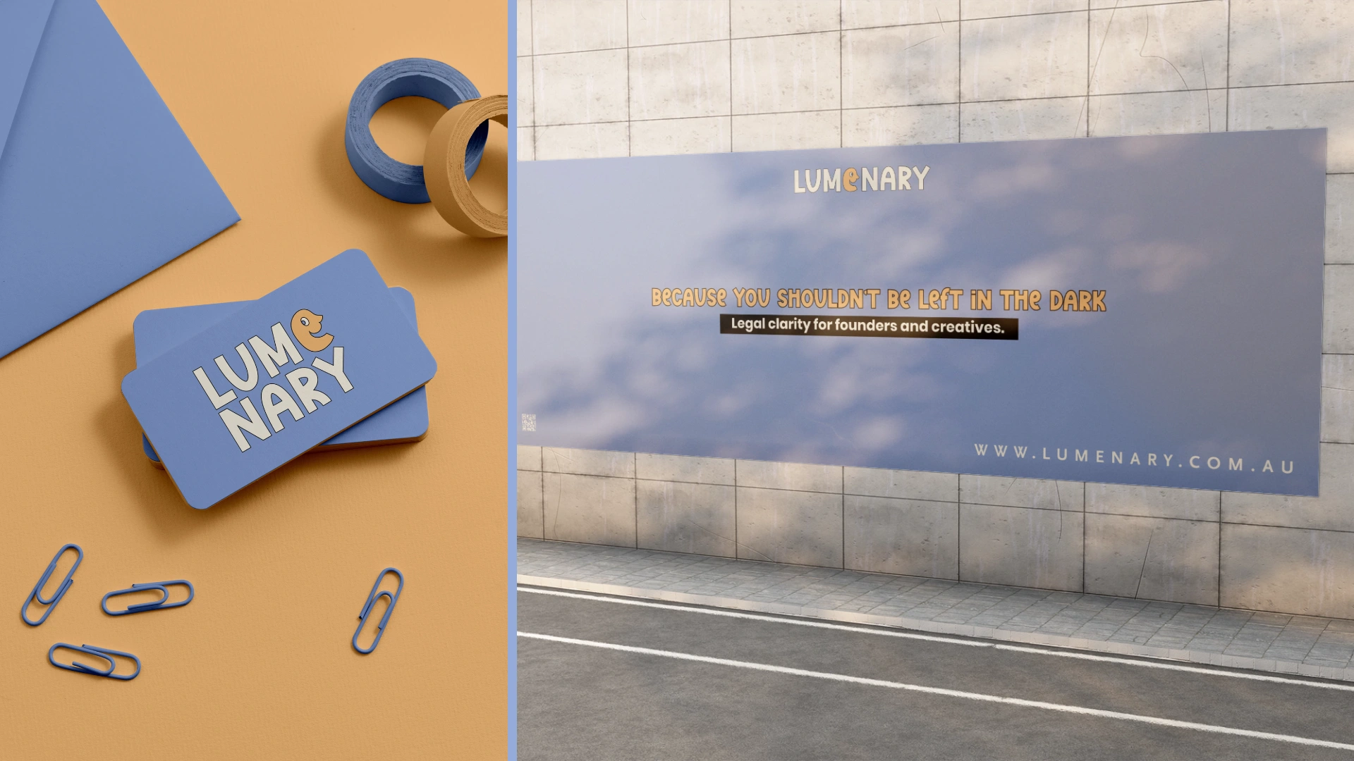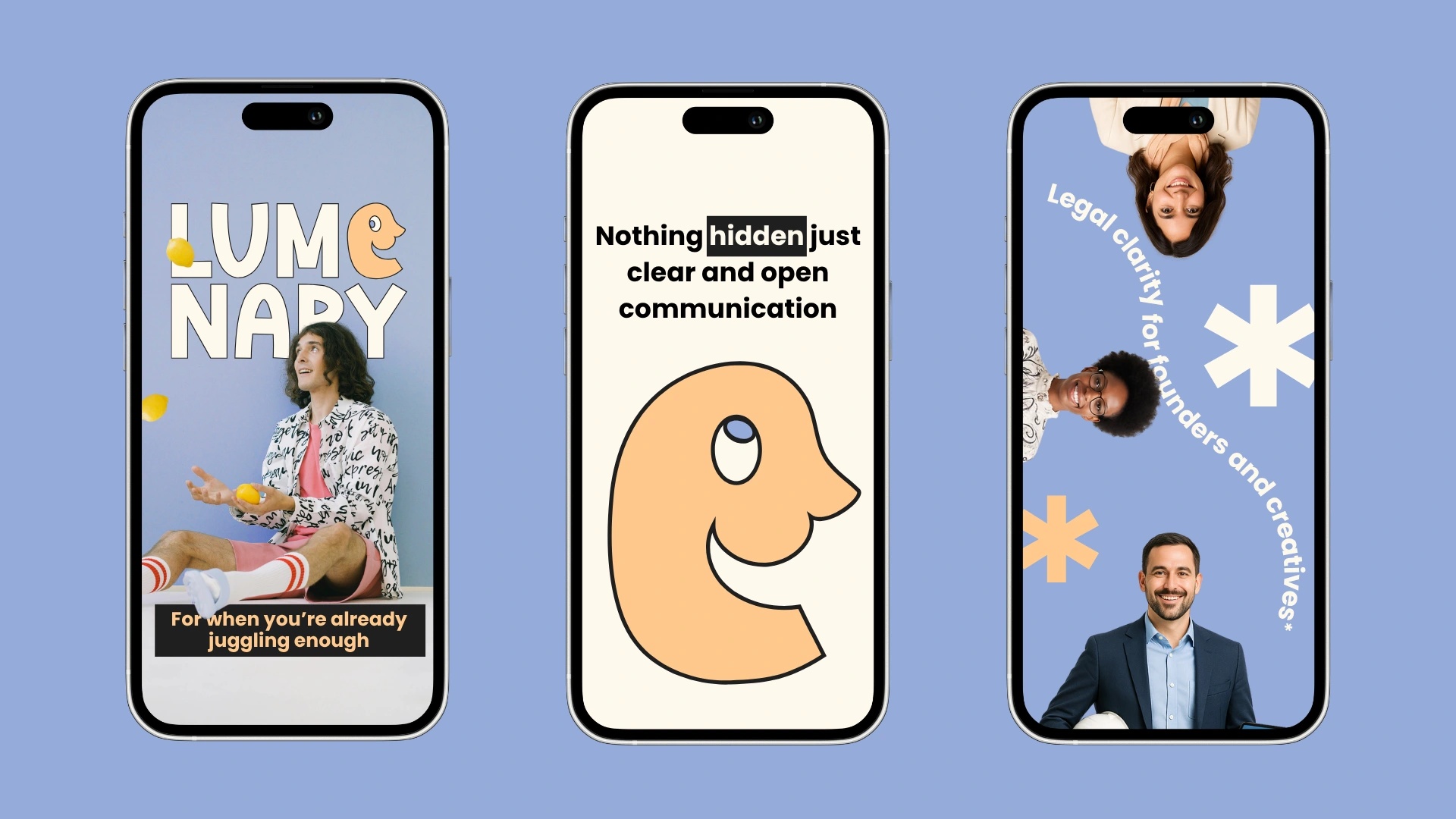 Lumenary began with a question... what if working with a lawyer felt easy? The brand grew from that single thought into an identity that smiles back. Built around a small character, the grinning e, it brings warmth to an industry better known for fine print and furrowed brows. He looks around the page, eyes following words like clarity, no jargon, plain English, reminding clients that understanding should never feel out of reach.