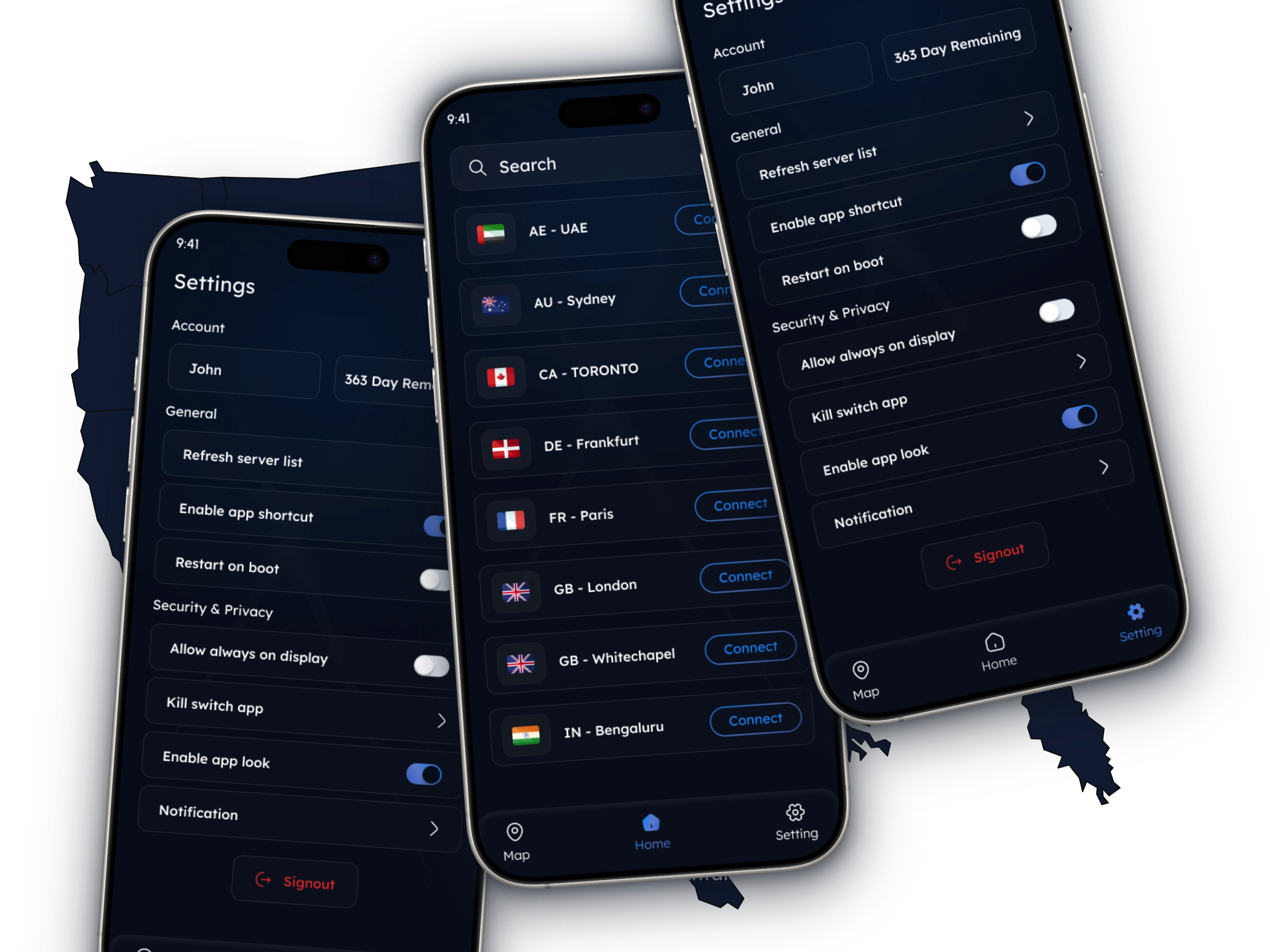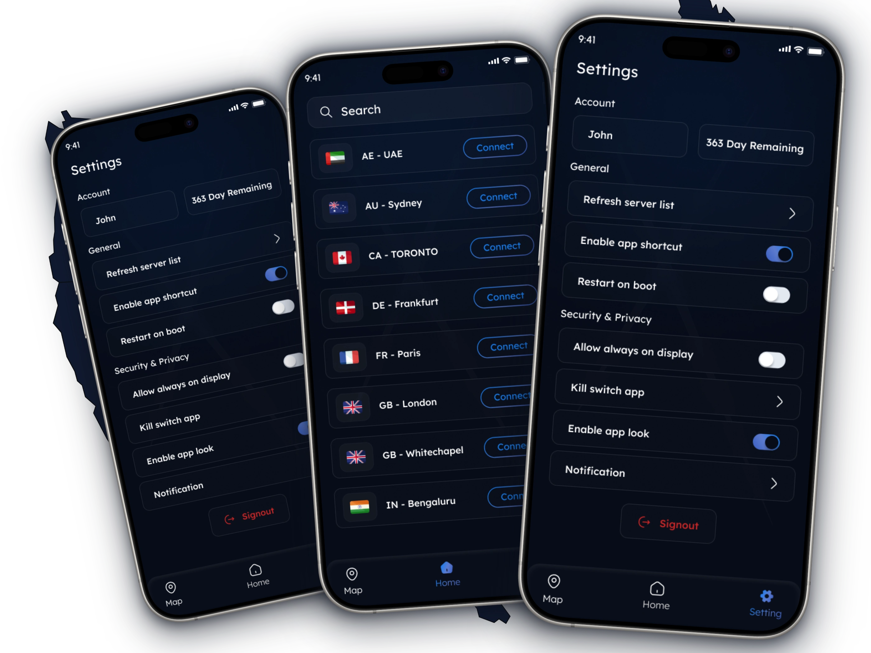 A modern and fast VPN mobile UI design focused on privacy, protection, and performance. Includes connection dashboard, country selector.