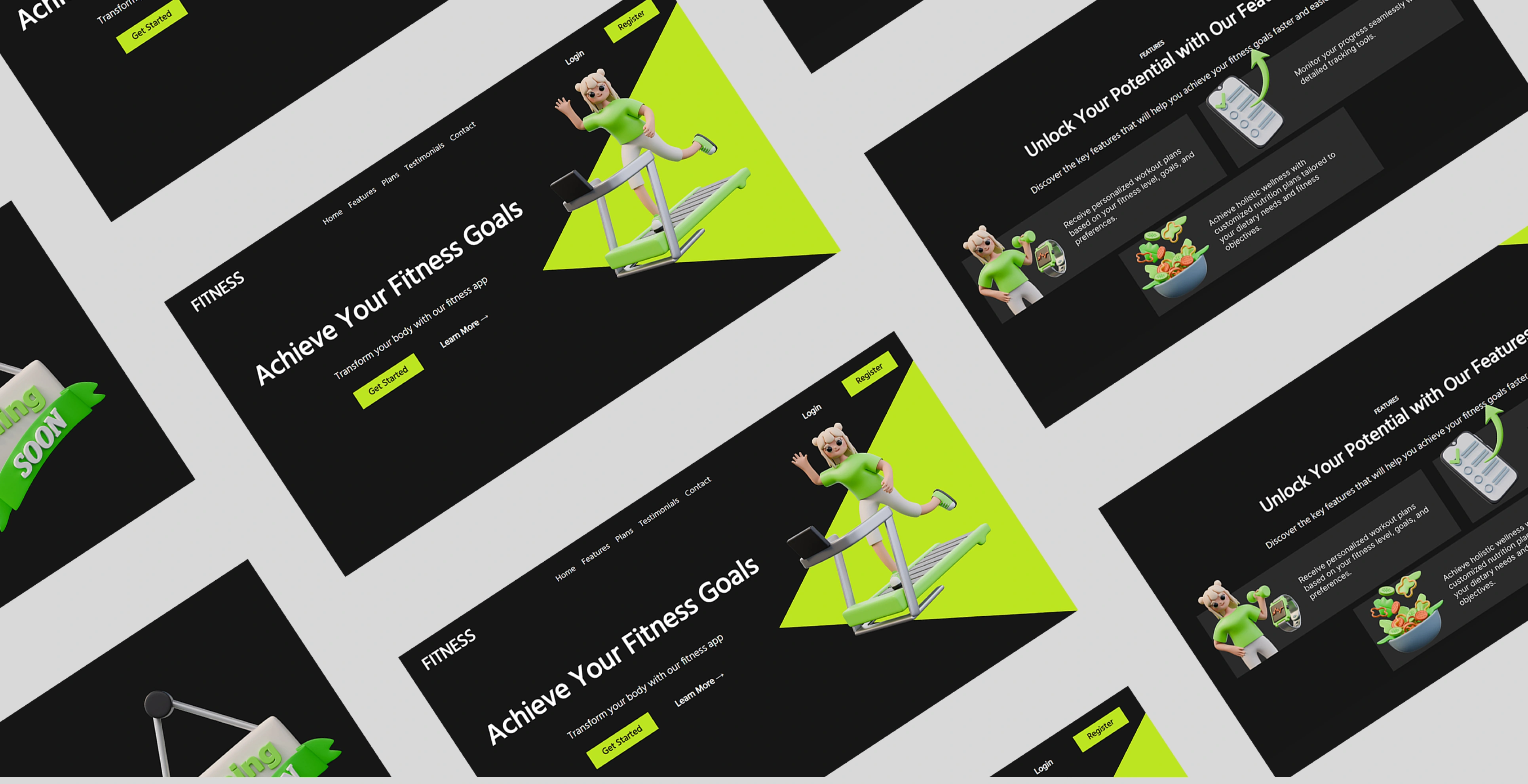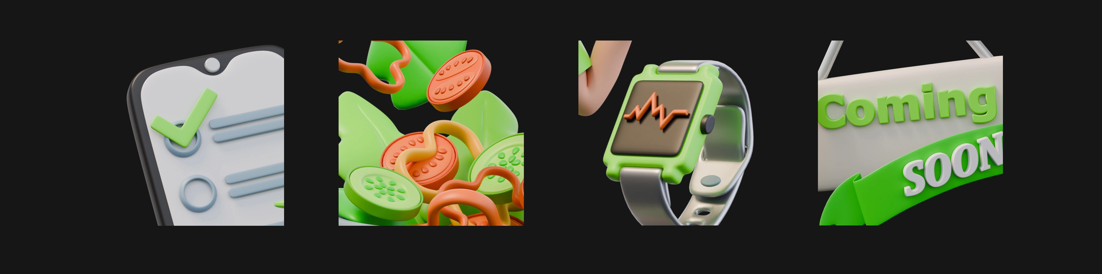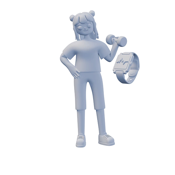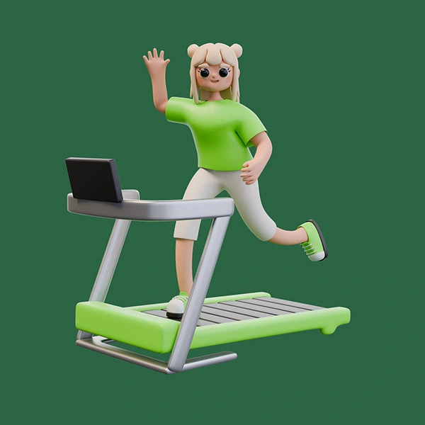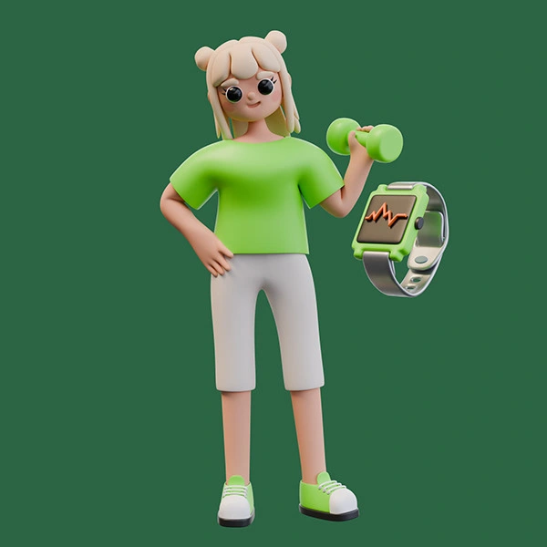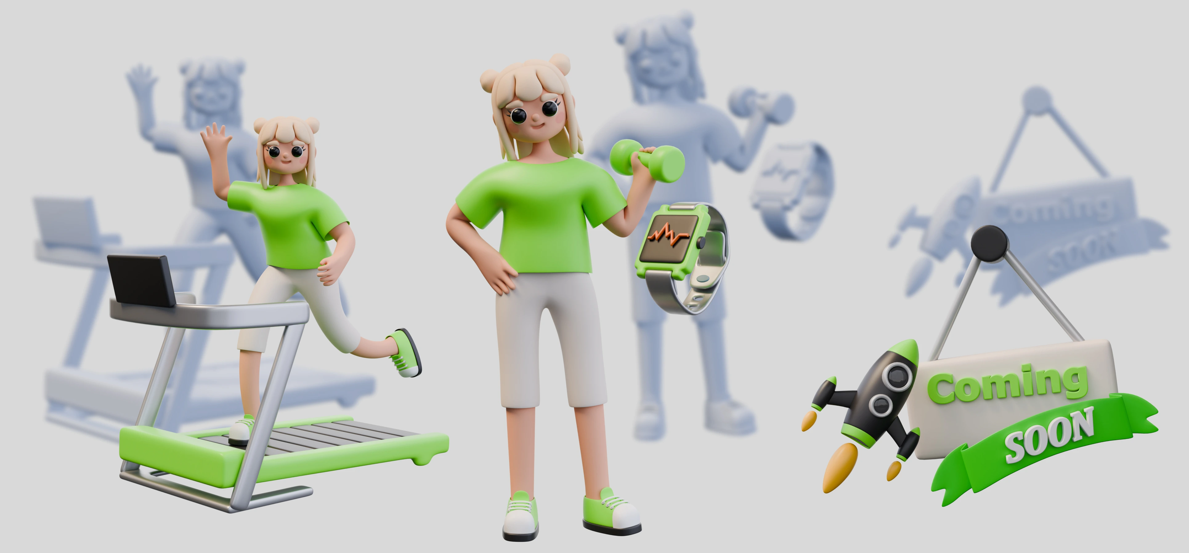 3D illustrations for a fictional fitness app — playful, modern visuals crafted to boost engagement through characters, UI mockups, and bold design.