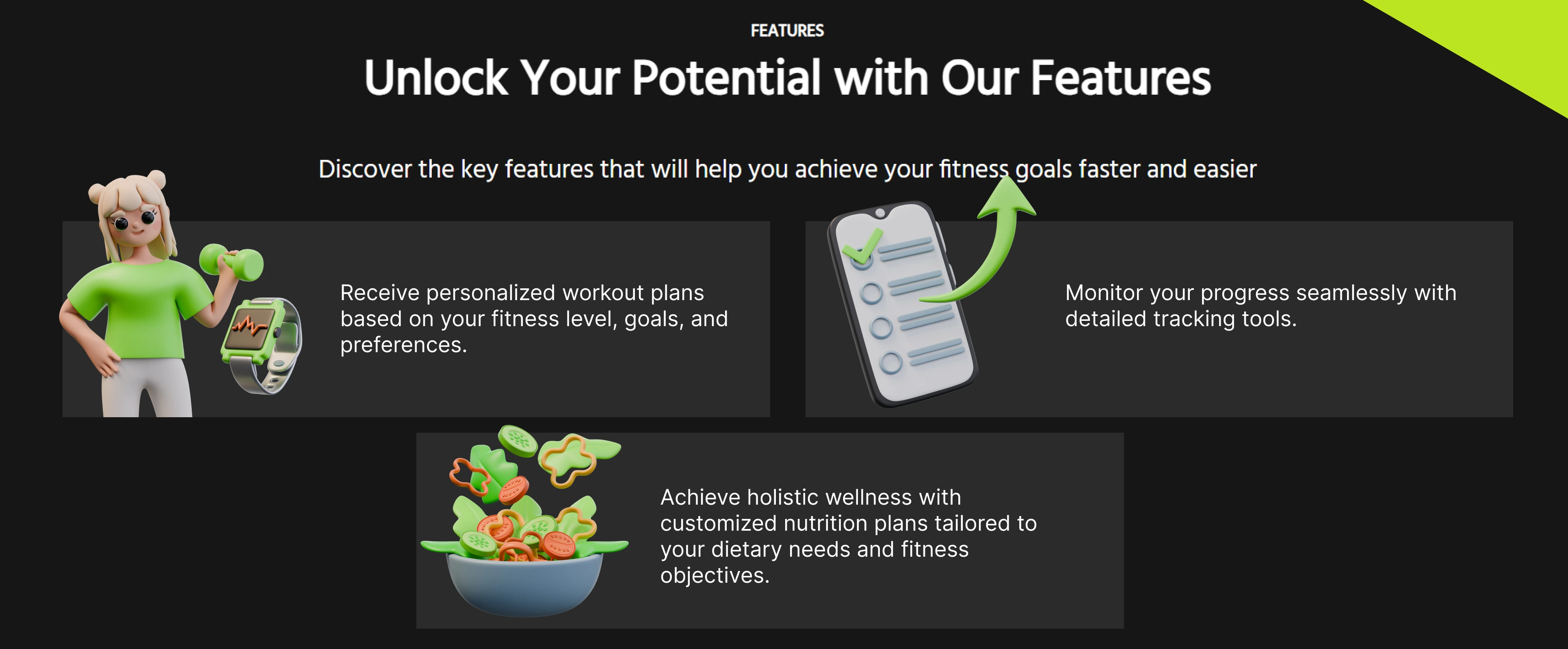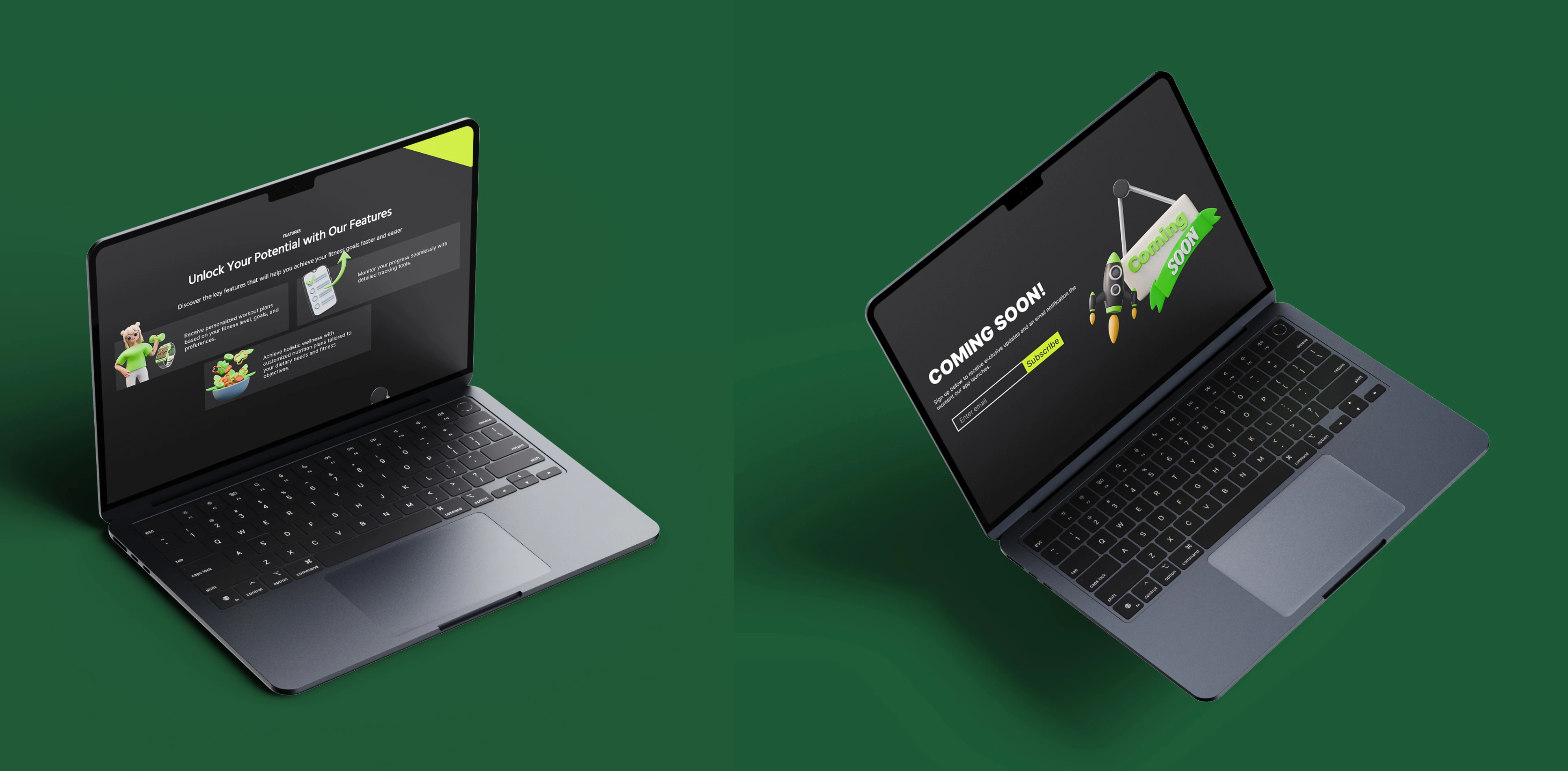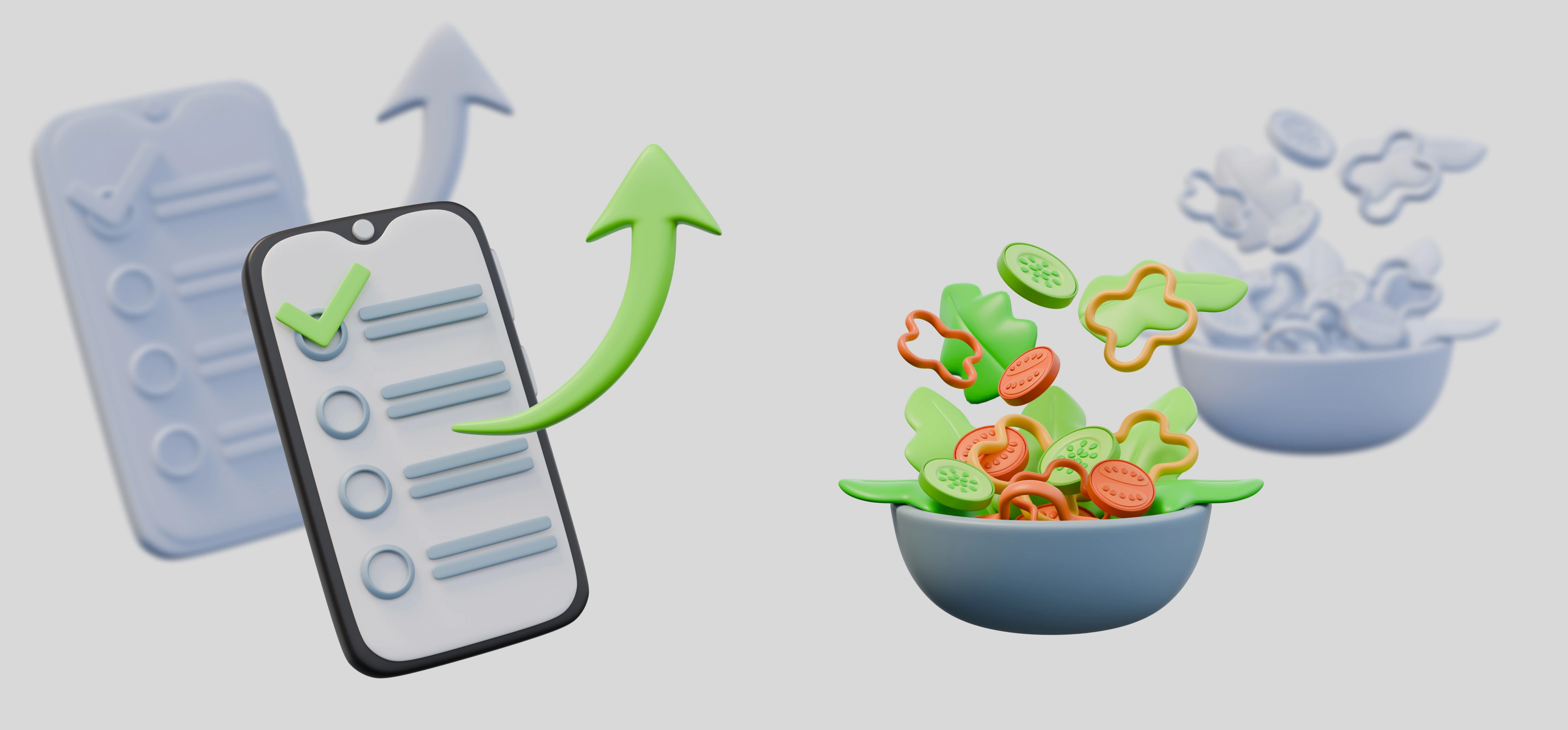3D illustrations for a fictional fitness app — playful, modern visuals crafted to boost engagement through characters, UI mockups, and bold design.