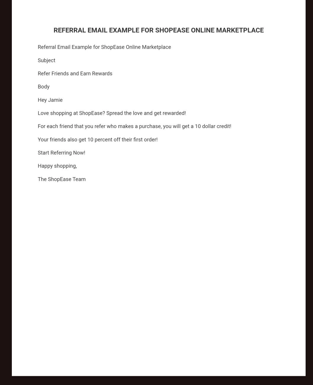 Created a referral email for ShopEase to boost customer engagement, offering $10 credits for referrals and 10% discounts for new customers