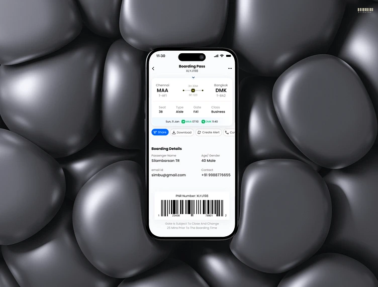 Realistic mobile UI mockup of a digital boarding pass with a clean layout, clear information hierarchy, and modern visuals on a sleek 3D background.