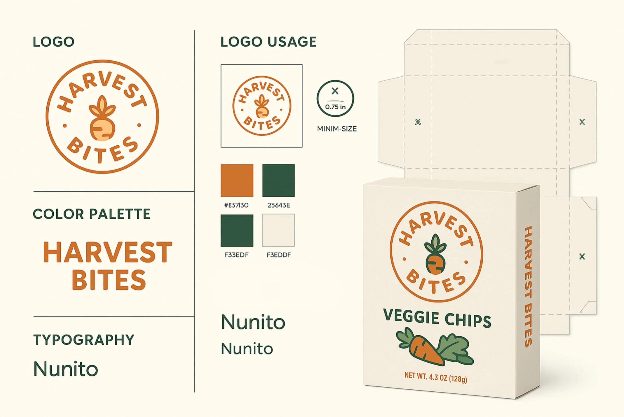 Developed a wholesome brand for Harvest Bites with bold logo, earthy palette, and packaging mockups showcasing natural, organic food identity.