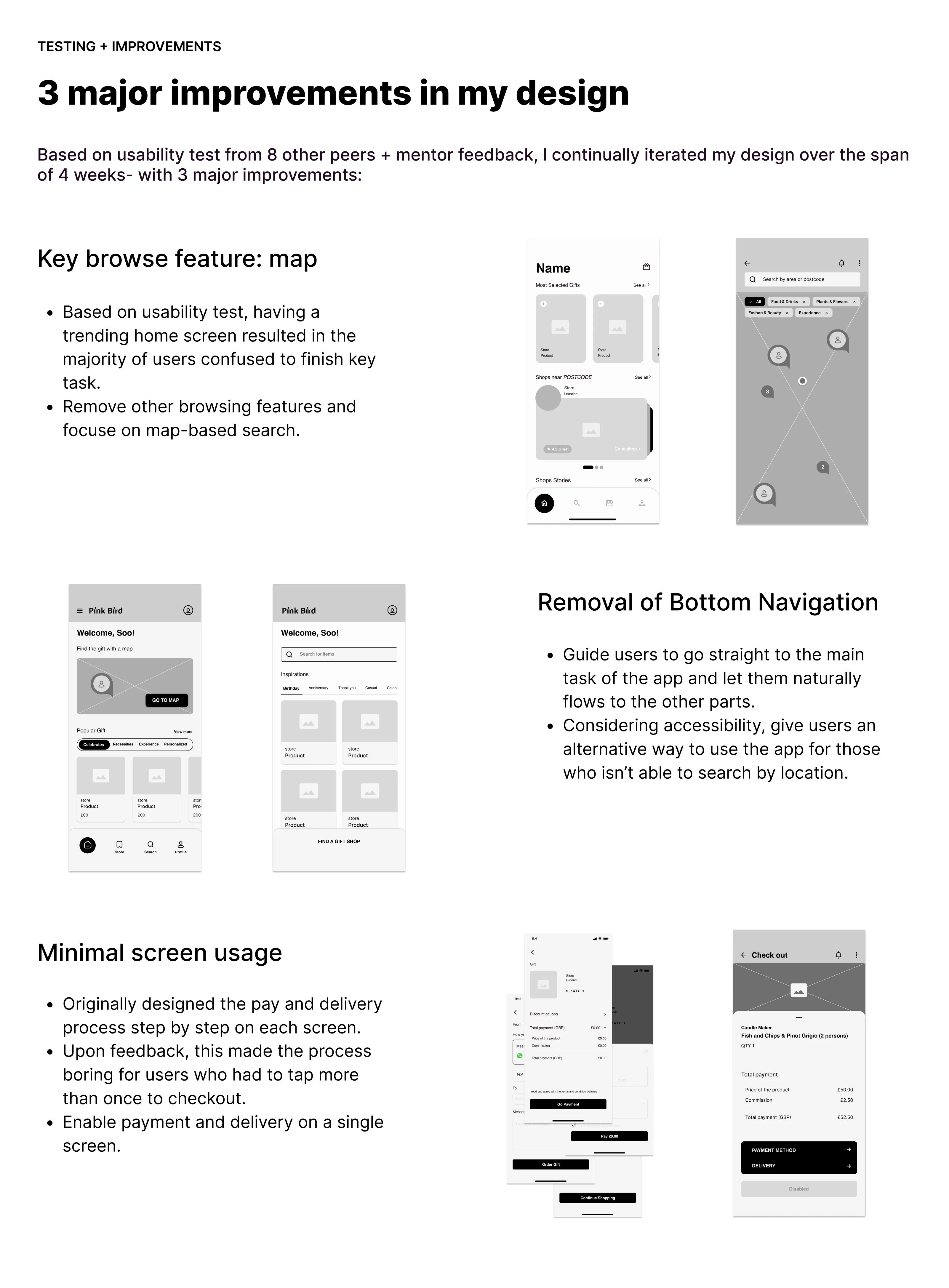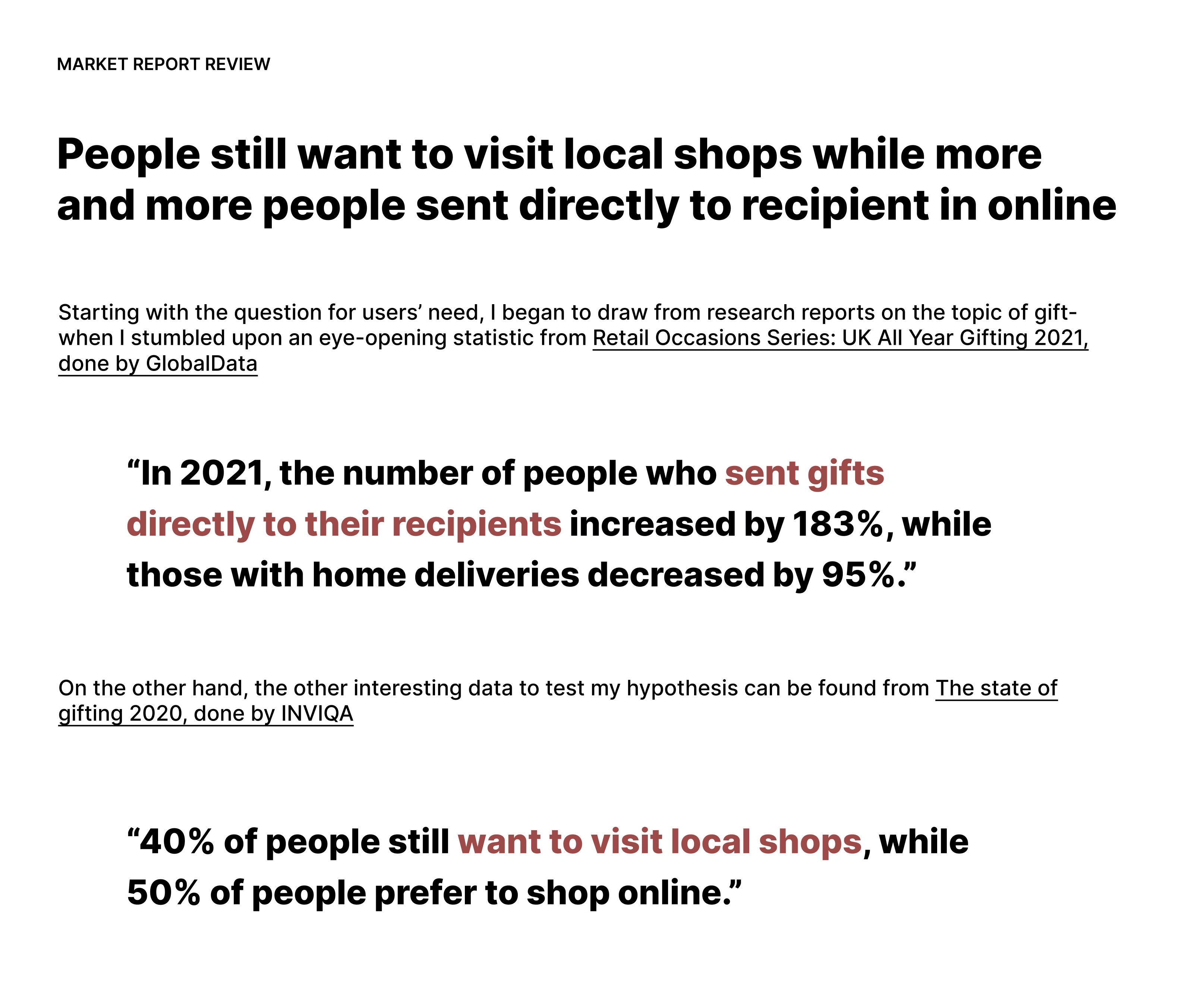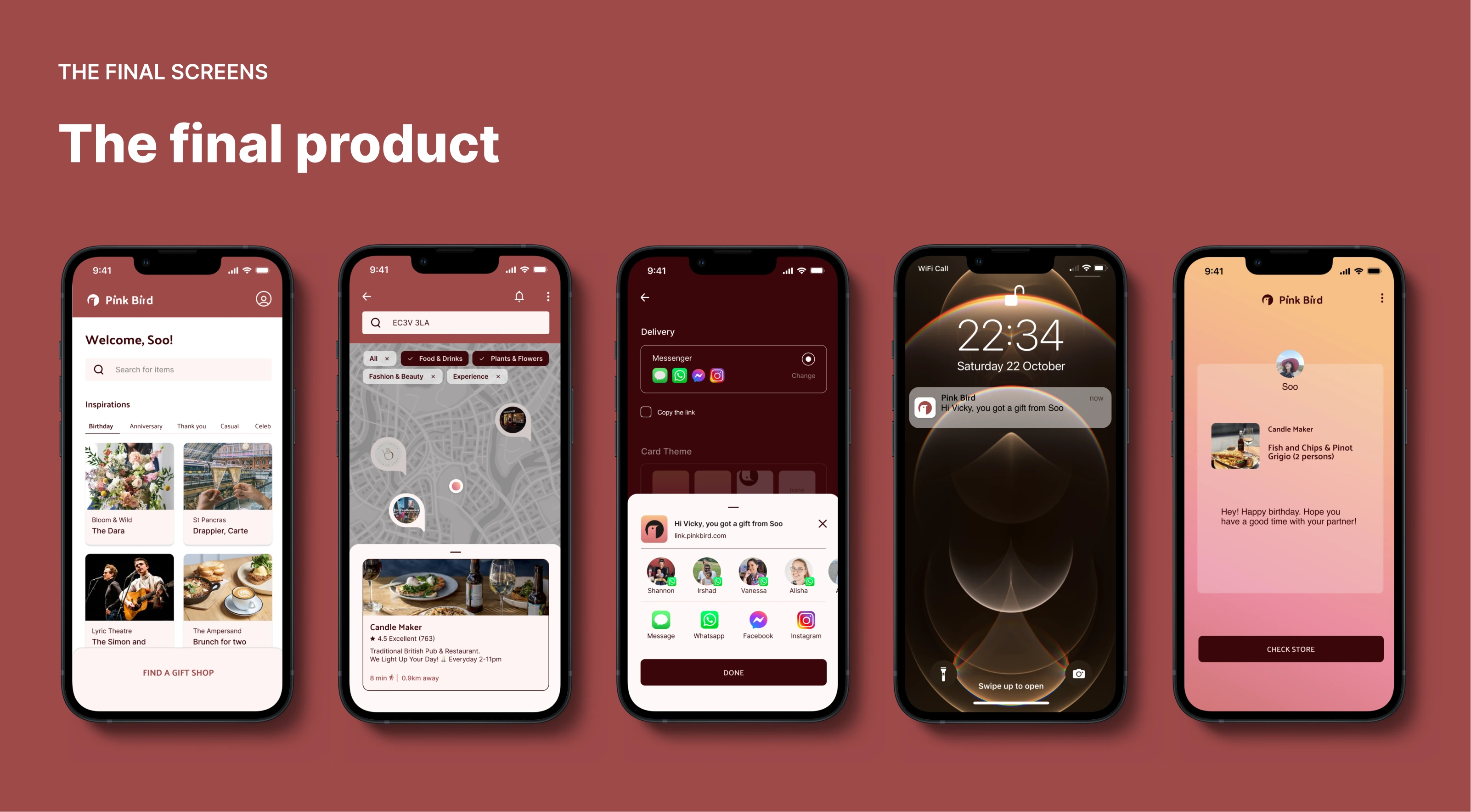 I designed Pink Bird app's UI/UX to ease gift selection struggles. Market research revealed 40% prefer local shops despite rising online delivery. Users face confusion from excessive online options and lack of local info.