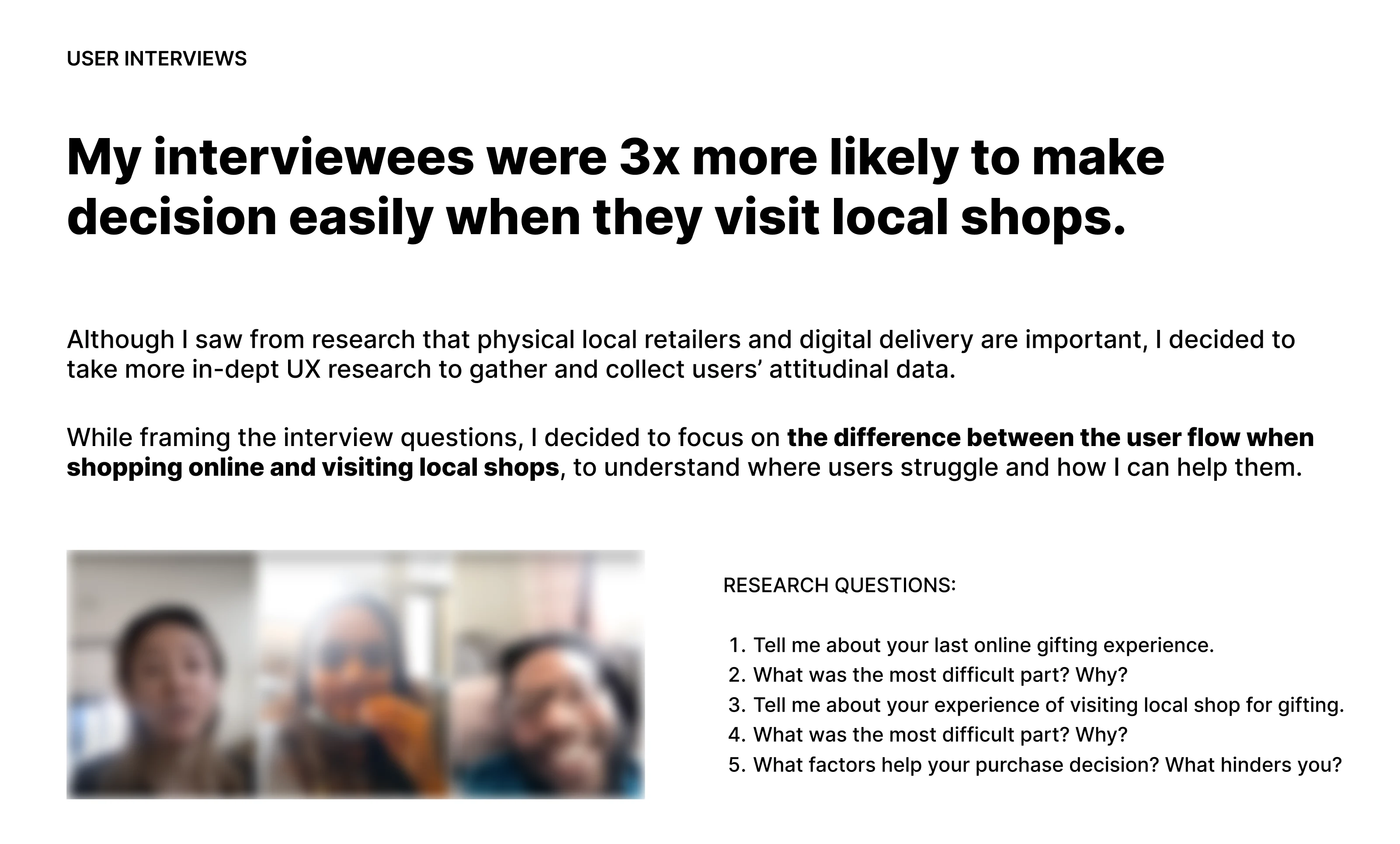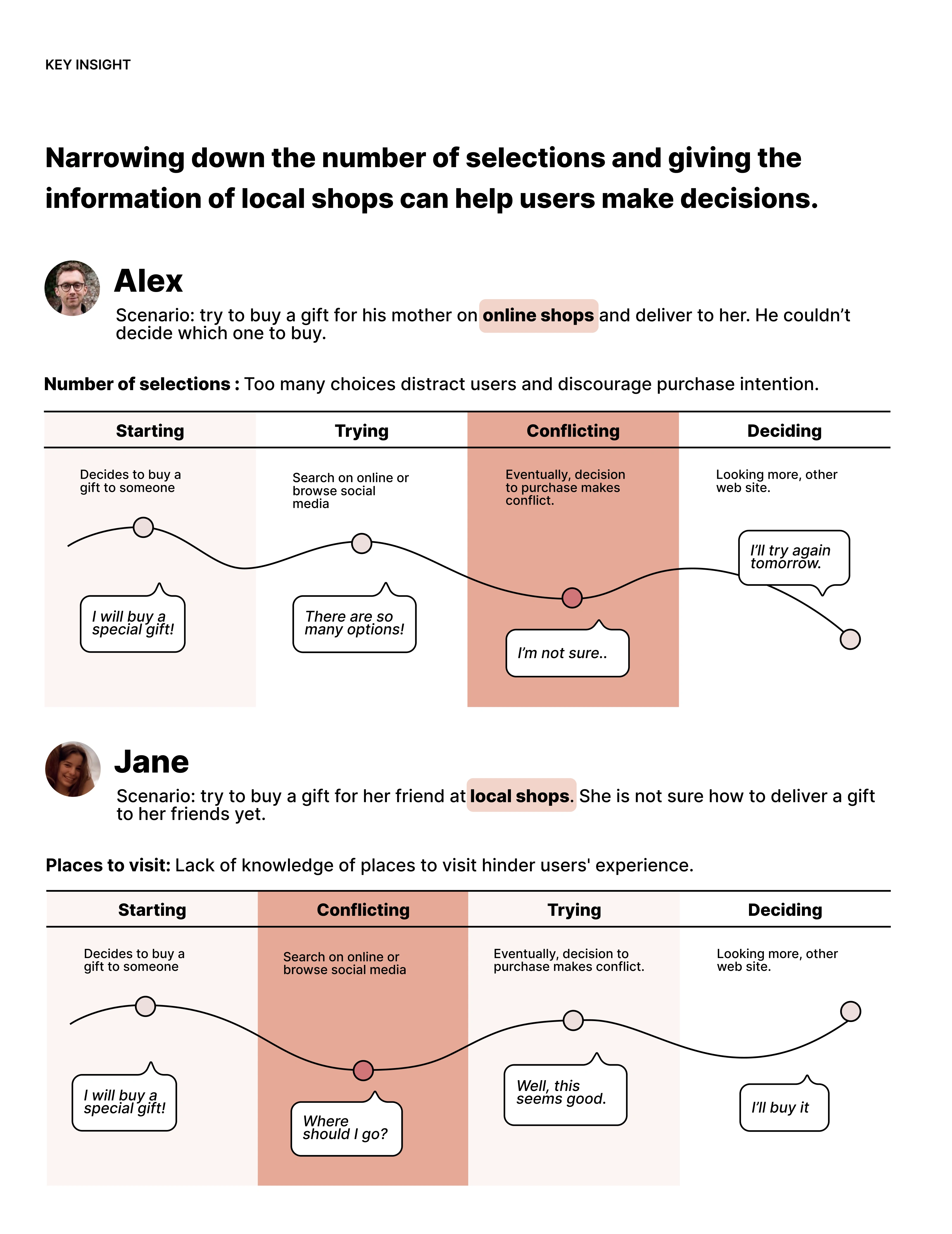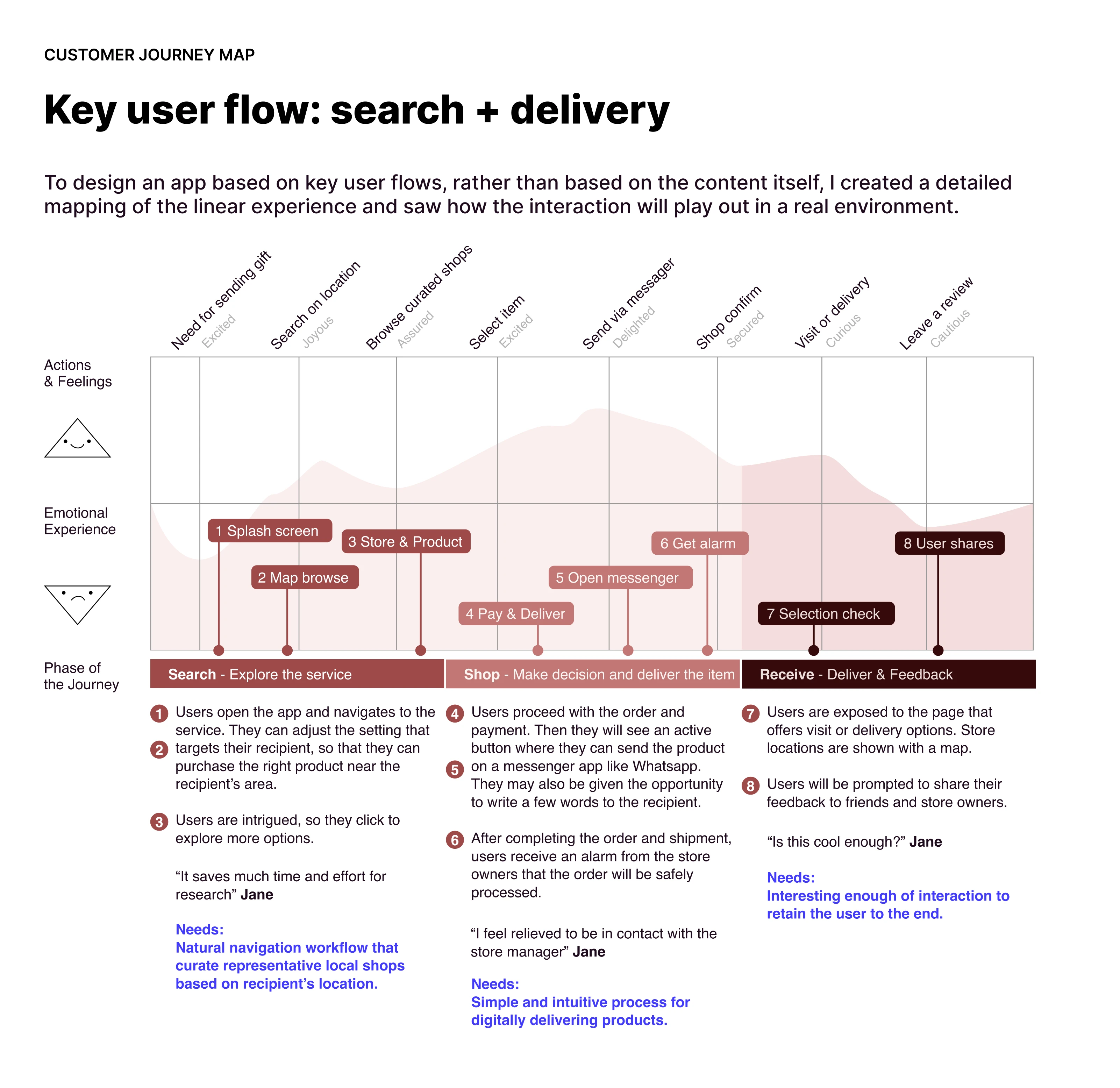 I designed Pink Bird app's UI/UX to ease gift selection struggles. Market research revealed 40% prefer local shops despite rising online delivery. Users face confusion from excessive online options and lack of local info.