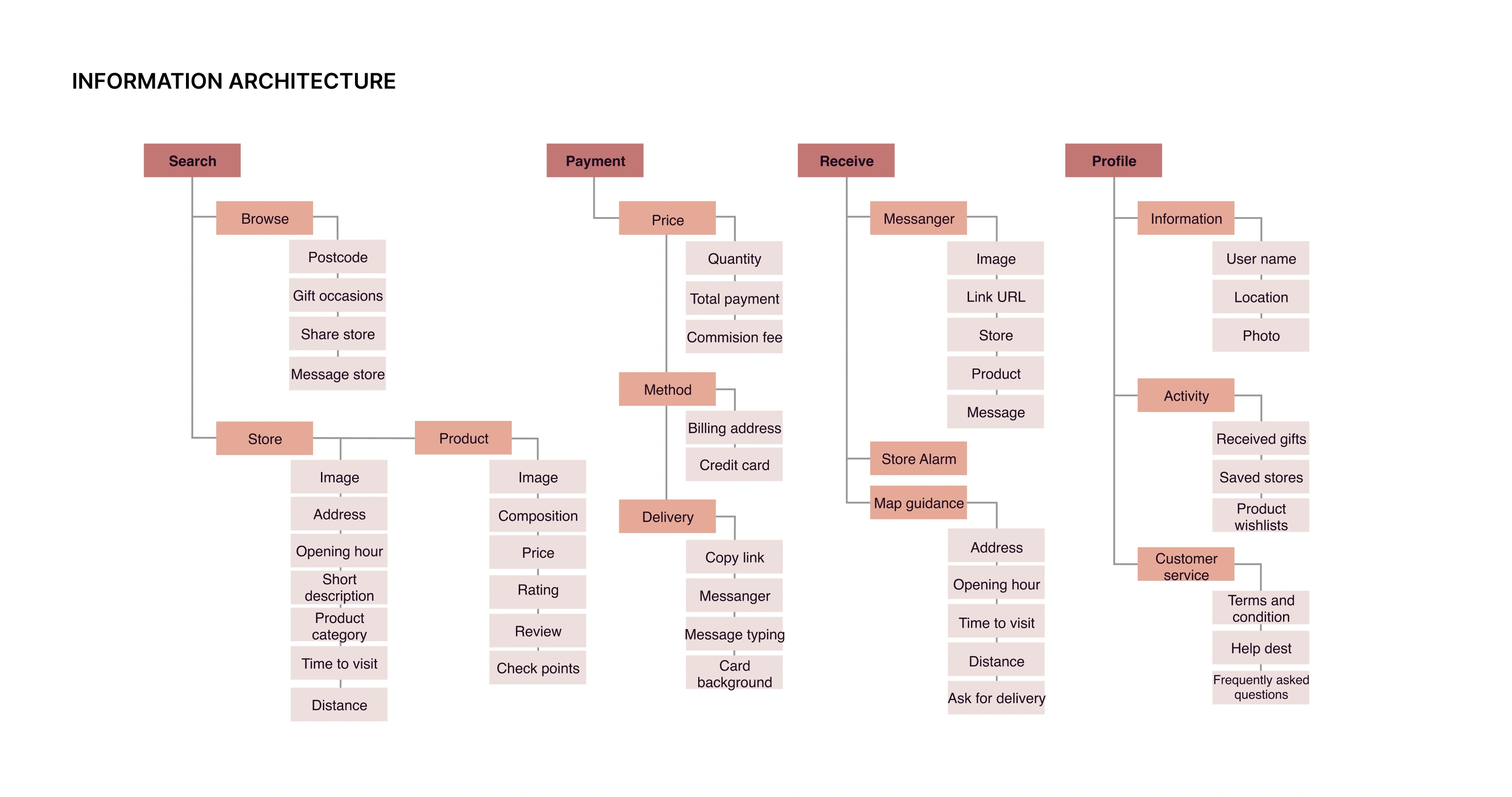 Analyzing competitors, I addressed search and product gaps, creating intuitive info structures for easy navigation in search, payment, receipt, and profile flows.