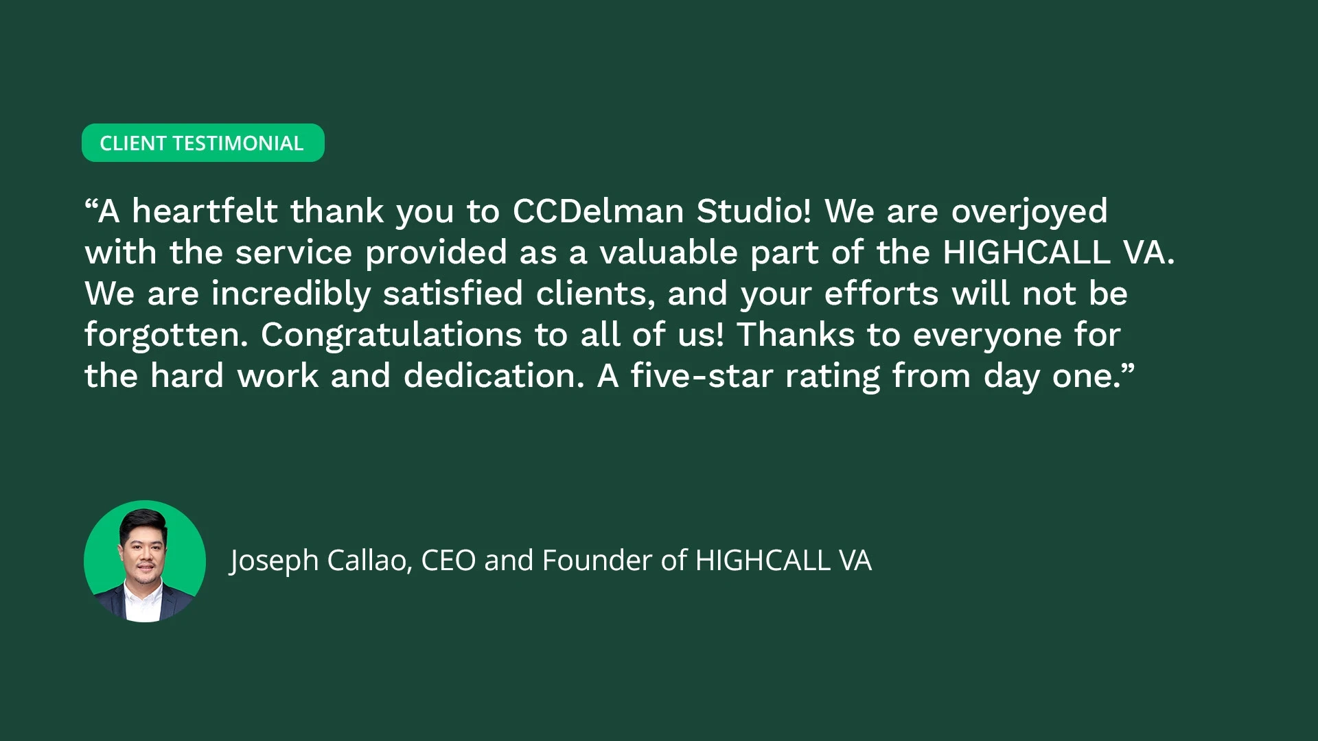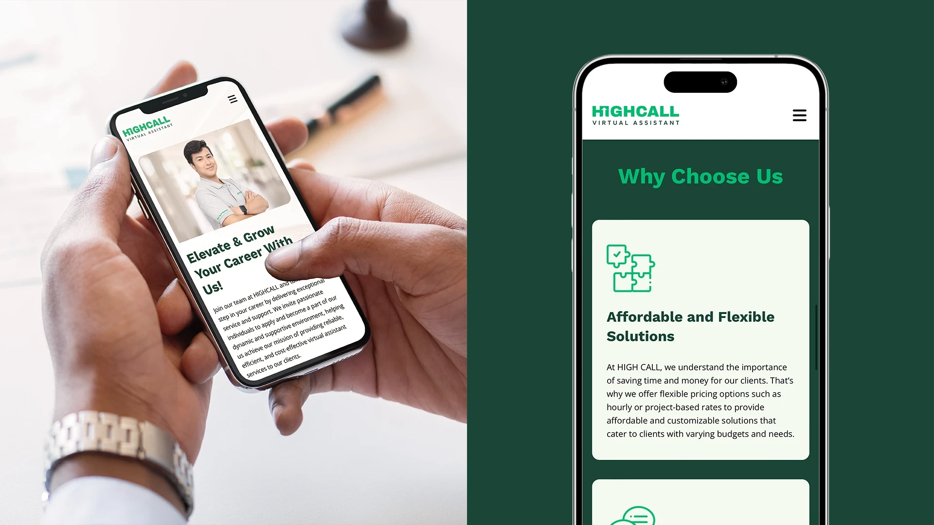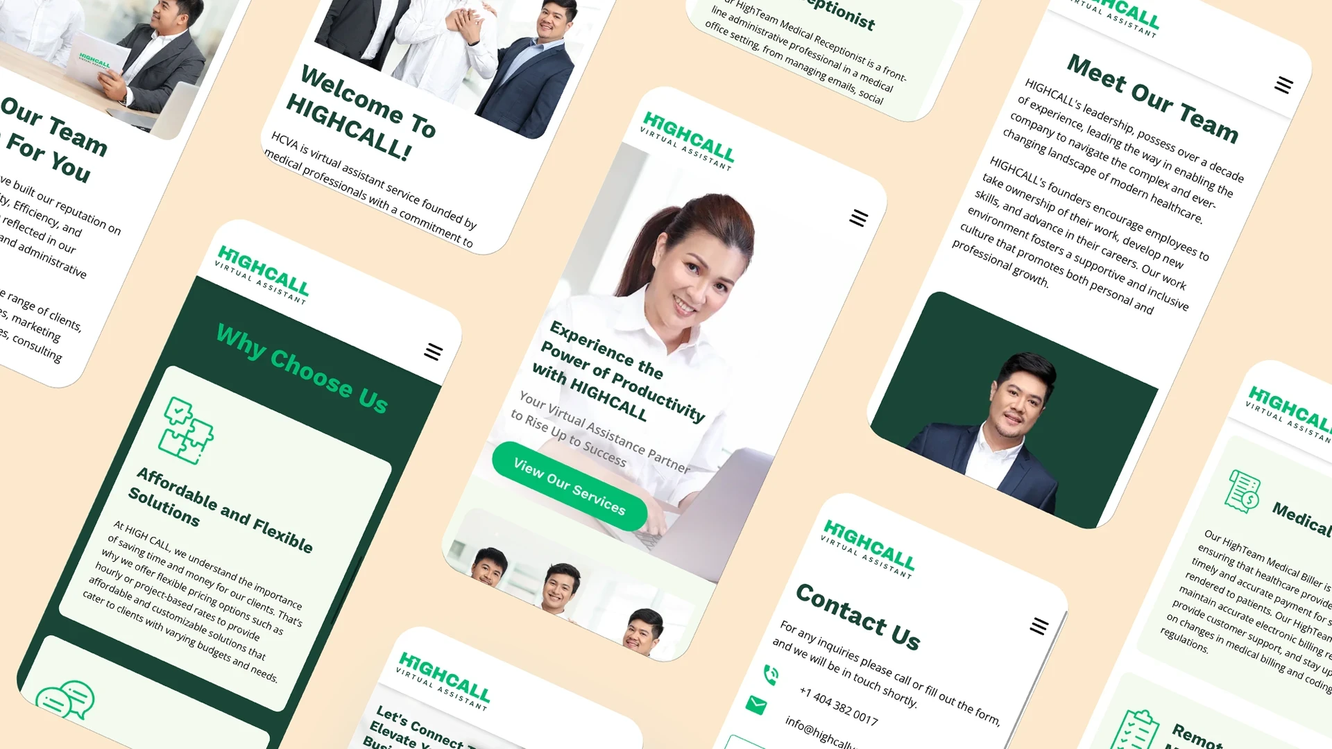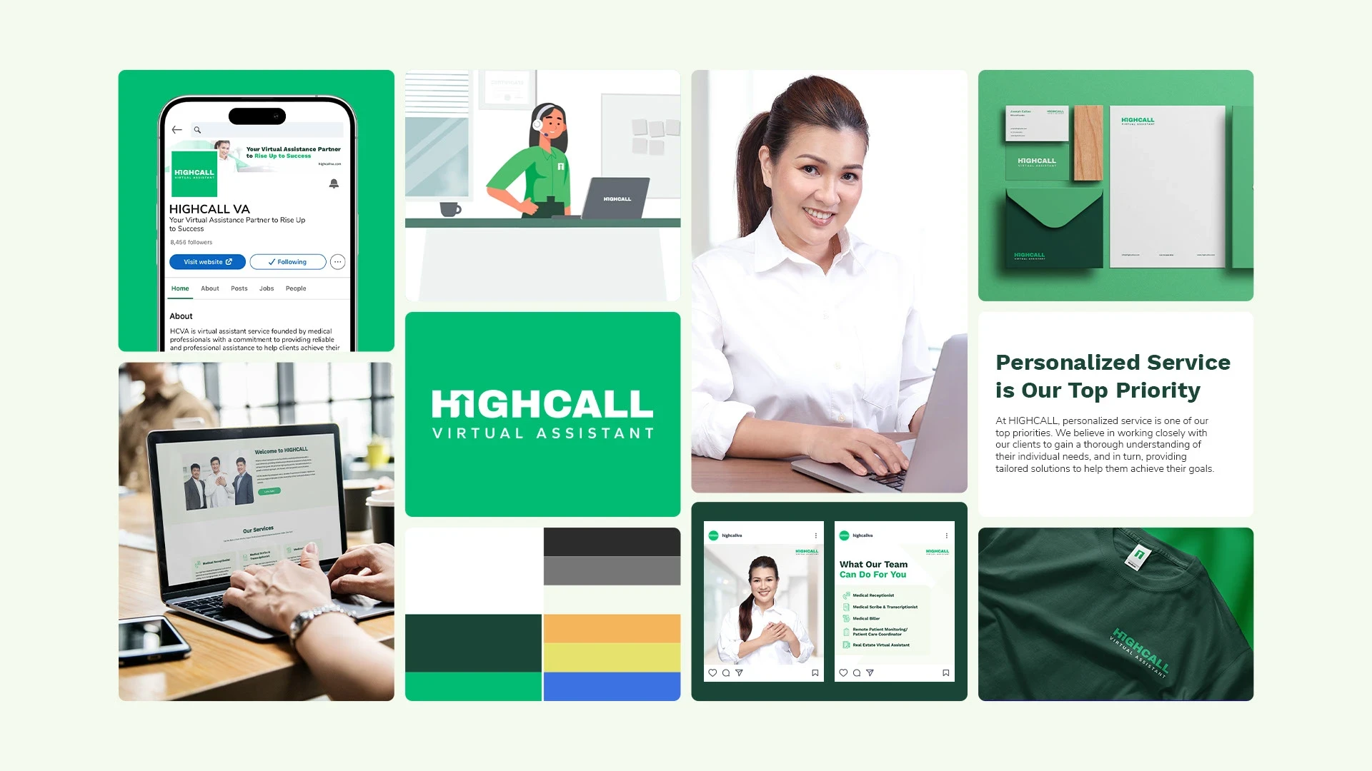 With our team at CCDELMAN Studio, our approach was to create branding for HIGHCALL Virtual Assistant, aligning it with its commitment to reliability, growth, and transparent communication. Starting from scratch, we crafted a brand name, 'HIGHCALL,' and a visual identity that embodies modernity, professionalism, and approachability—perfectly aligned with their core values. Furthermore, we extended our solution to include a corporate shoot, the development of their website, a strategic presence on social media platforms, and the creation of a company video, laying the foundation for HCVA's expansion and continued success.