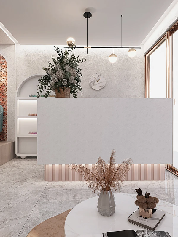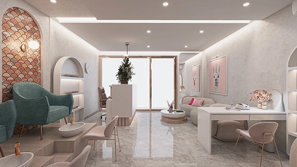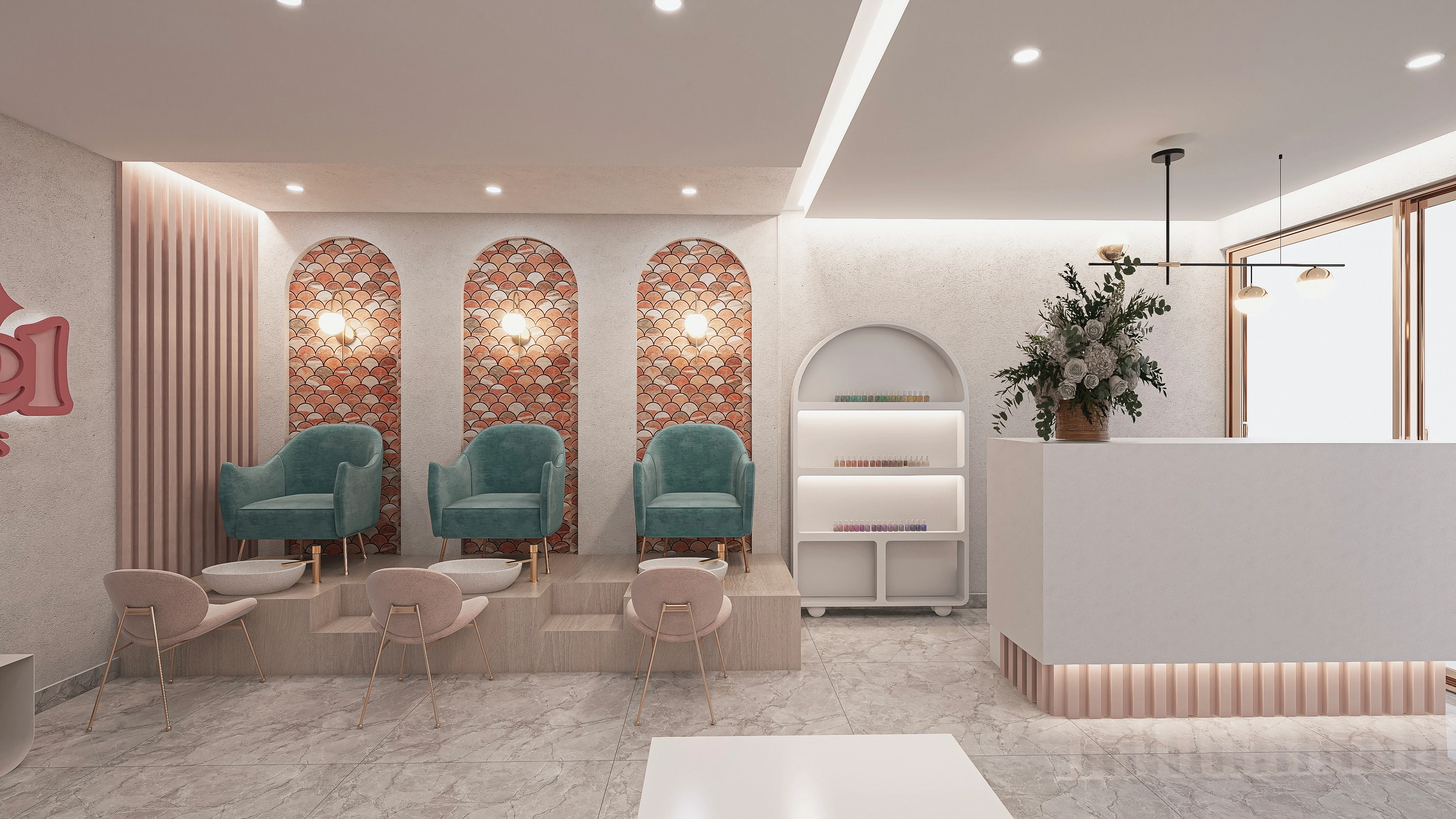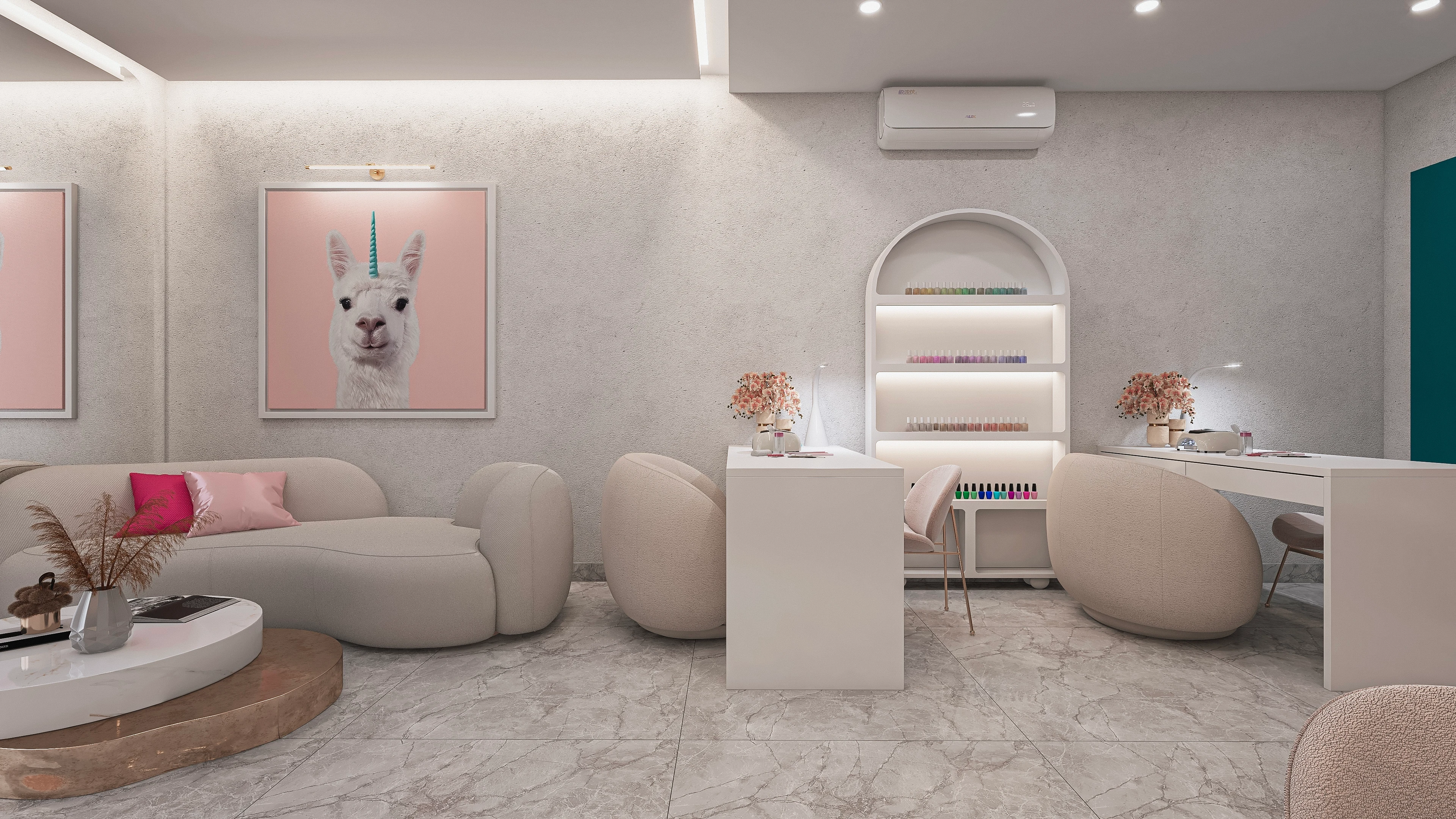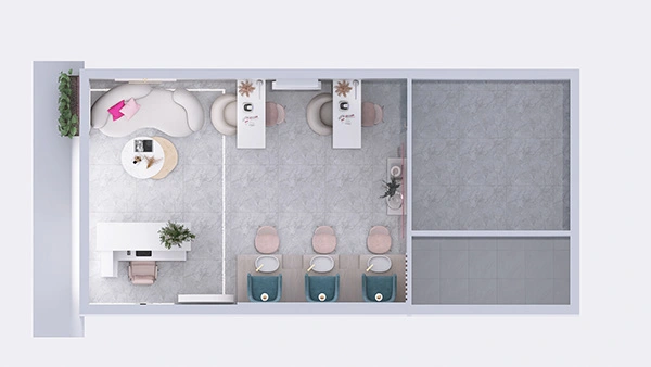 Su marca se basa en tres palabras fundamentales, ESTÉTICO, DIVERTIDO y BELLEZA. Por esto decidimos utilizar colores suaves y un tono fuerte que fuese el protagonista. Texturas de mucha presencia y a la vez super limpia y delicadas. La ubicación de los puestos fue basado en su necesidad para que sea funcional.