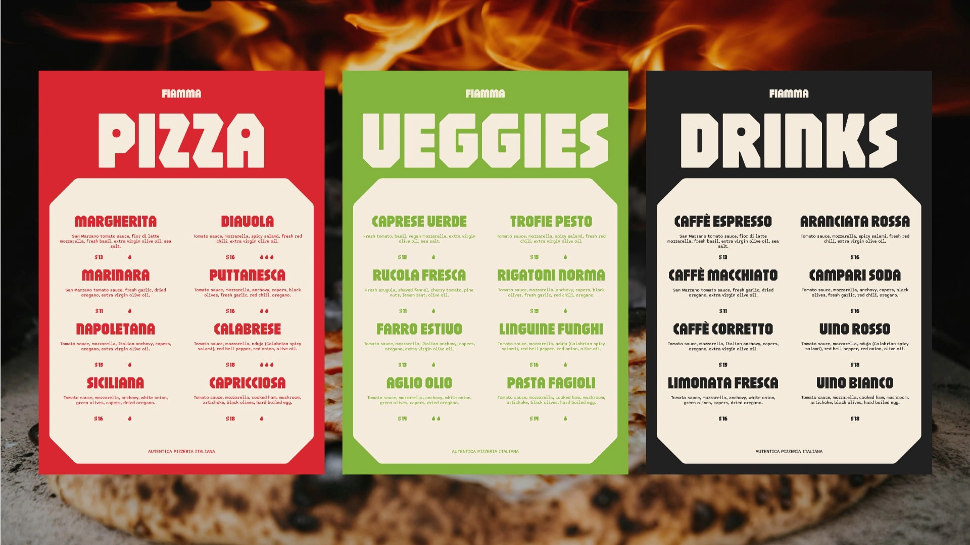 The design system crafted for Fiamma is strategically crafted to stand out, anchored by a punchy color palette drawn from the ingredients of pizza itself, paired with representative patterns that speak to the brand's roots. Taken as a whole, the personality that emerges is one of simplicity, warmth, and an open, welcoming spirit.