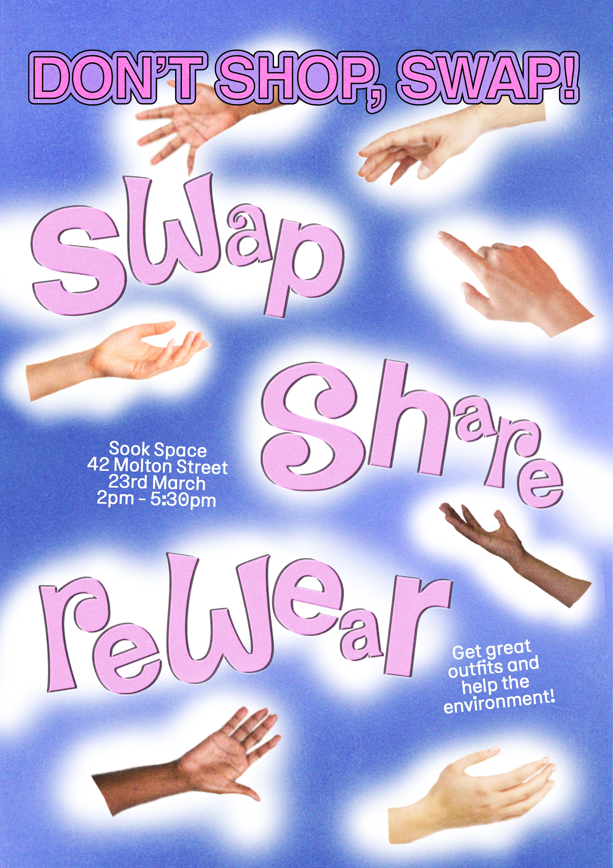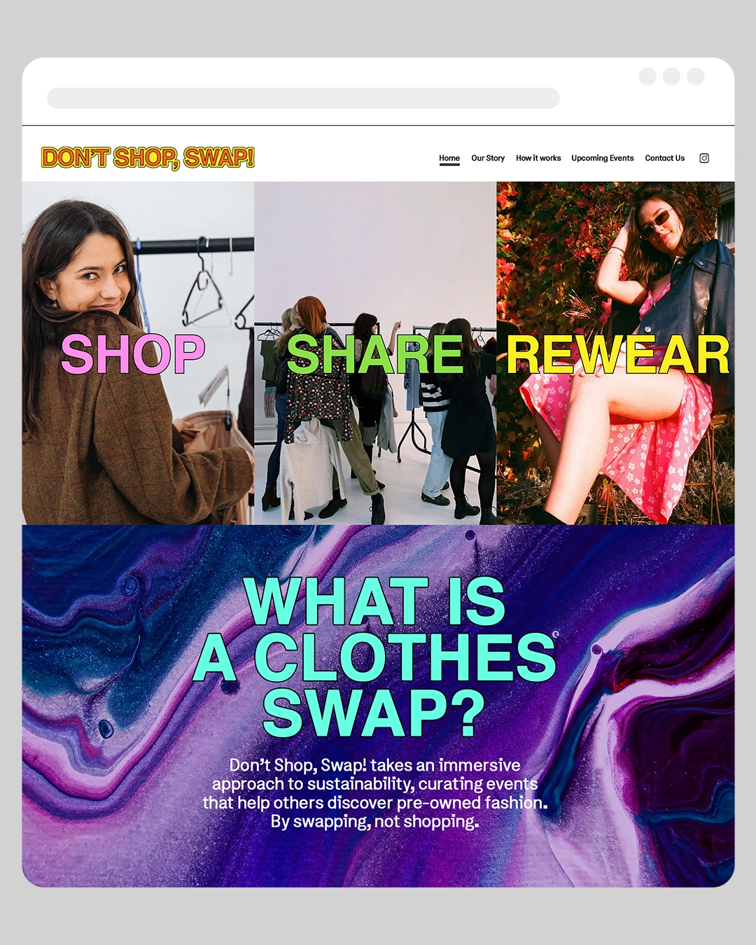 Brand redesign for clothes swap business Don't Shop Swap, including new logo, brand guidelines, image guidelines, social post templates, website design and event posts.