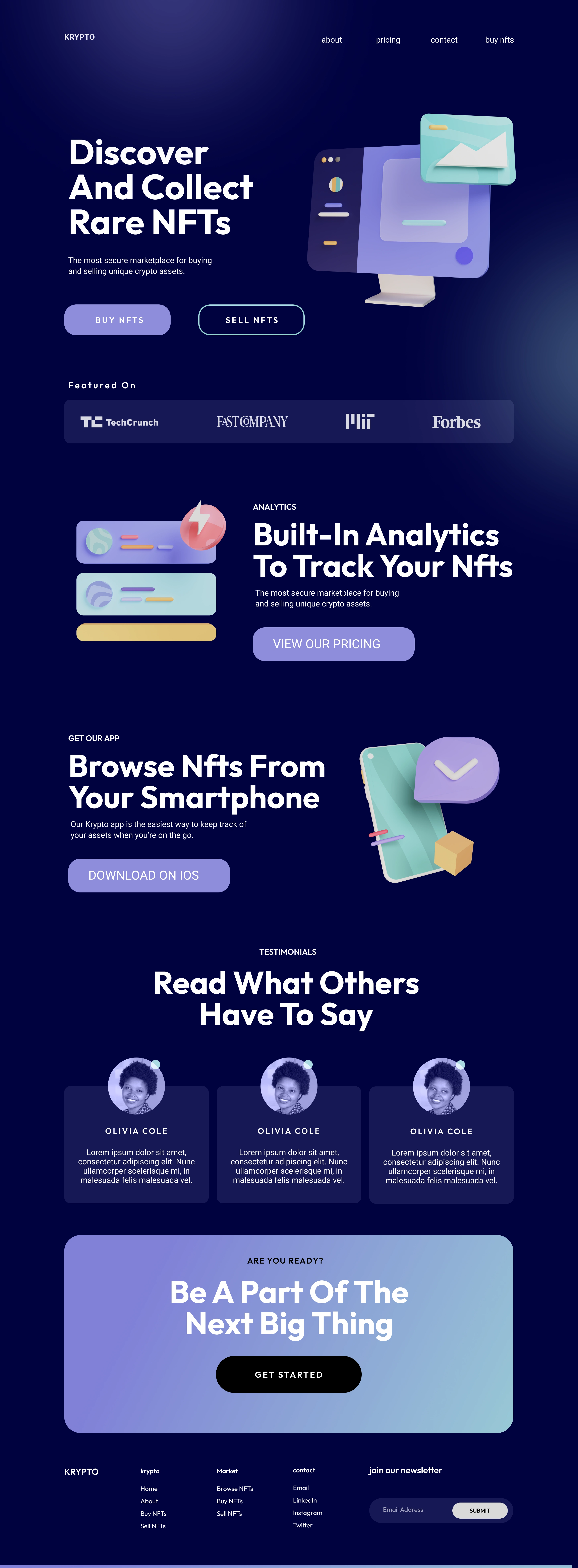 I have designed a mock landing page for KRYPTO, various sections and footer