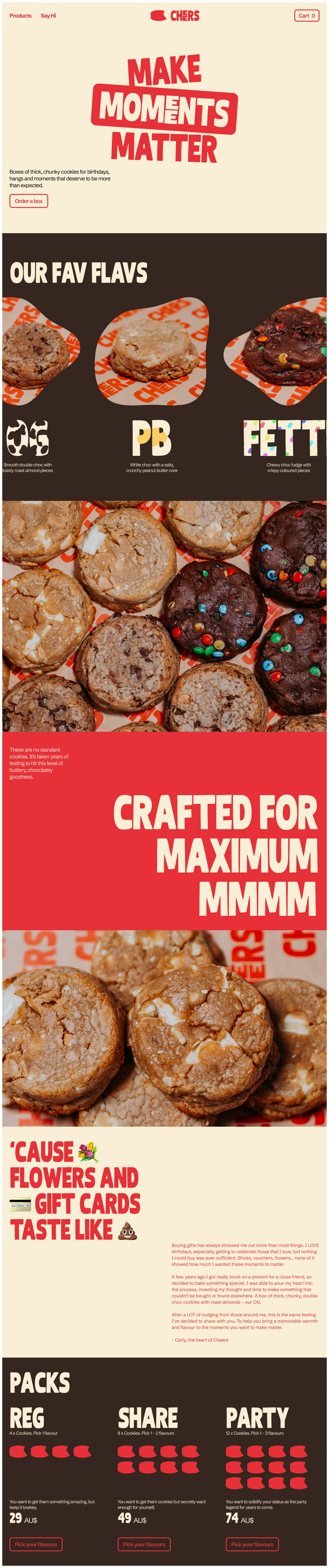 Created the visual identity of Cheers cookies, pulling it together in a website that emphasised the density and taste of the products.