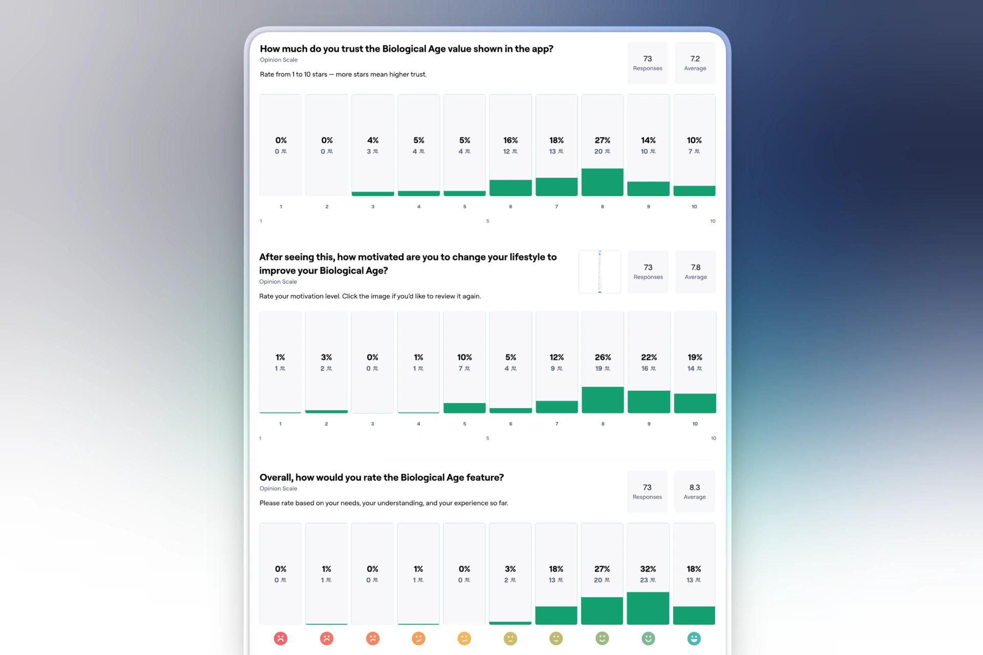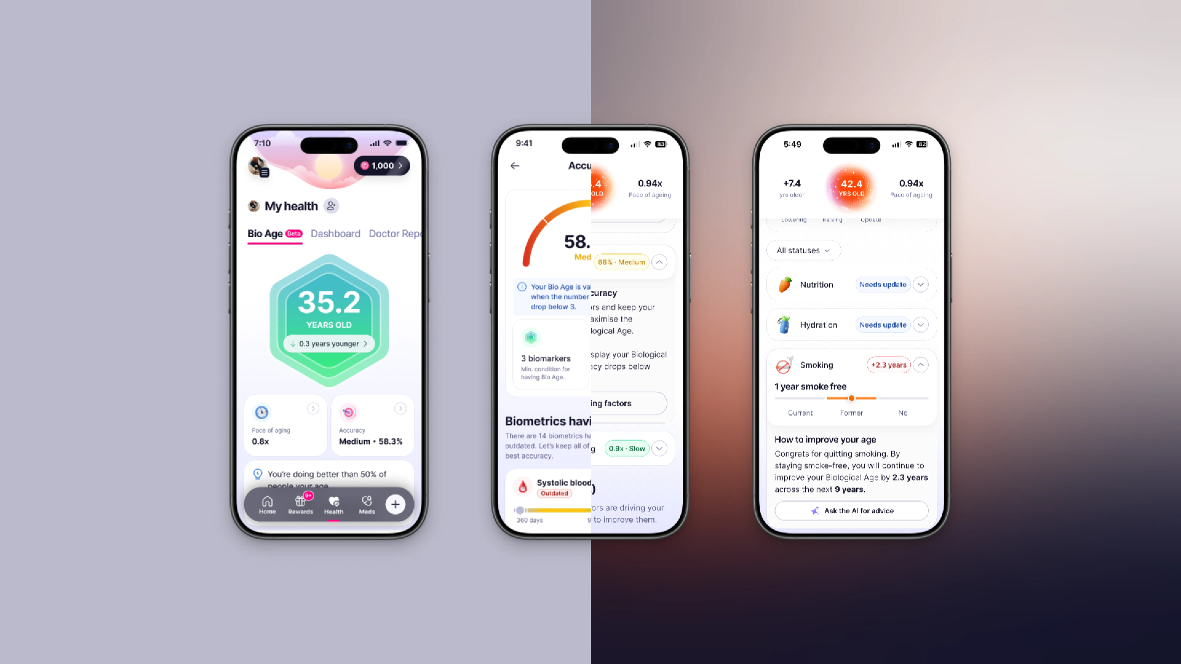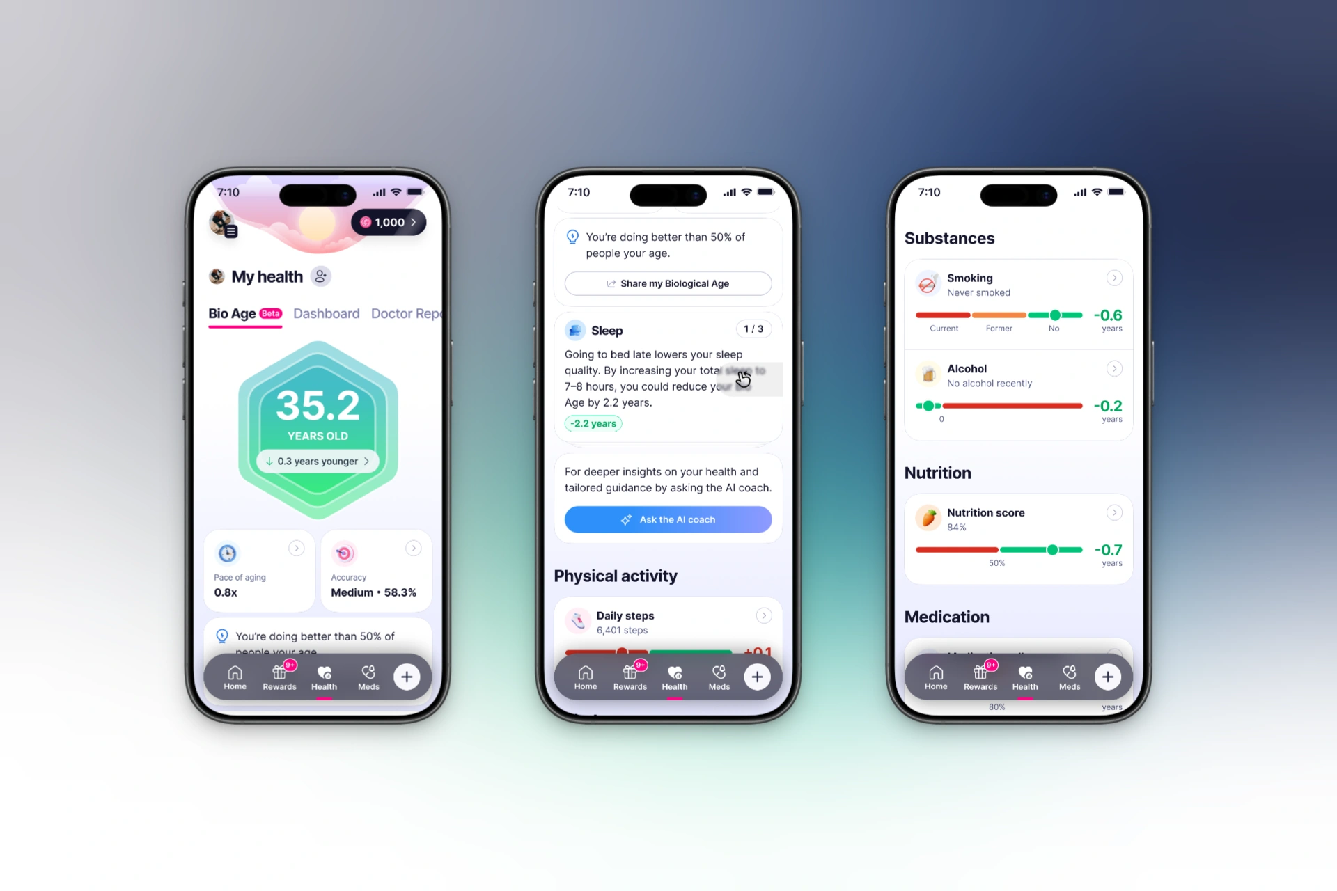 Biological Age reframes Elfie's existing Health Score as something more intuitive: not an abstract percentage, but an estimate of how old your body actually is based on how you live. The model was built on NHANES data with linked long-term mortality outcomes and integrates up to 14 health factors — physical activity, sleep, BMI, smoking, alcohol, nutrition, medication, blood pressure, and more — derived from Cox proportional hazards models.