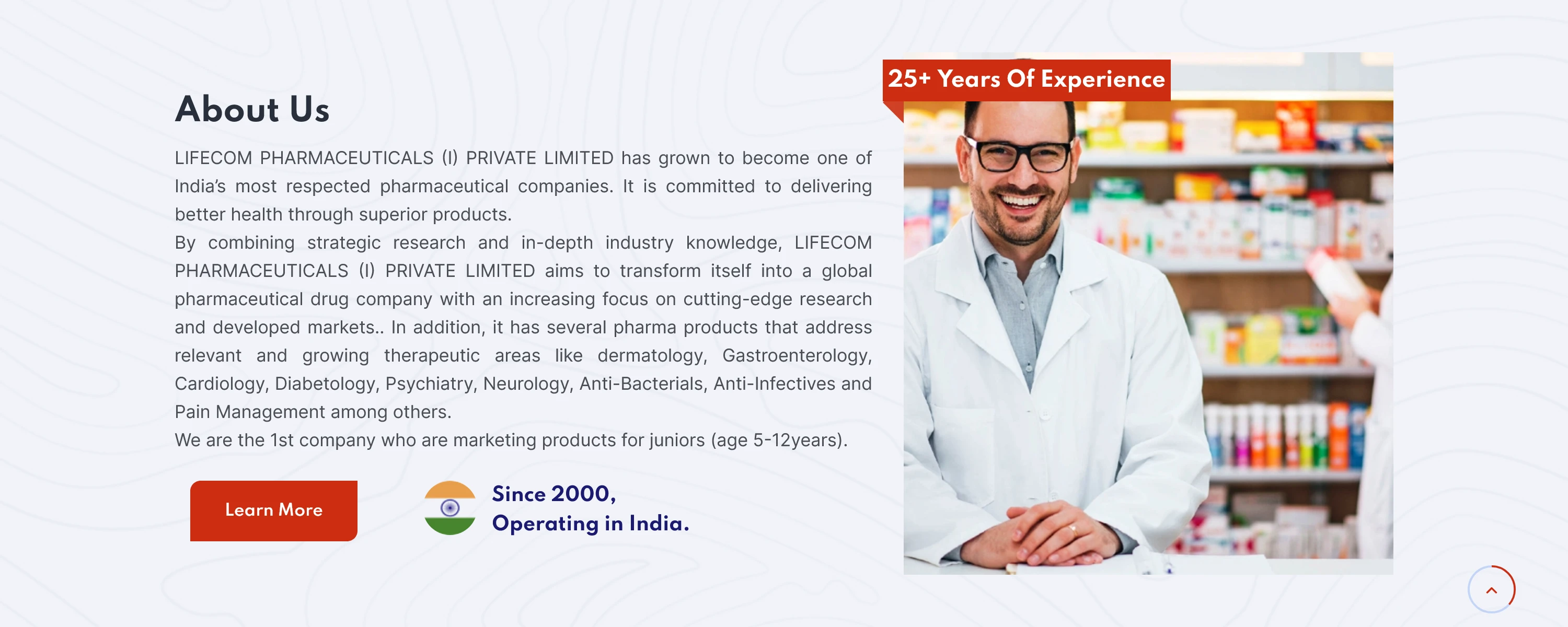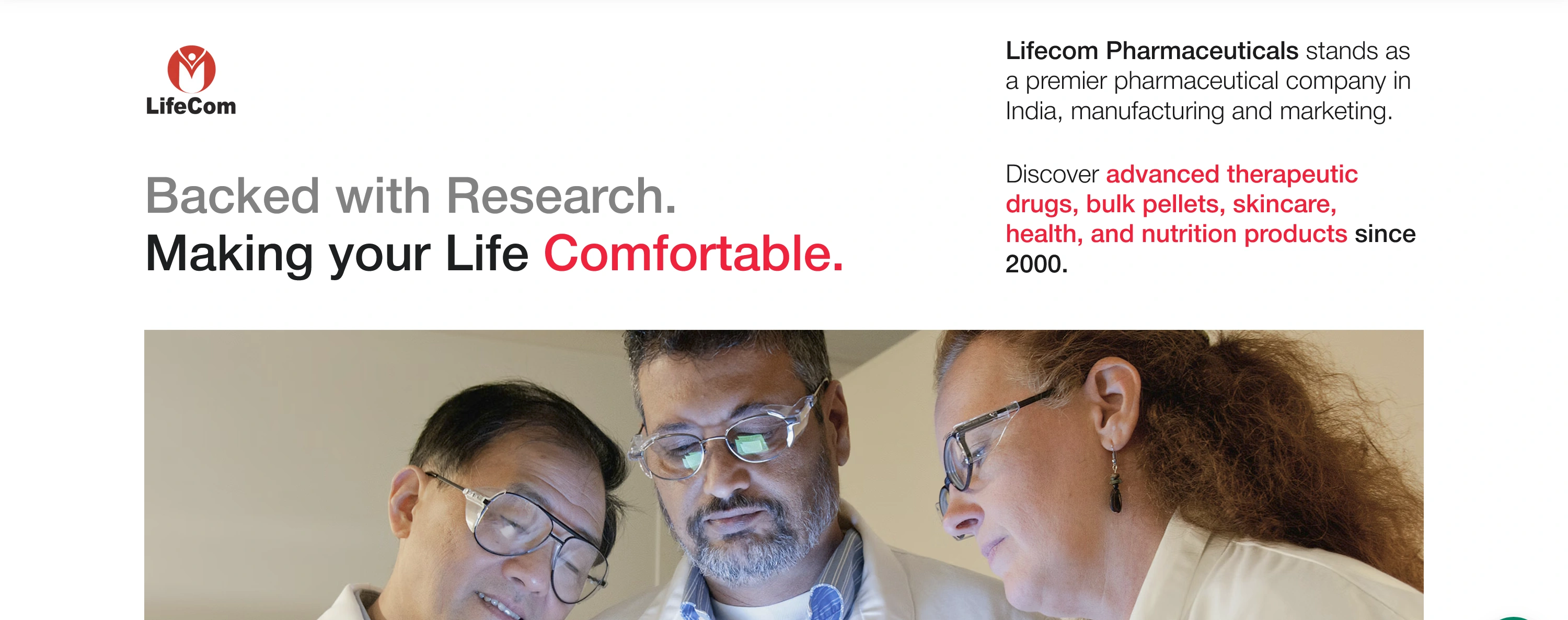Lifecom Pharma is a premier pharmaceutical company that stands among the most respected companies in India, manufacturing and marketing advanced therapeutic drugs, bulk pellets, skincare, health, and nutrition products since 2000.