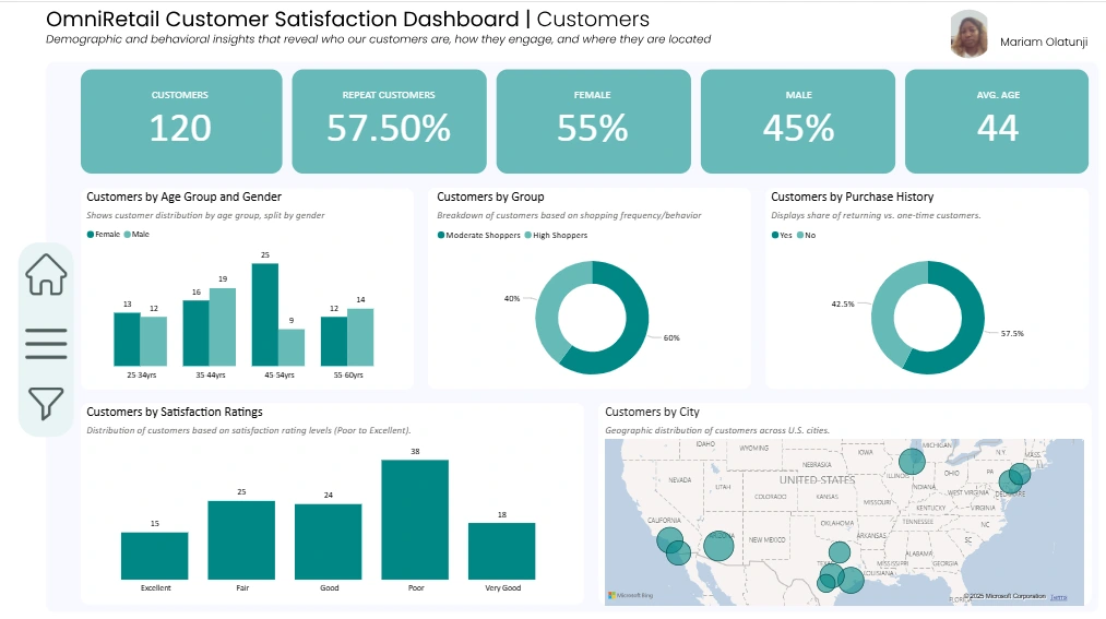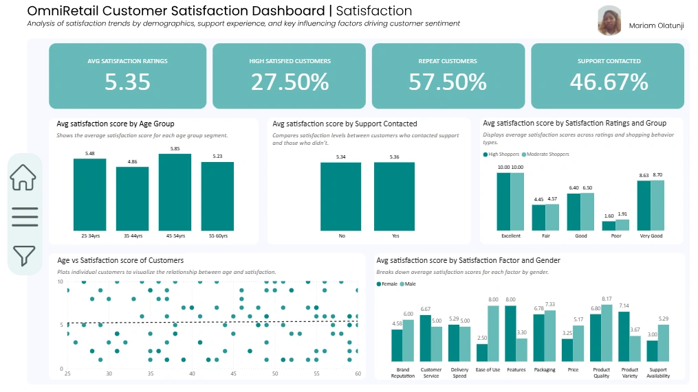 Developed a comprehensive customer satisfaction analysis for OmniRetail, a U.S.-based electronics and smart home retailer, examining 120 customers across demographics, satisfaction factors, and loyalty patterns. This analysis helped identify key drivers of customer satisfaction and provided strategic recommendations to improve retention and engagement. The project earned a Top 5 placement in the Onyx Data Challenge July 2025.