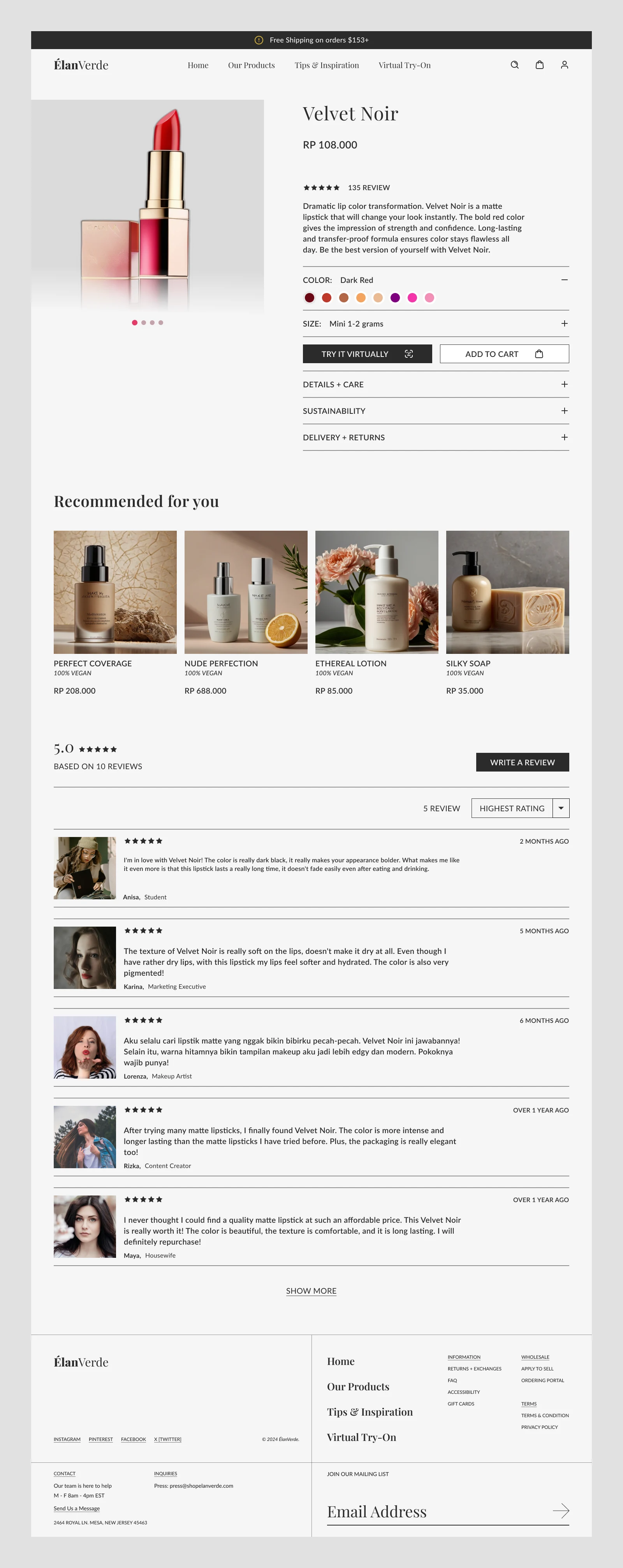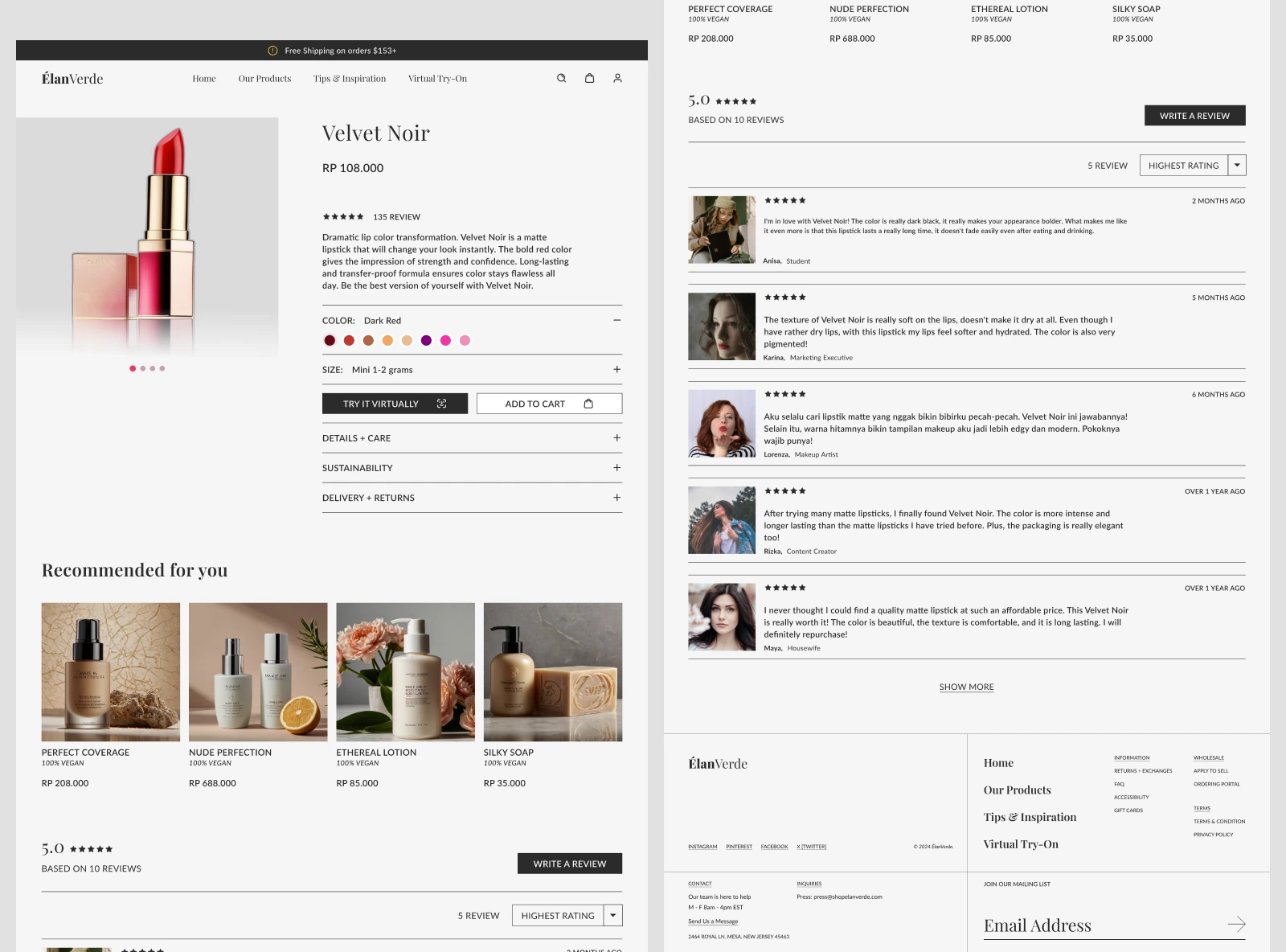 Detail Product Page, Introducing ÉlanVerde as a leader in luxury eco-friendly cosmetics. & Building interactivity through VR/AR features and live simulations.